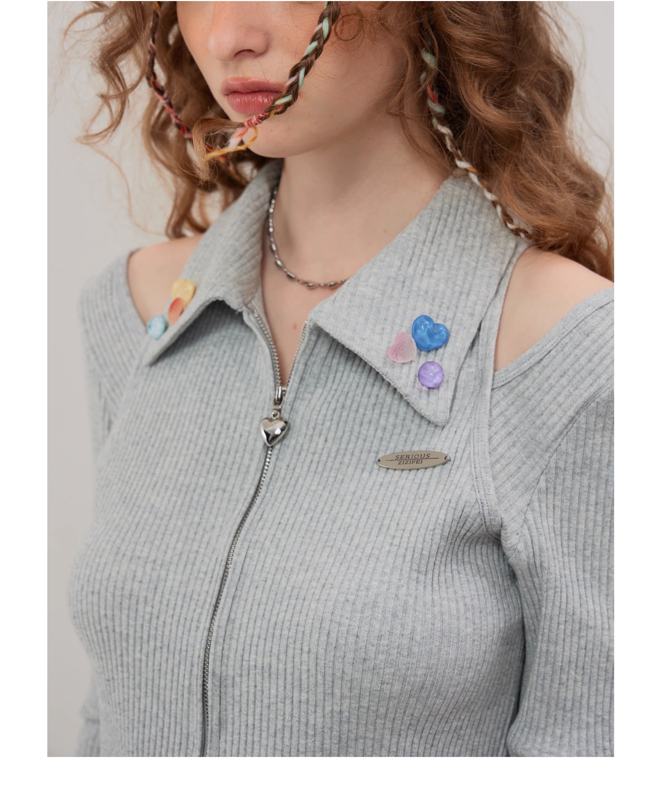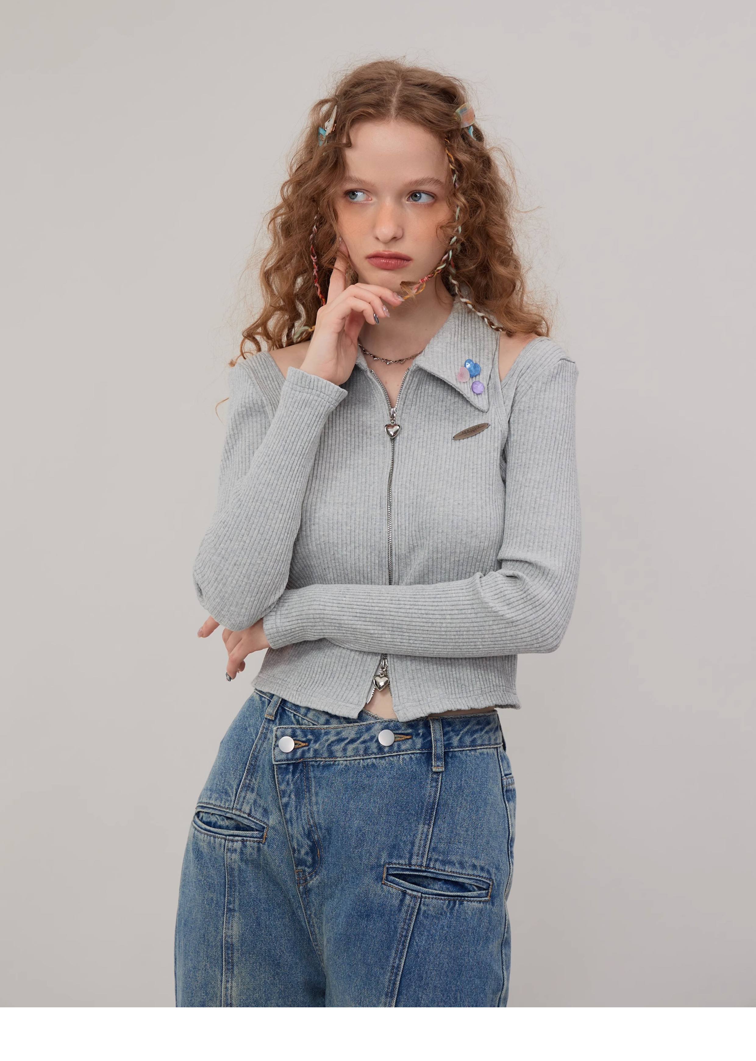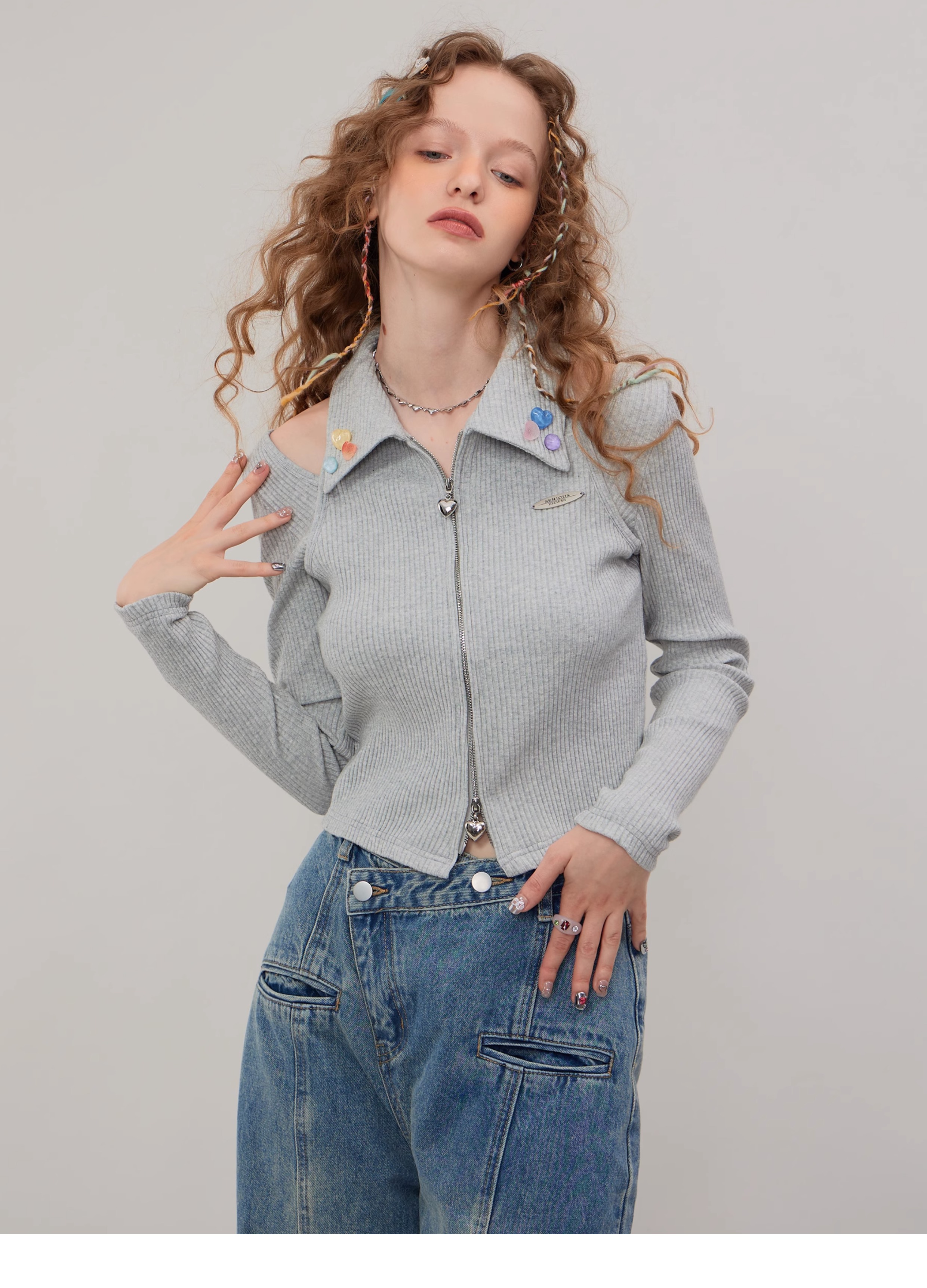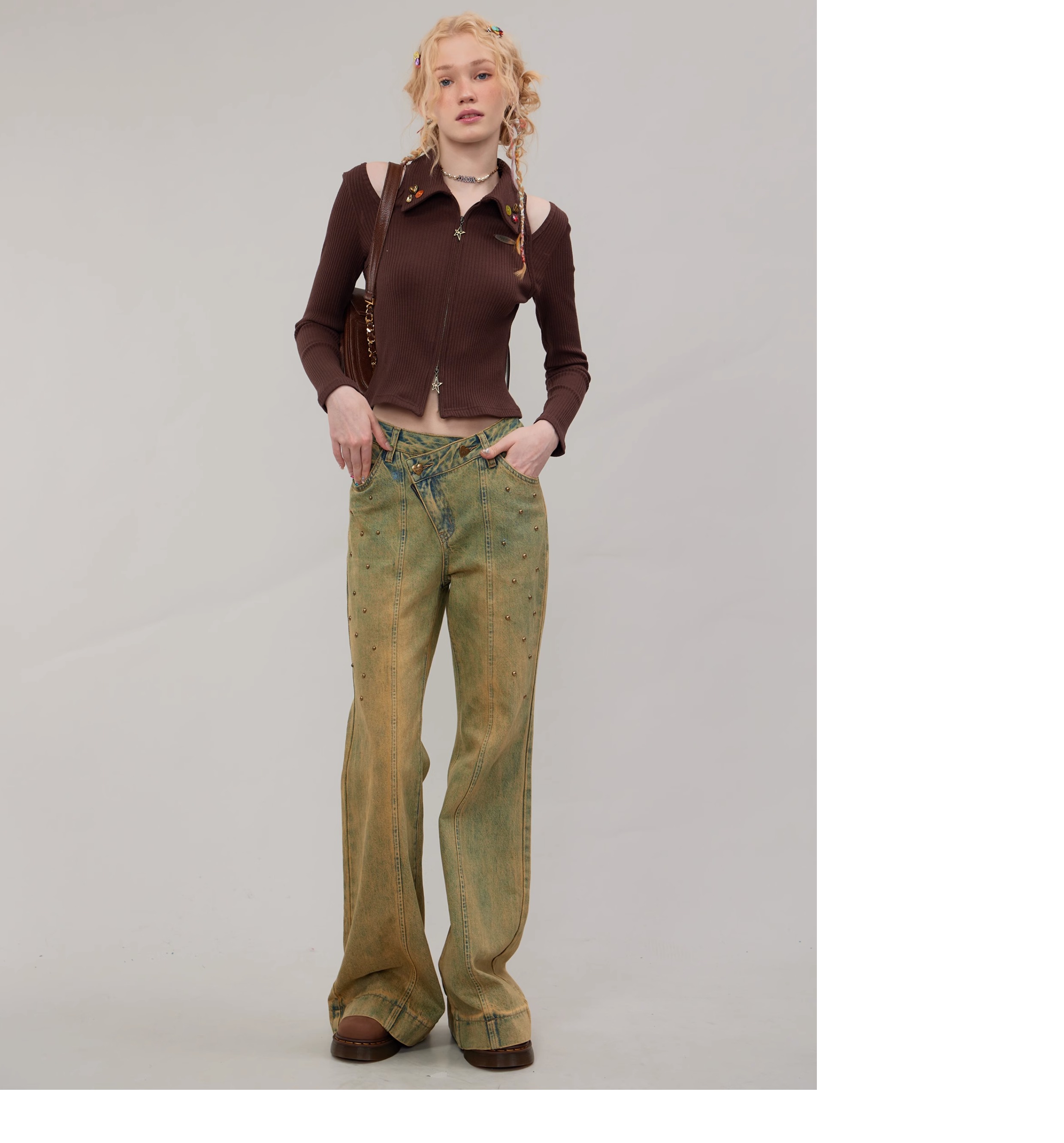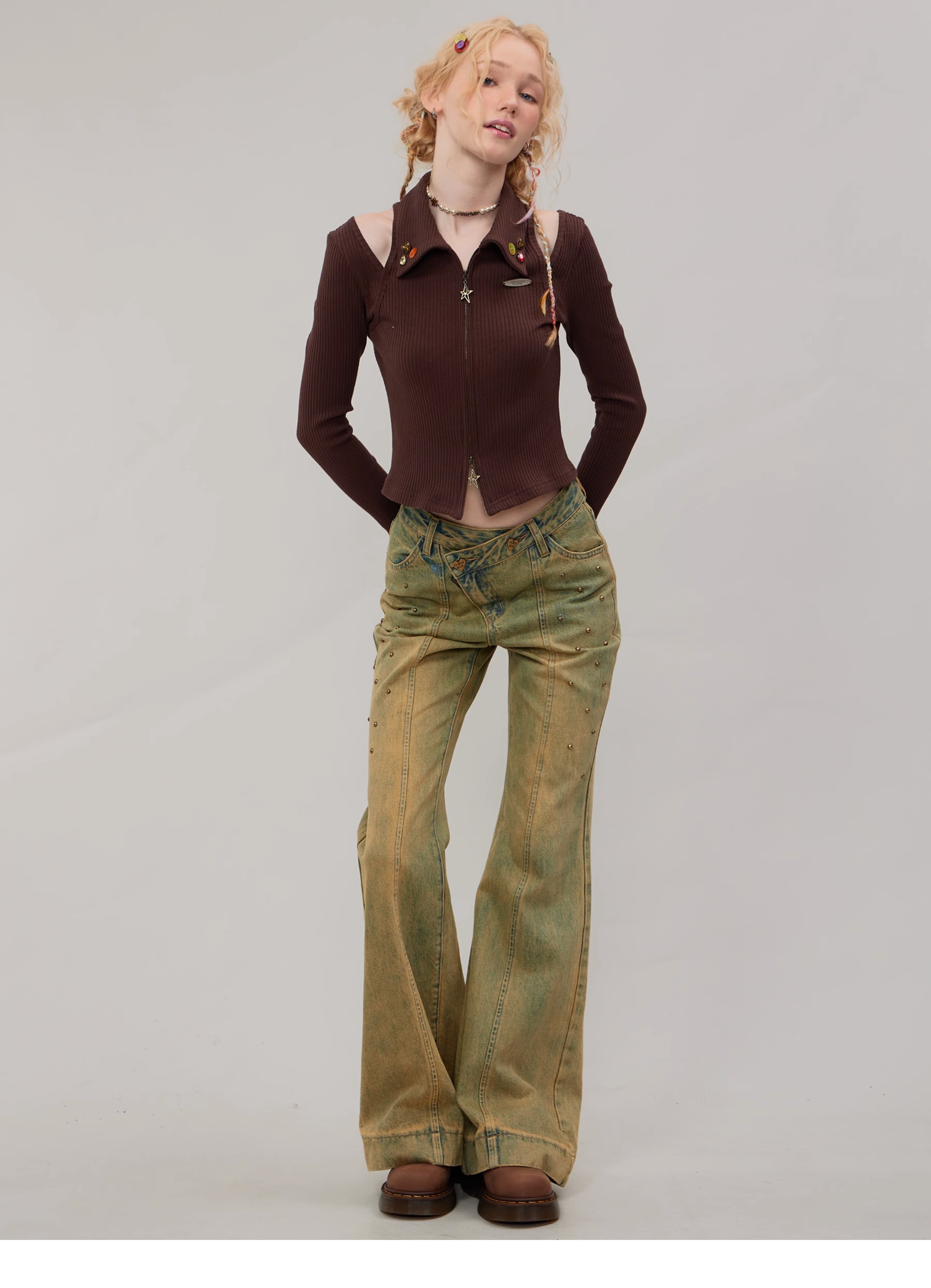 Топ с воротником-поло на молнии и текстурированной рубашкой с длинными рукавами для осенне-зимнего ретро-стиля