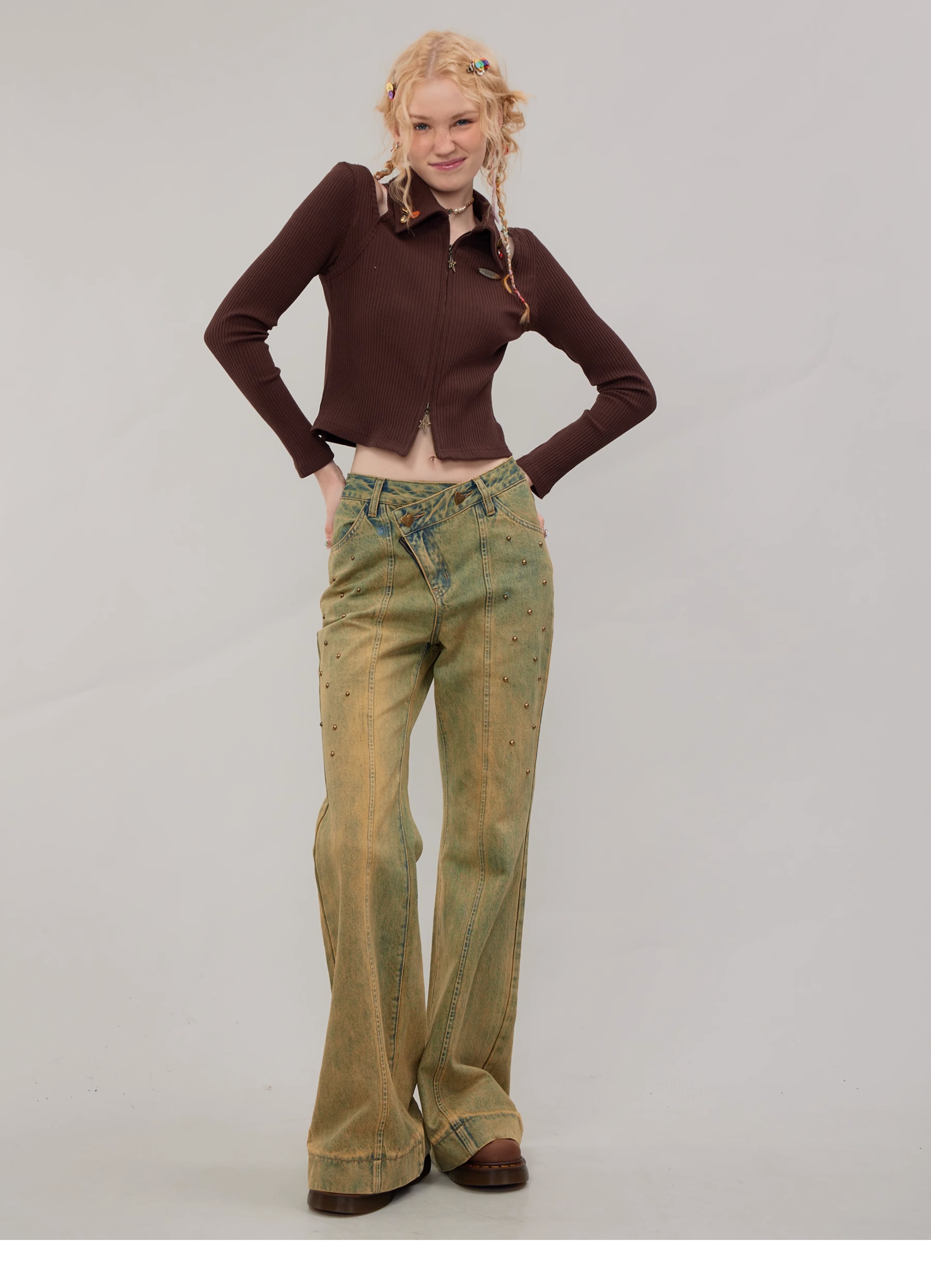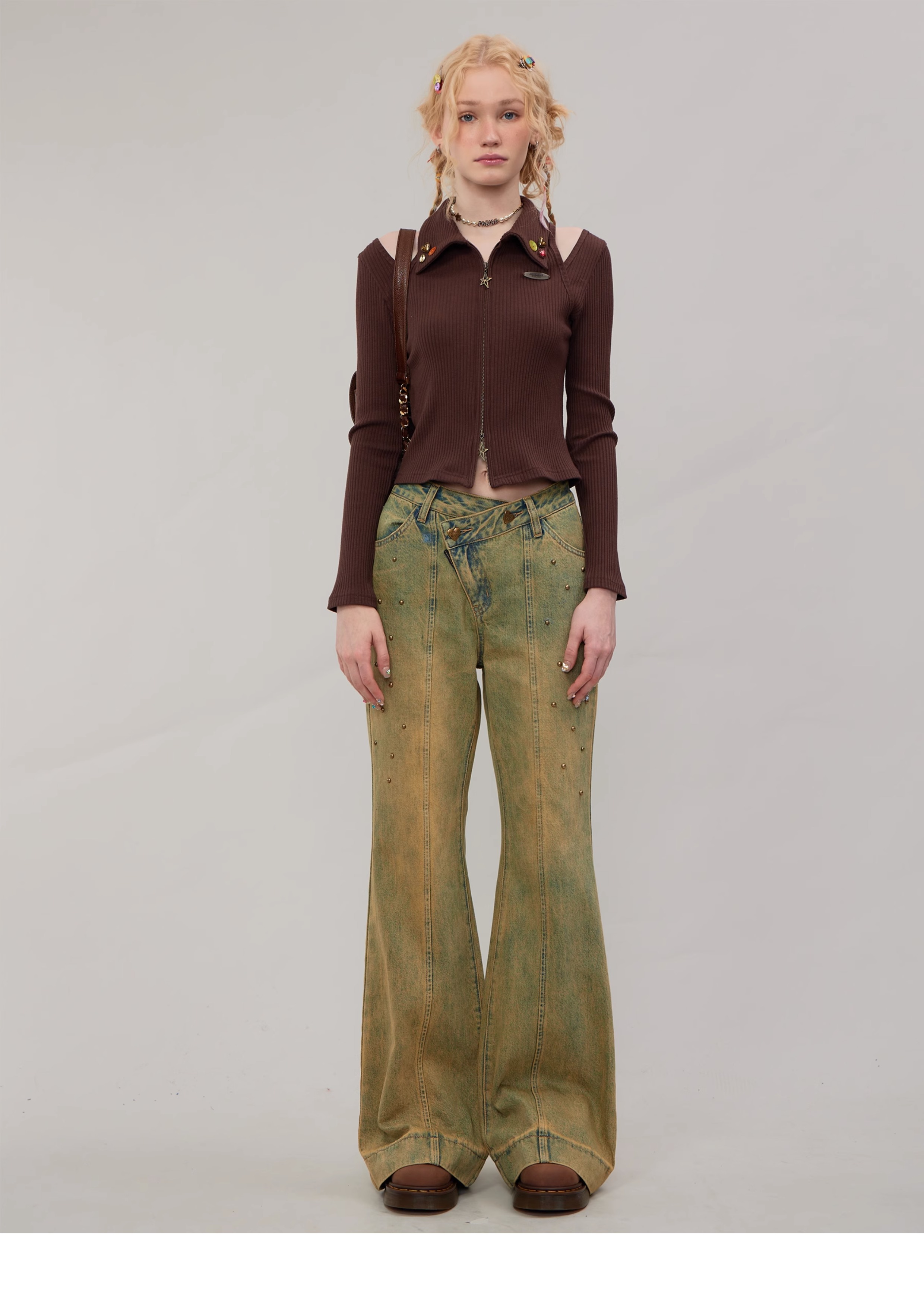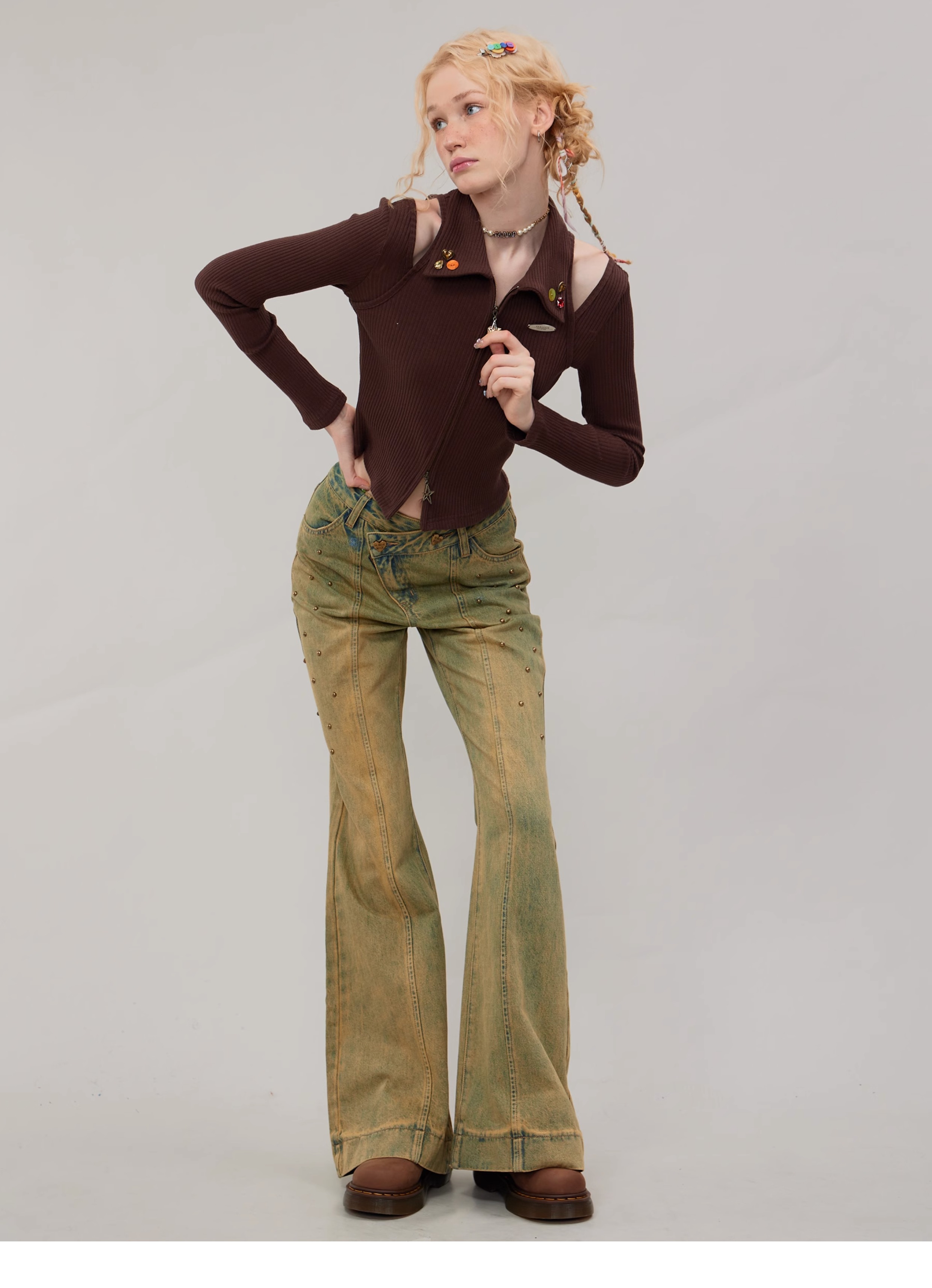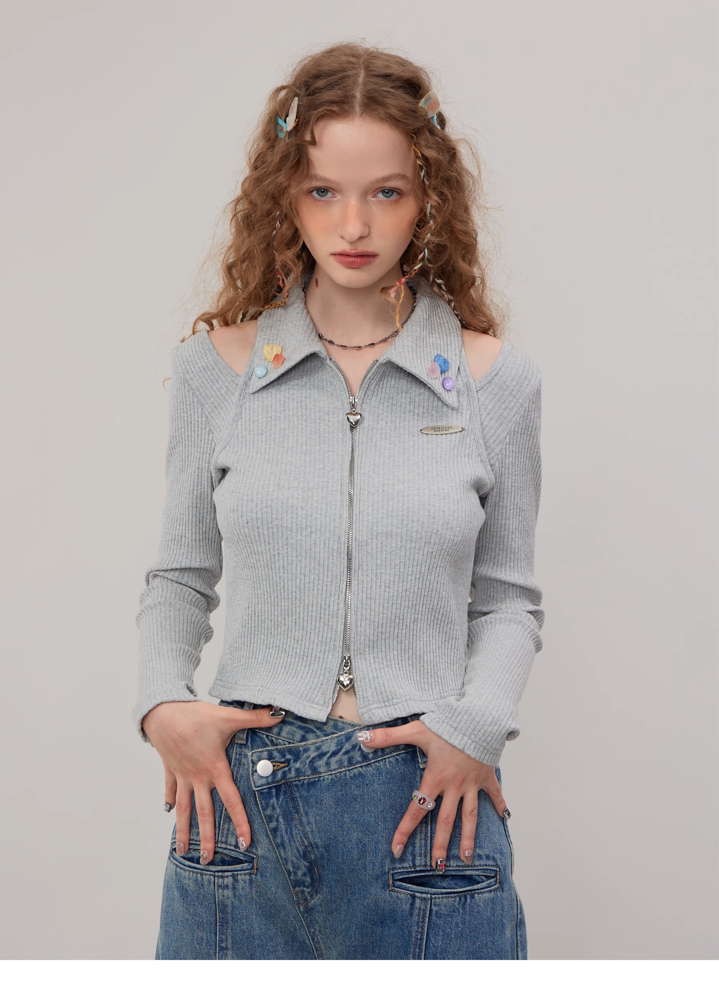 Топ с воротником-поло на молнии и текстурированной рубашкой с длинными рукавами для осенне-зимнего ретро-стиля