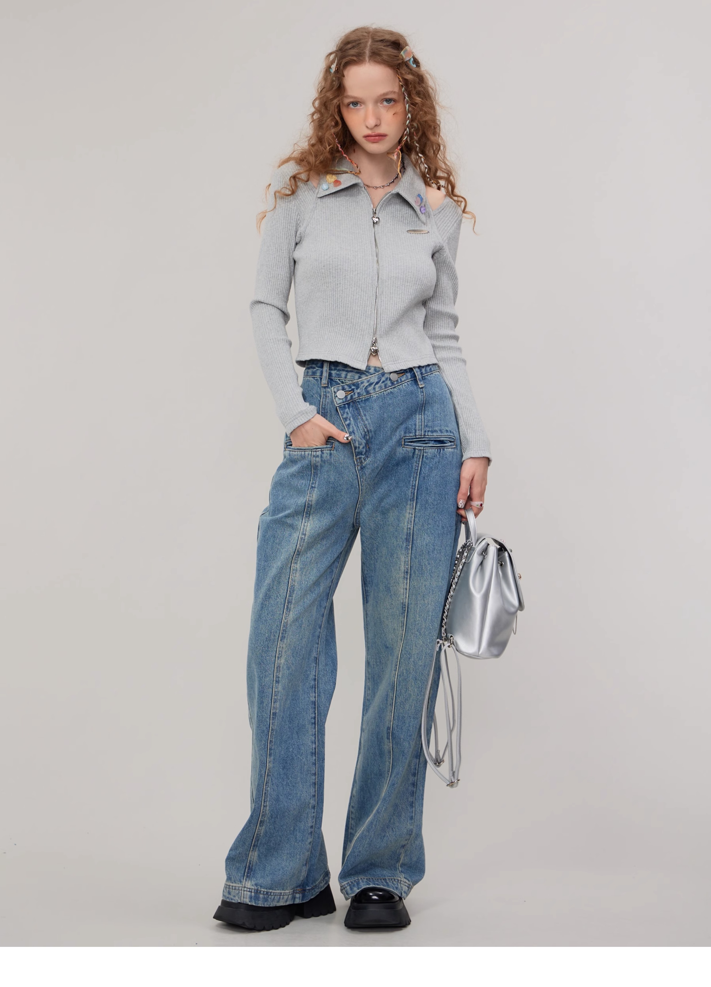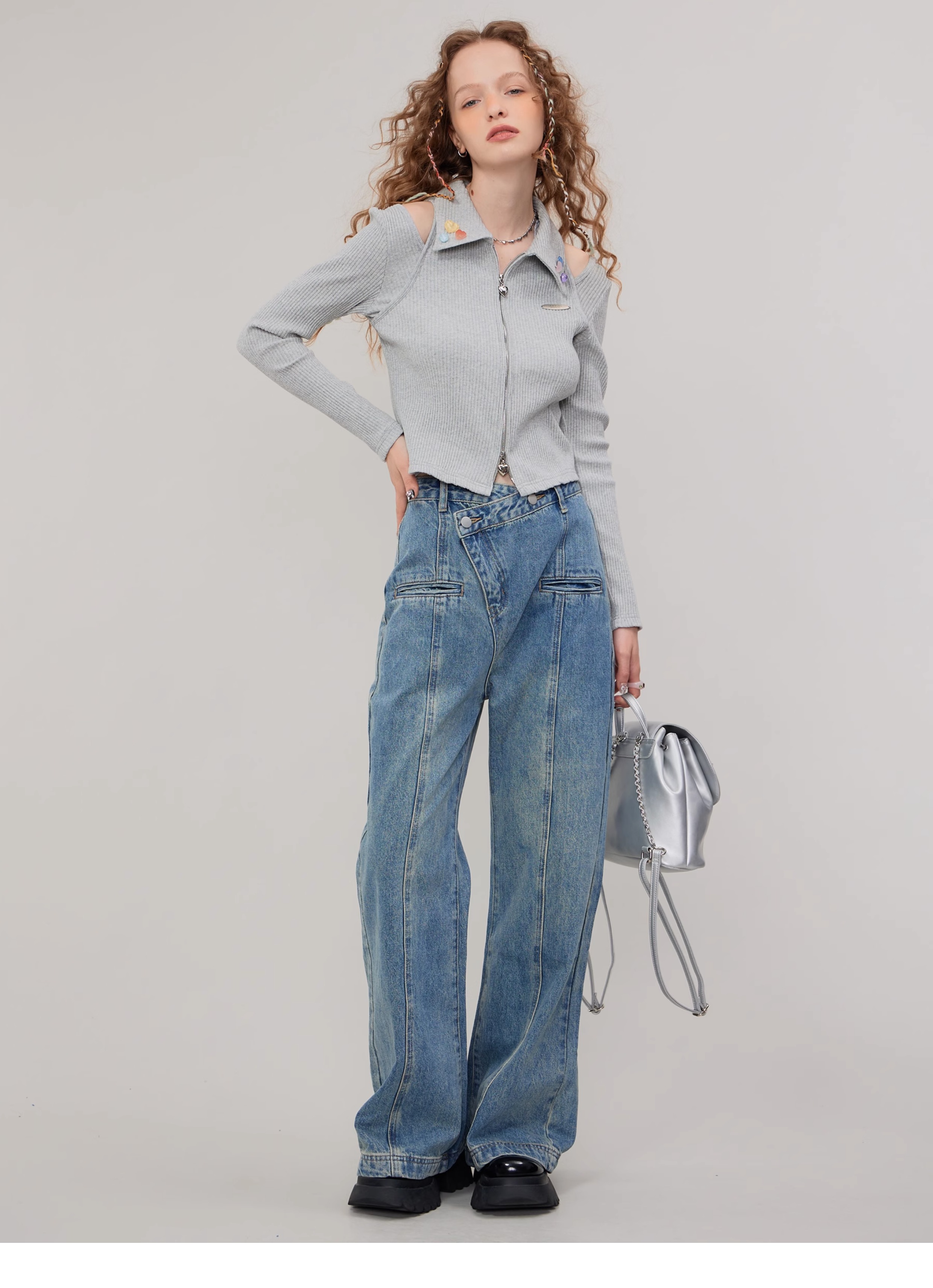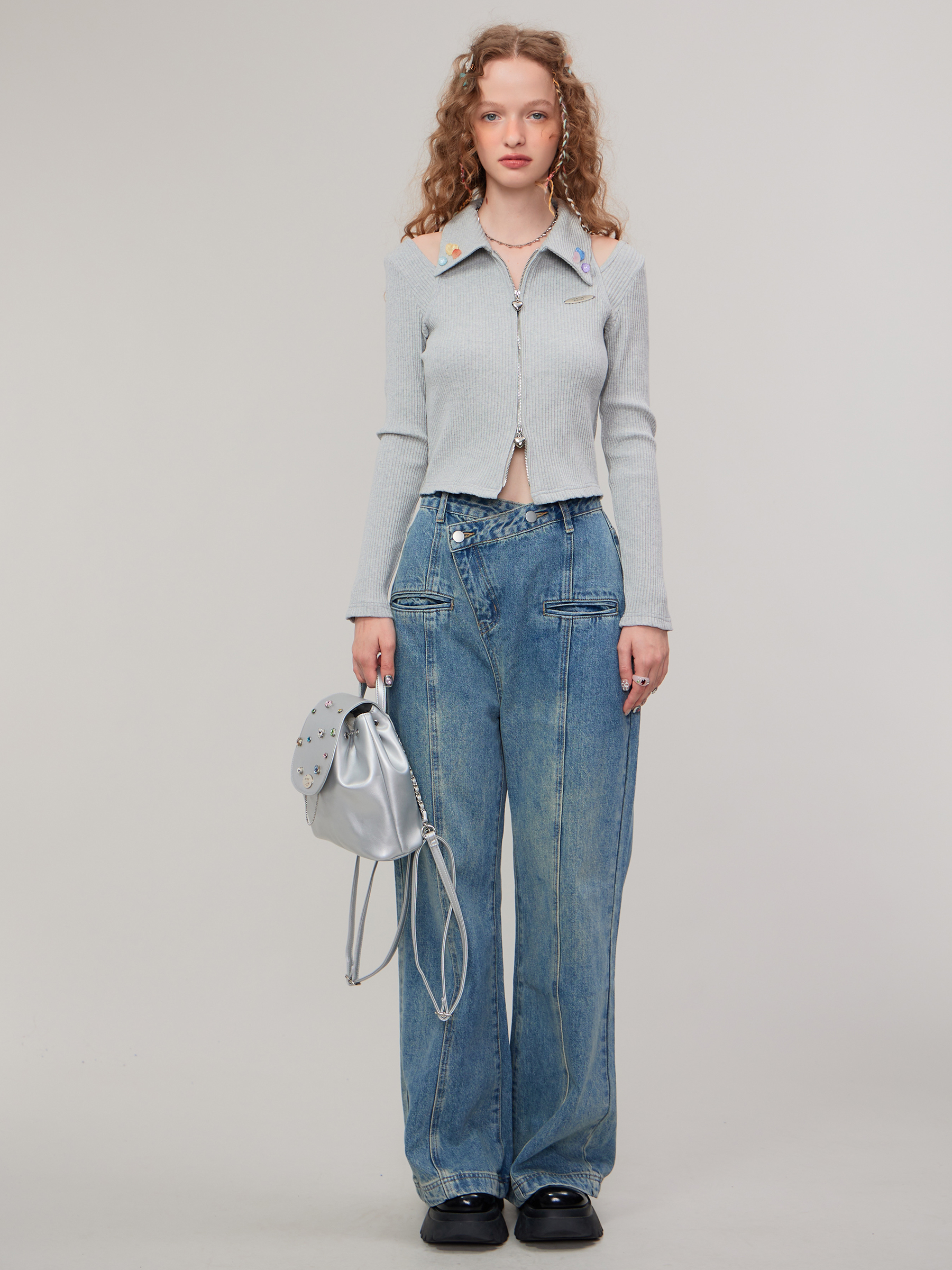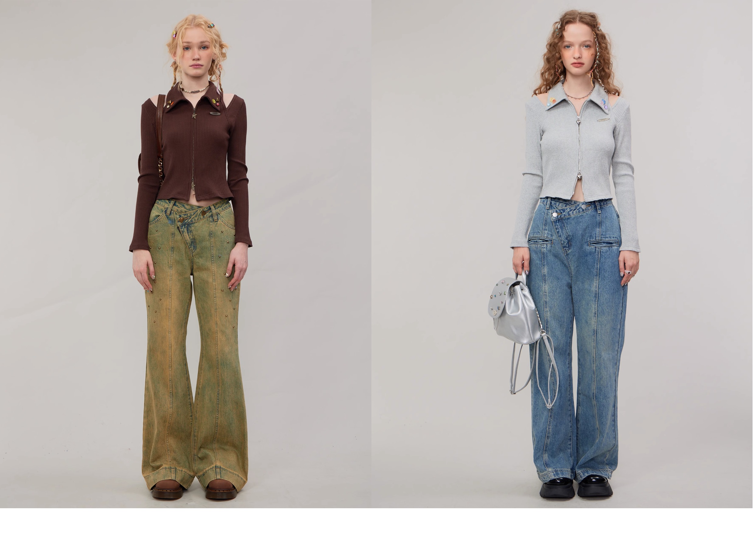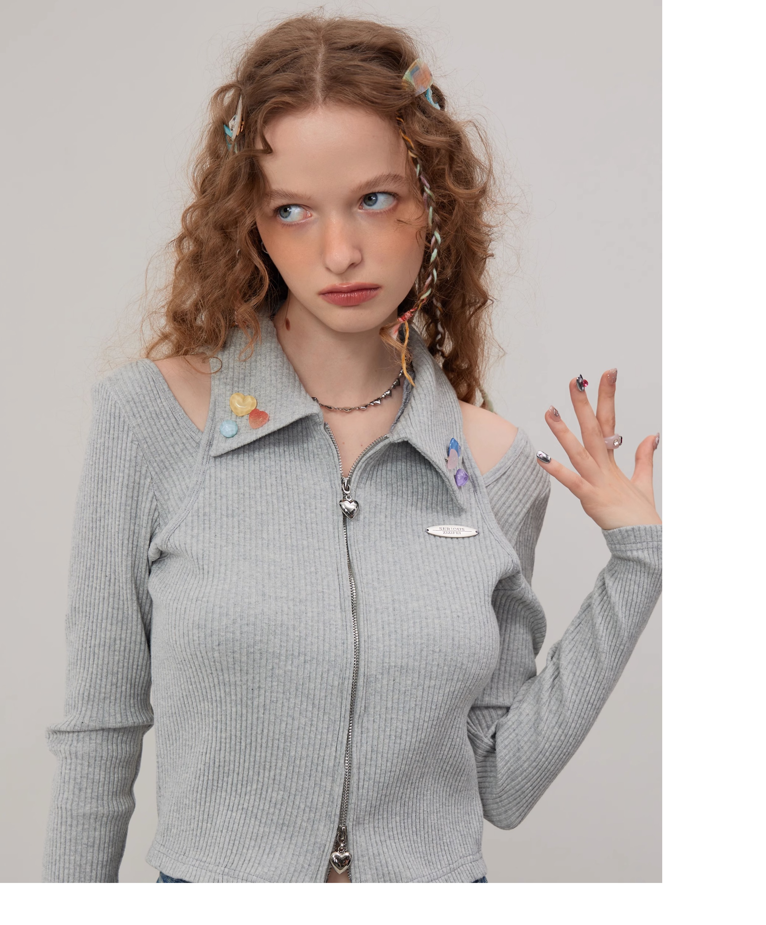 Топ с воротником-поло на молнии и текстурированной рубашкой с длинными рукавами для осенне-зимнего ретро-стиля