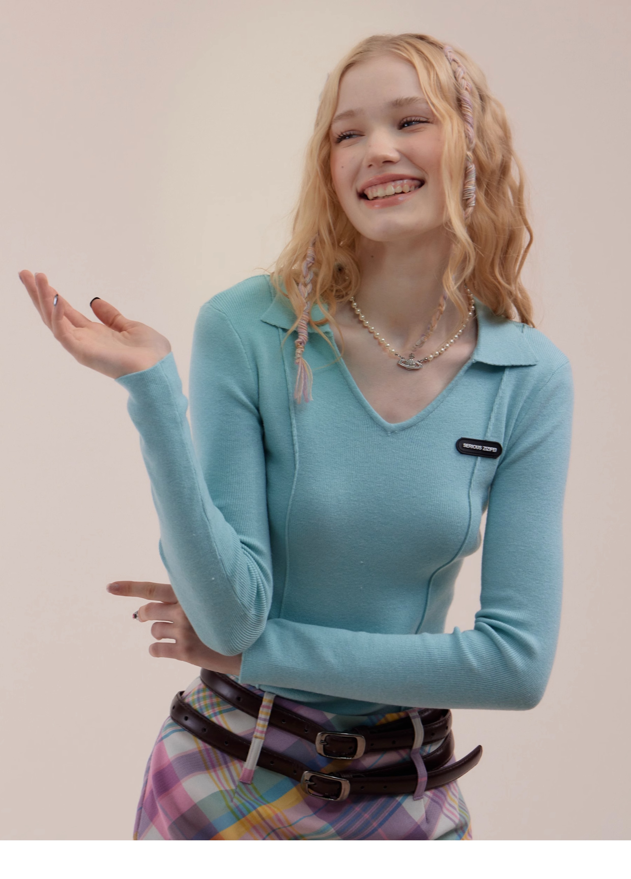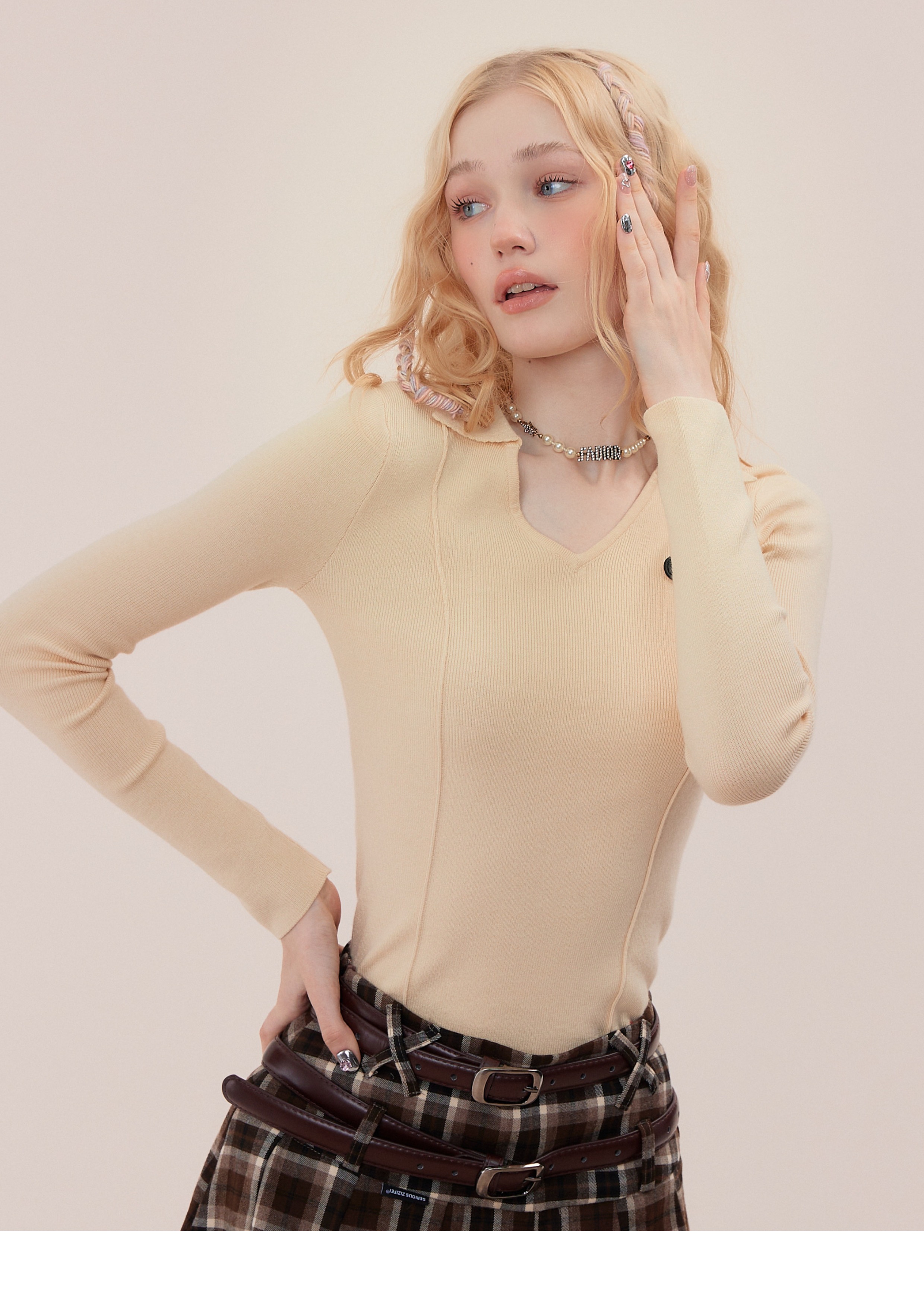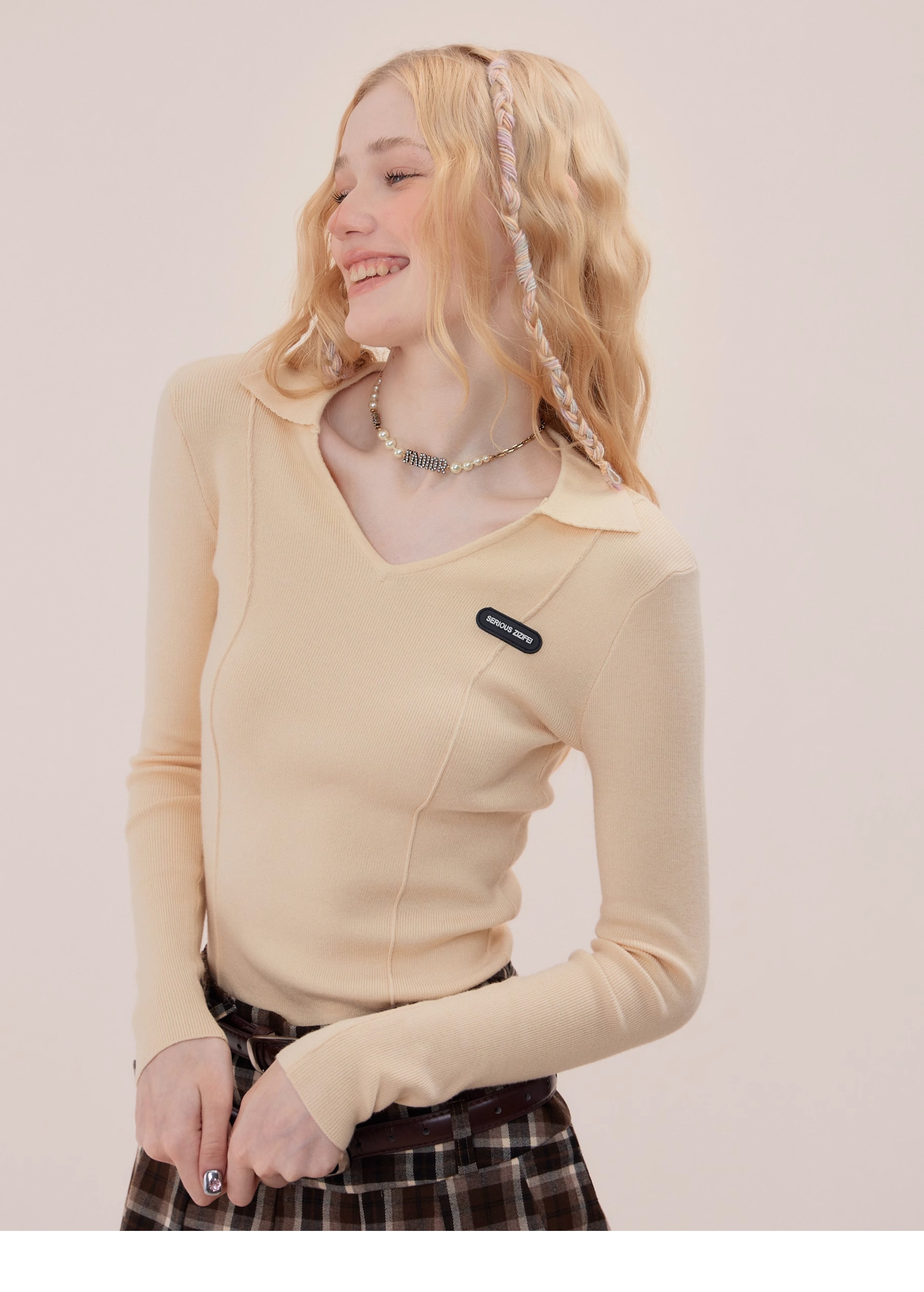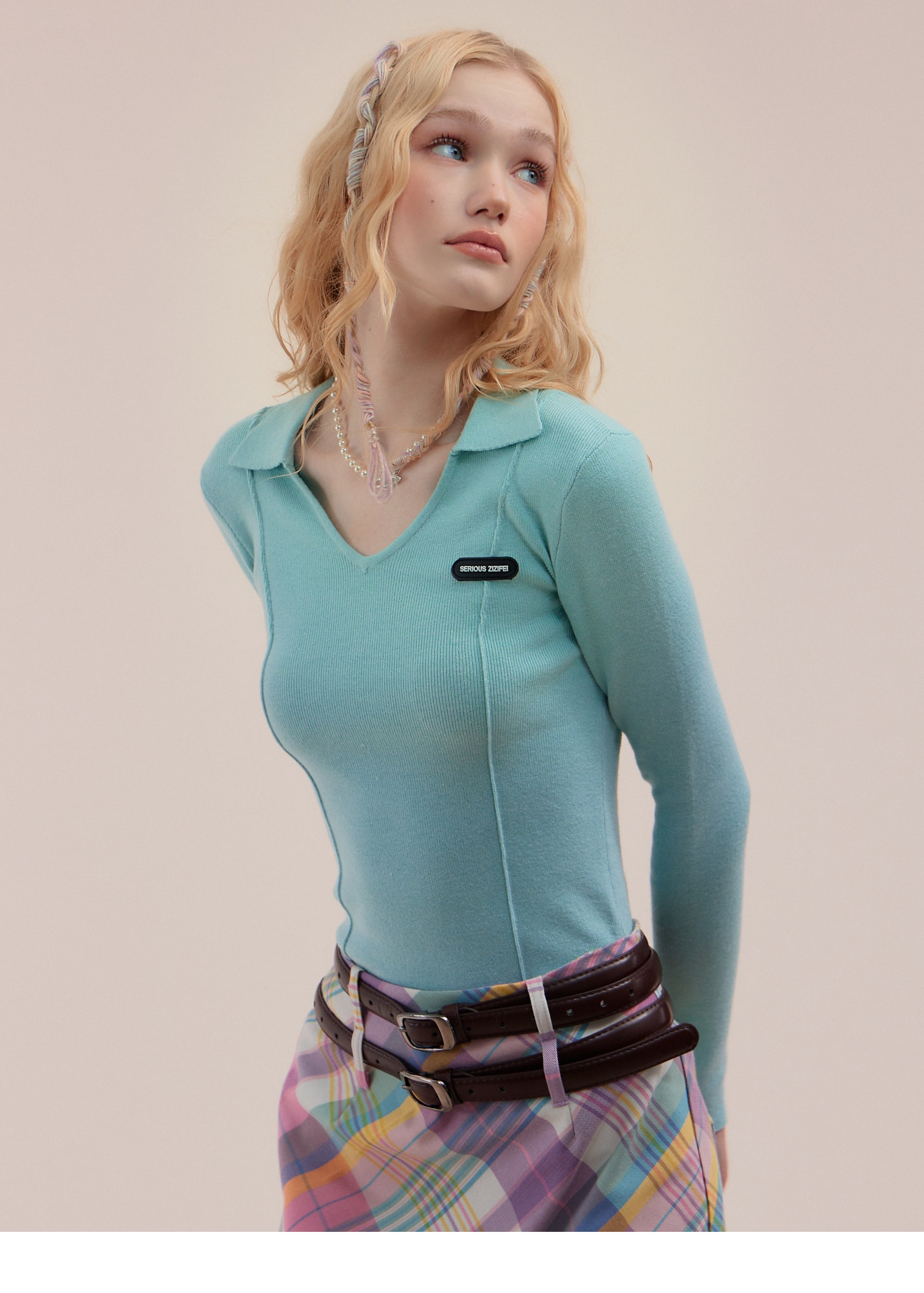 Облегающая футболка-поло с v-образным вырезом | Трикотажная базовая рубашка в стиле ретро с длинными рукавами на осень/зиму