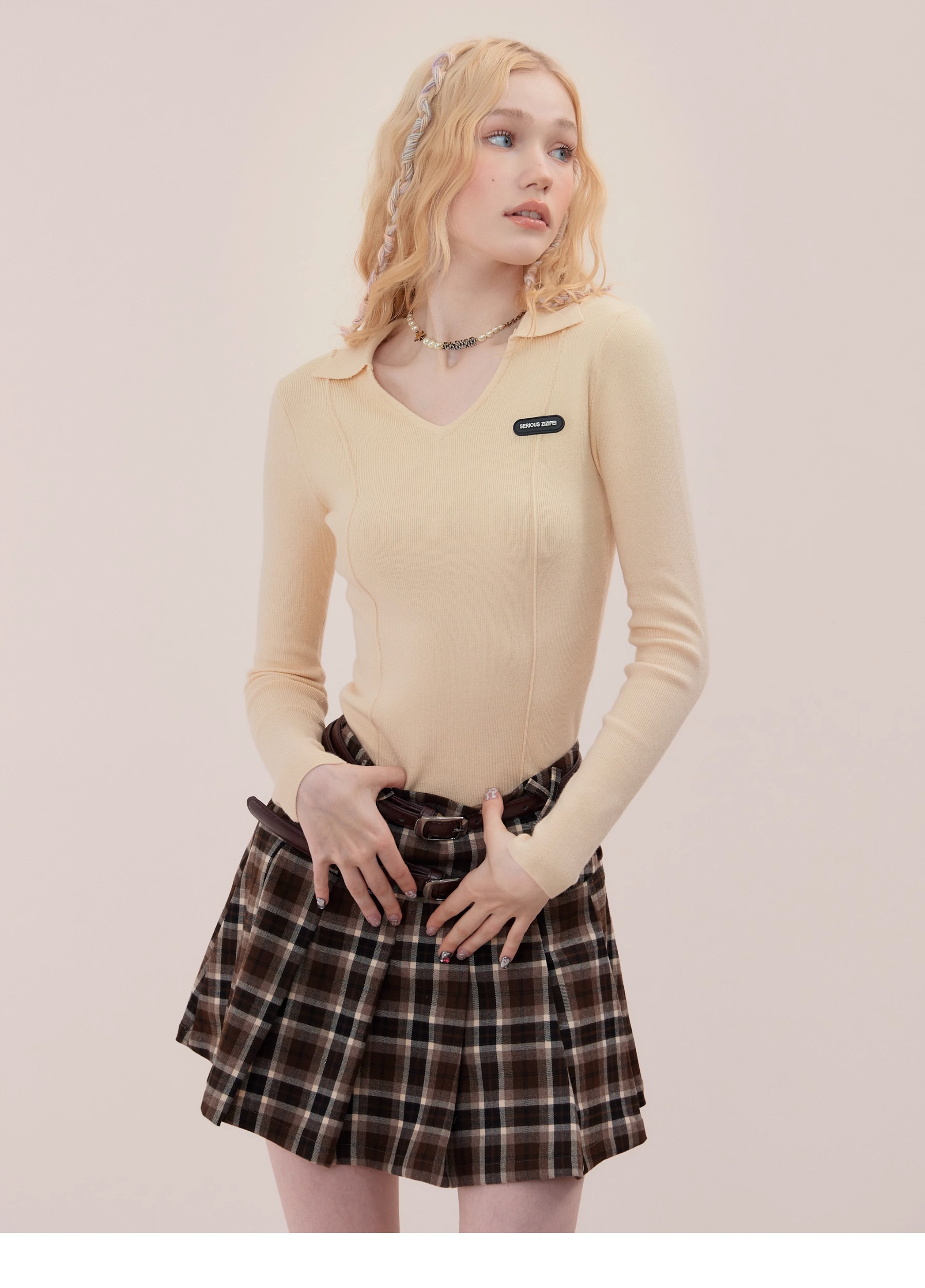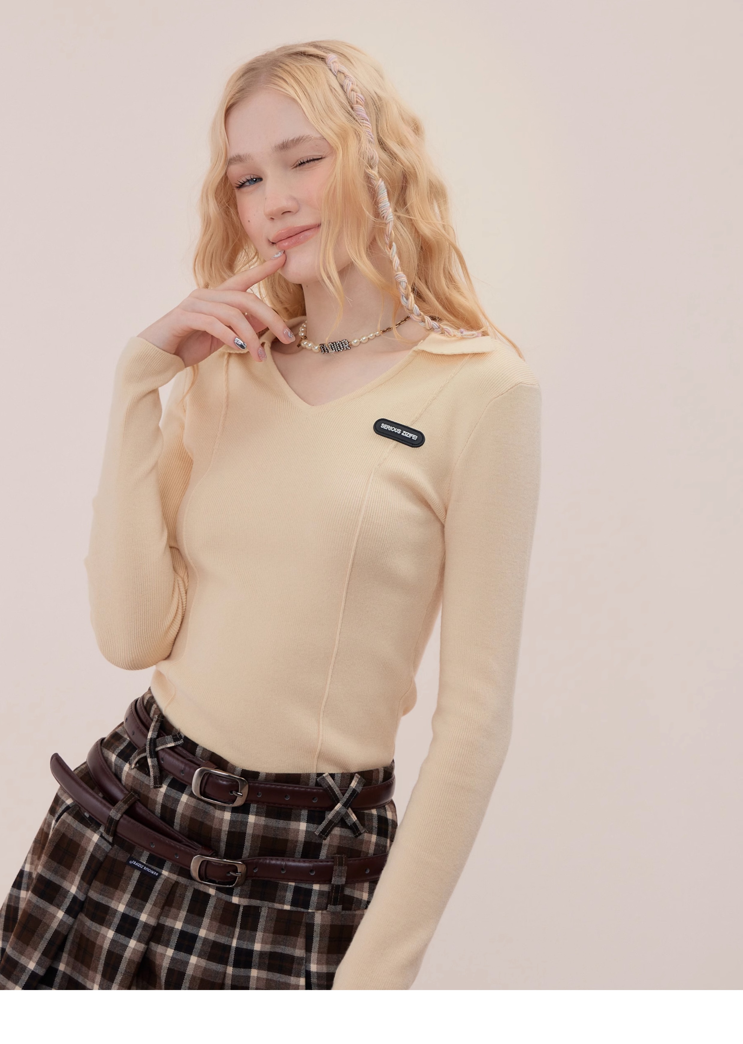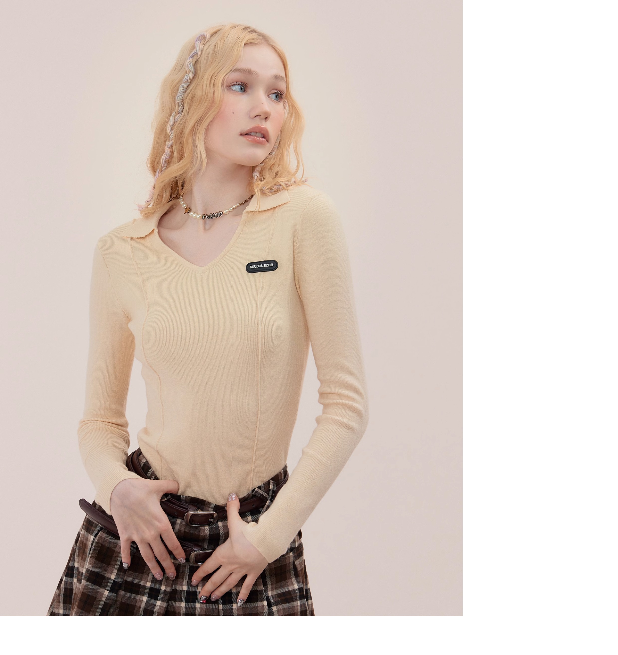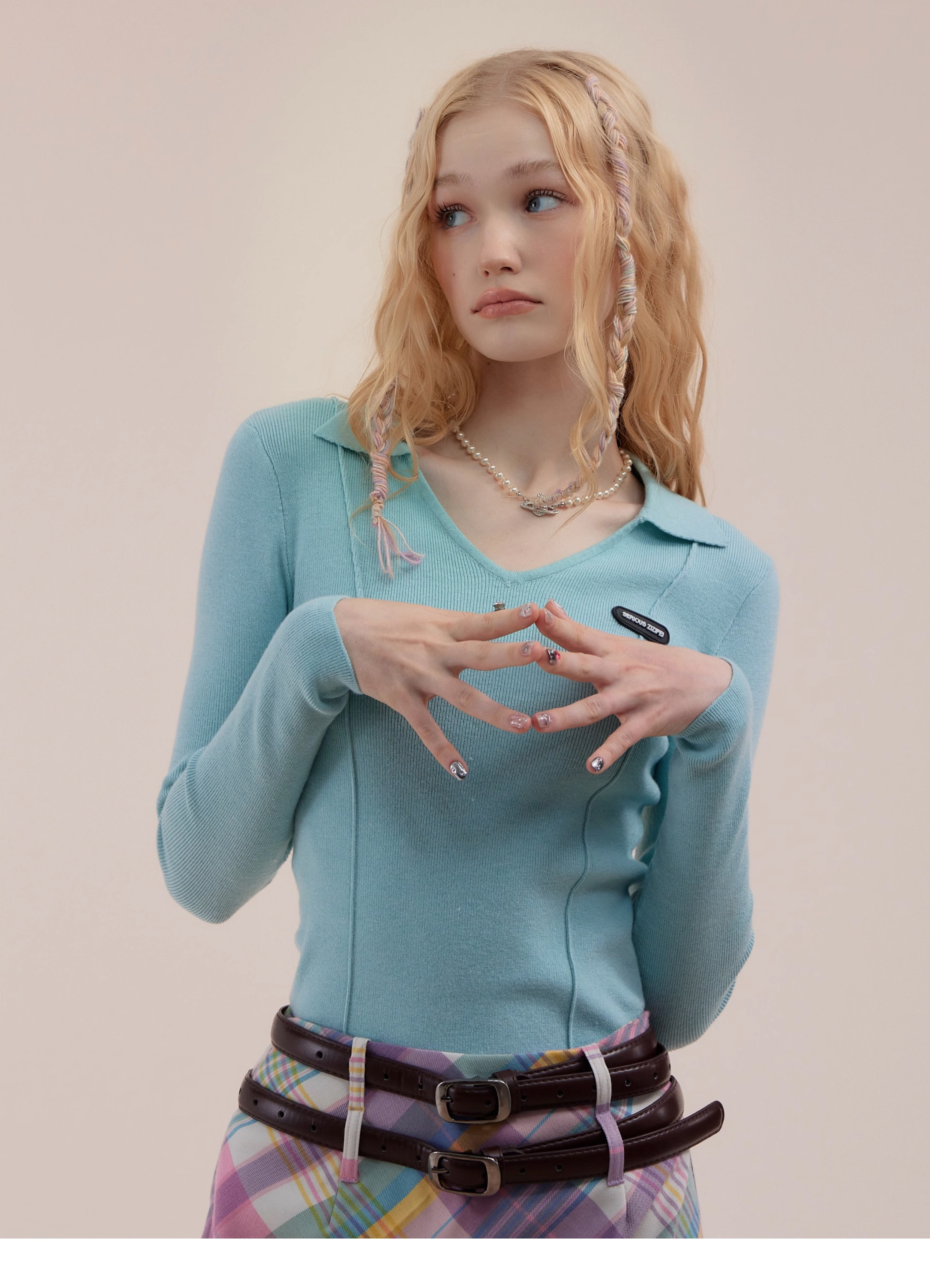 Облегающая футболка-поло с v-образным вырезом | Трикотажная базовая рубашка в стиле ретро с длинными рукавами на осень/зиму