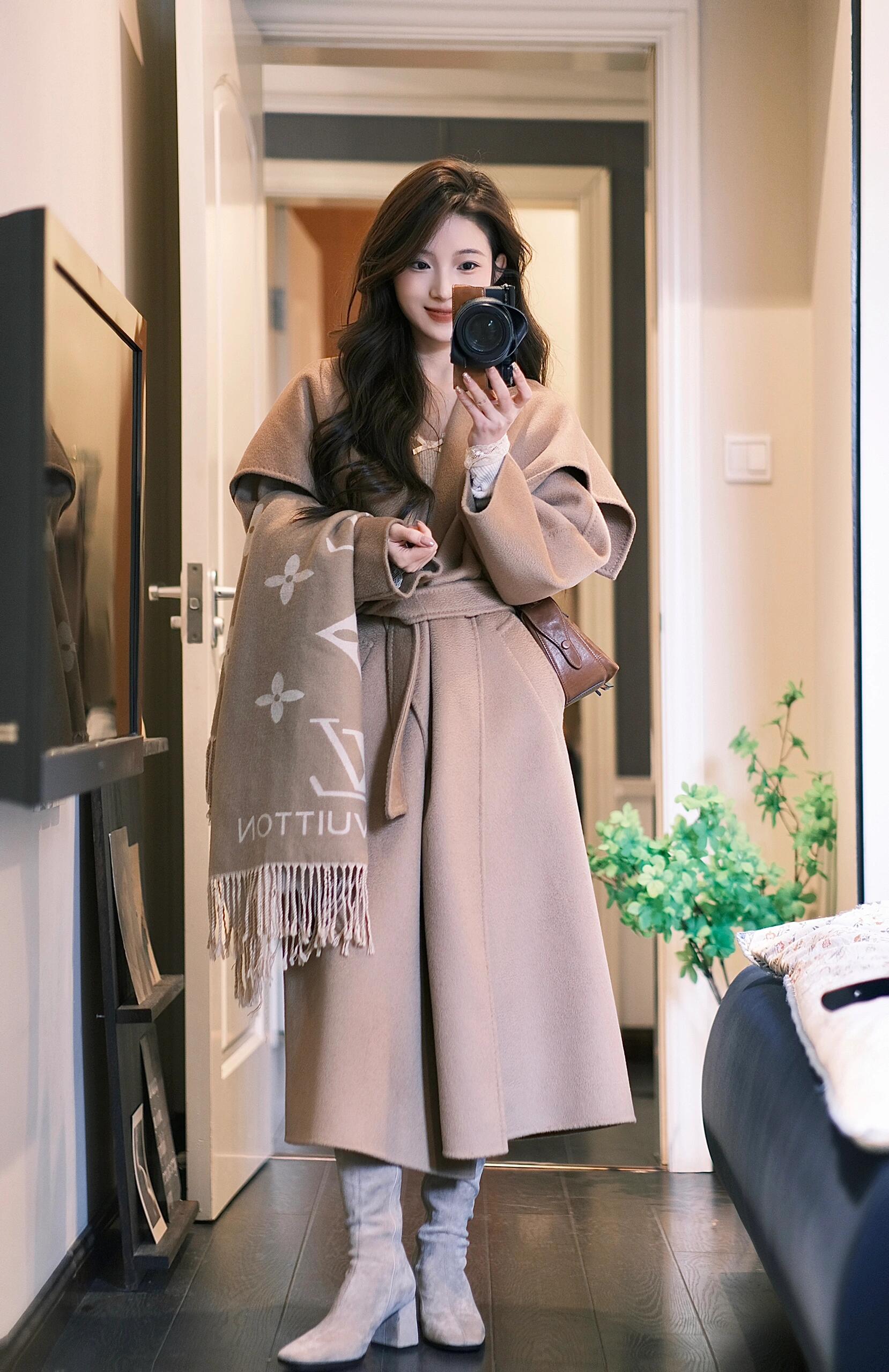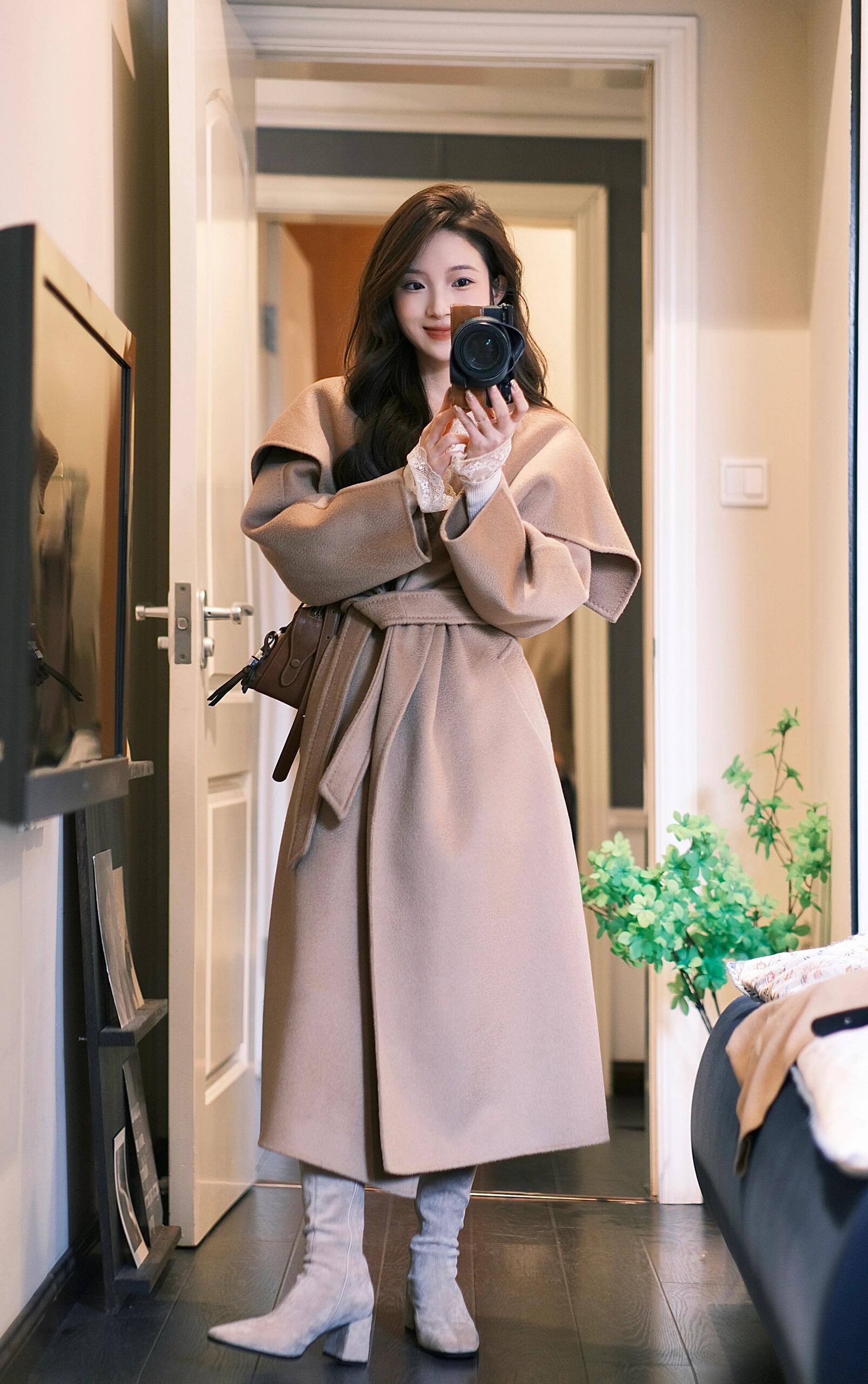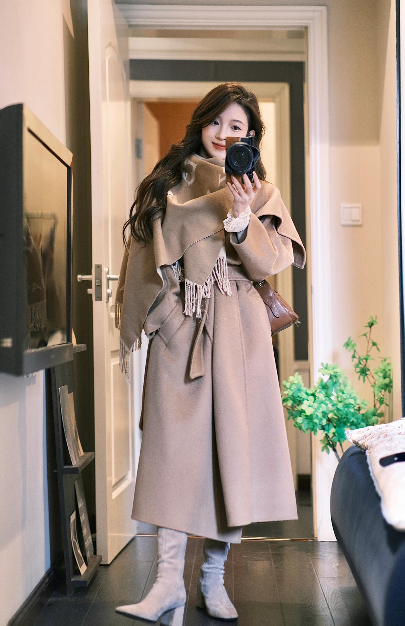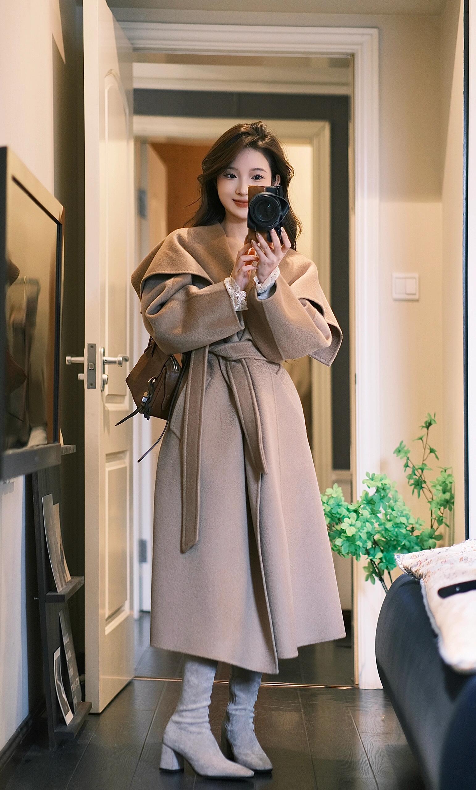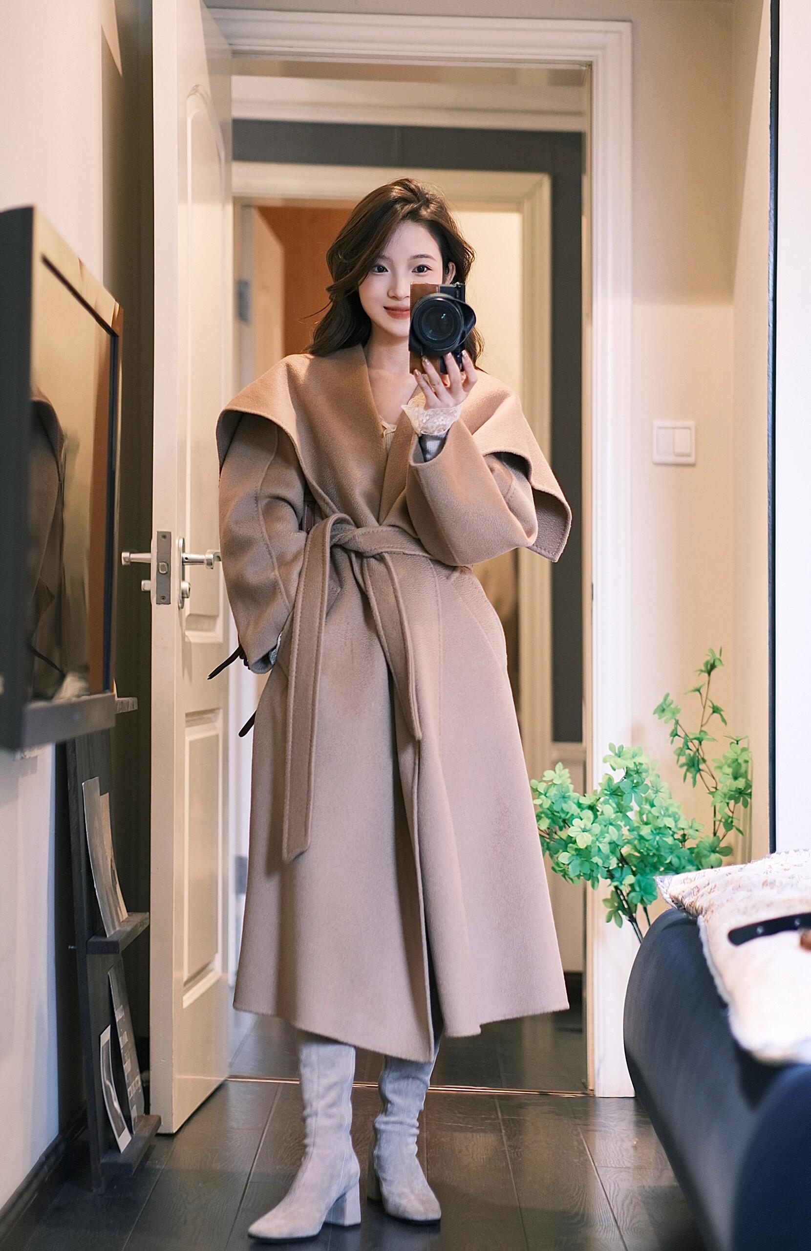 Camel Double-Sided Cashmere Coat – Hepburn-Style Mid-Length Woolen Elegance
