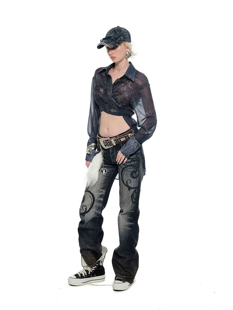 Denim Tie-Print Chiffon Long Shirt – Lightweight & Flowy Design