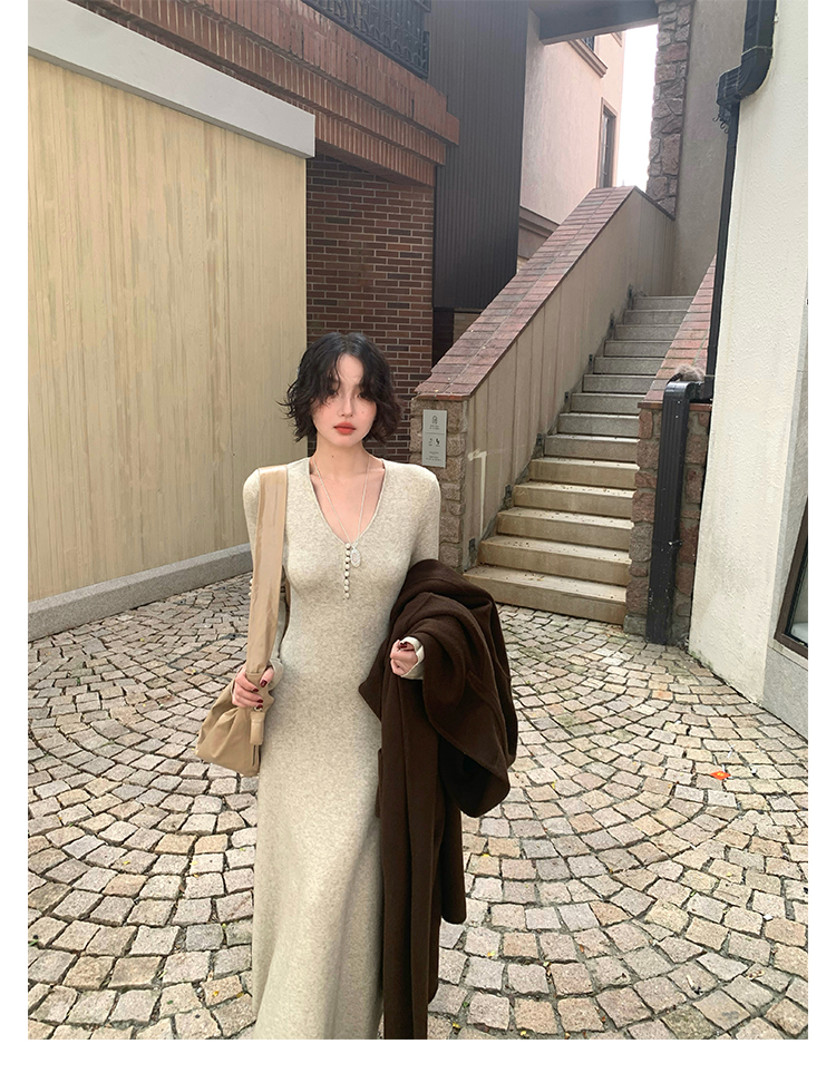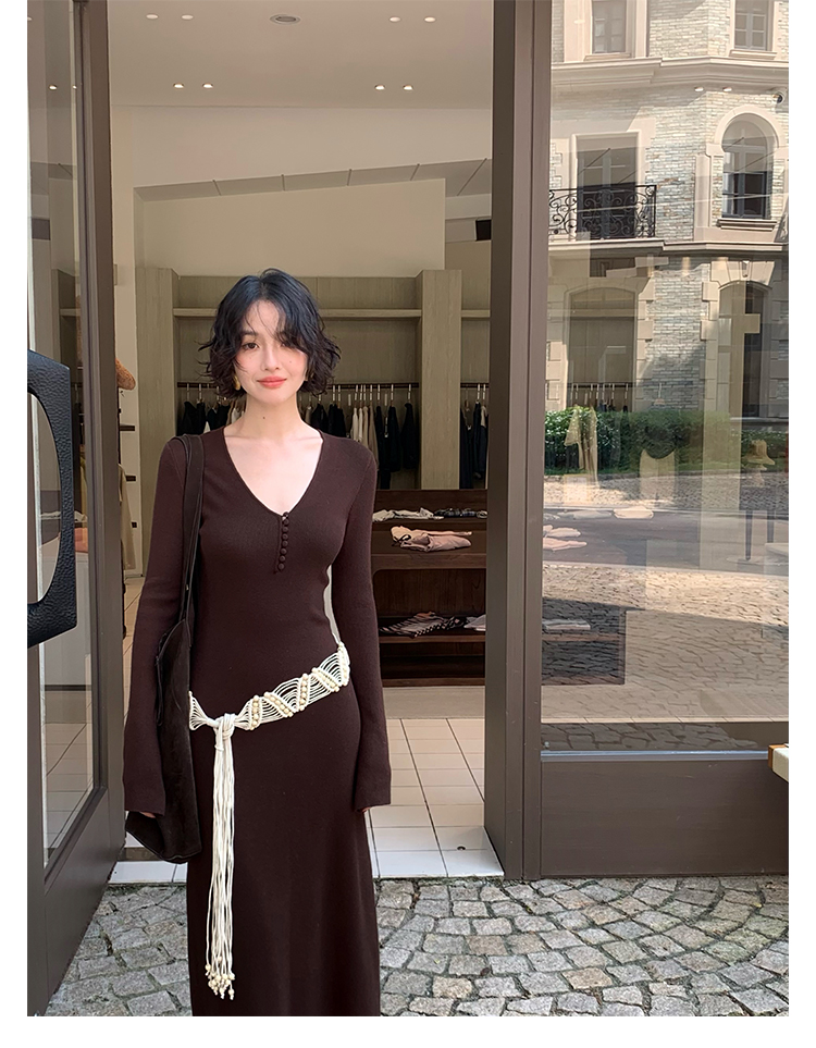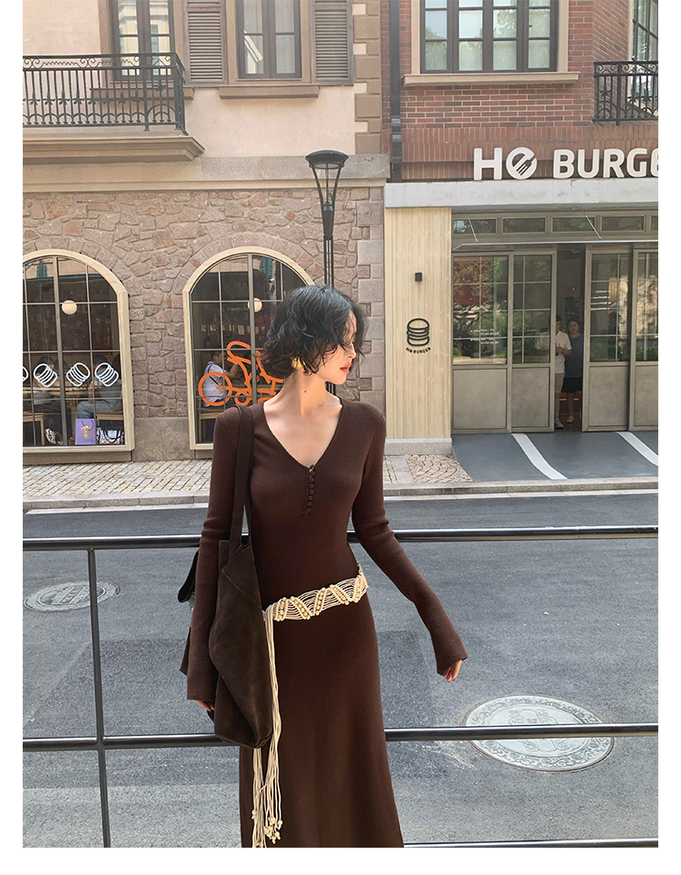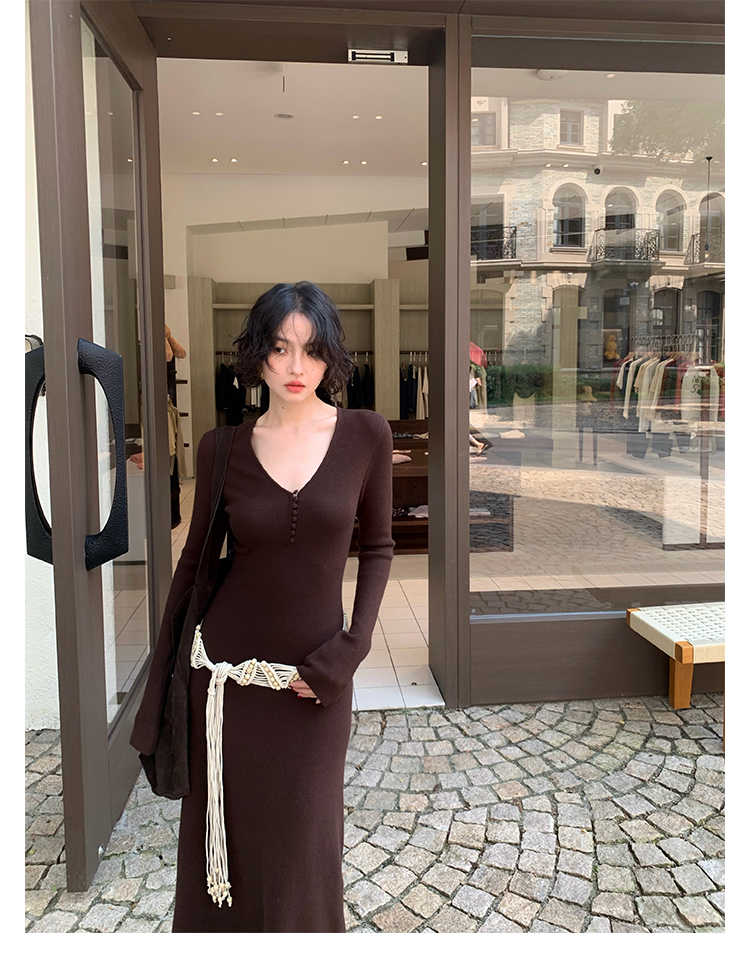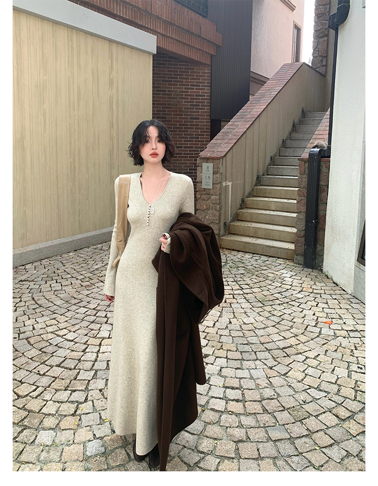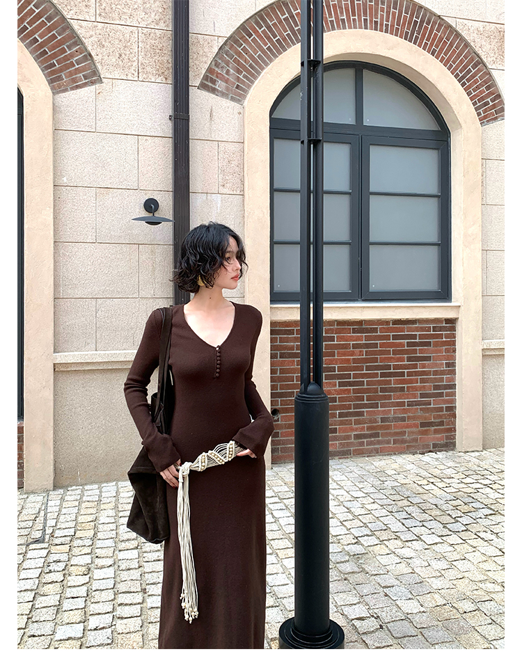 Wine Noon V-Neck Knit Long Dress – Retro Hong Kong Fall/Winter Collection 2025