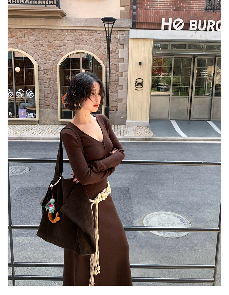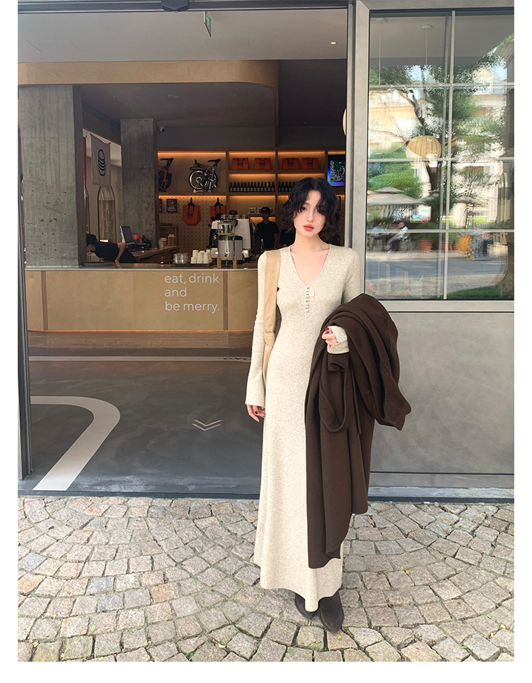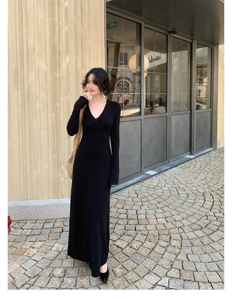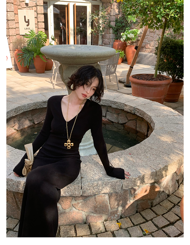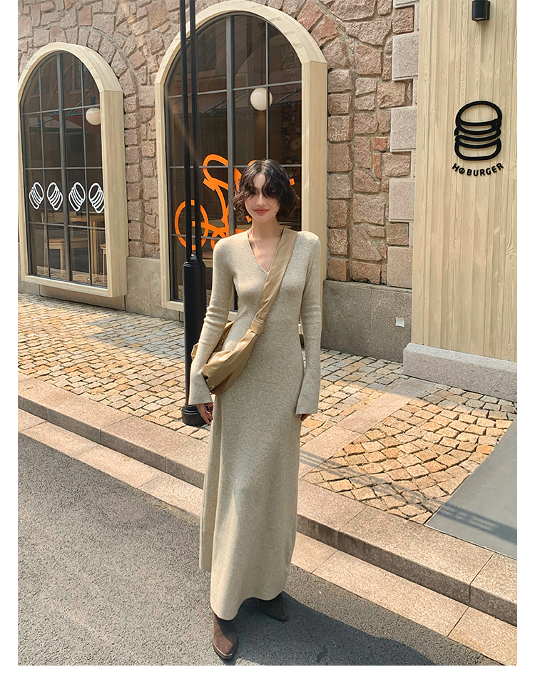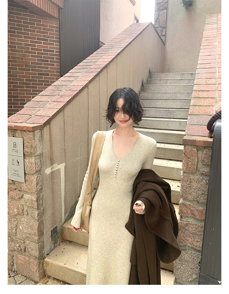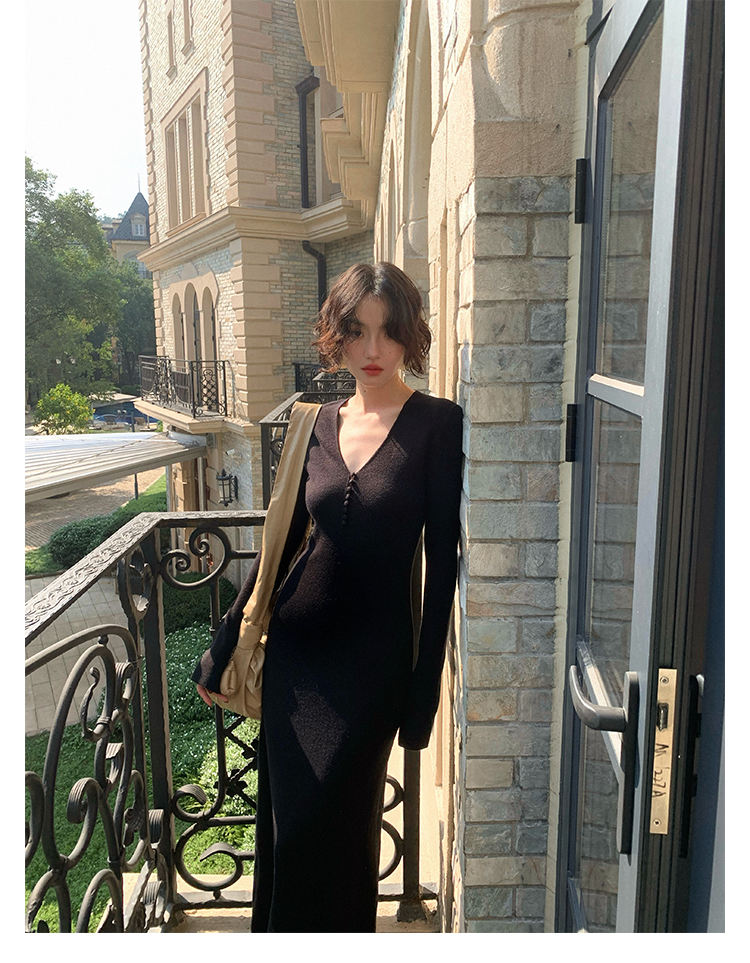 Wine Noon V-Neck Knit Long Dress – Retro Hong Kong Fall/Winter Collection 2025