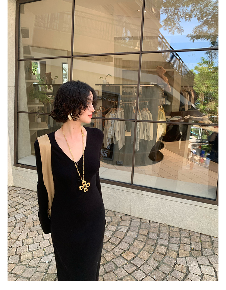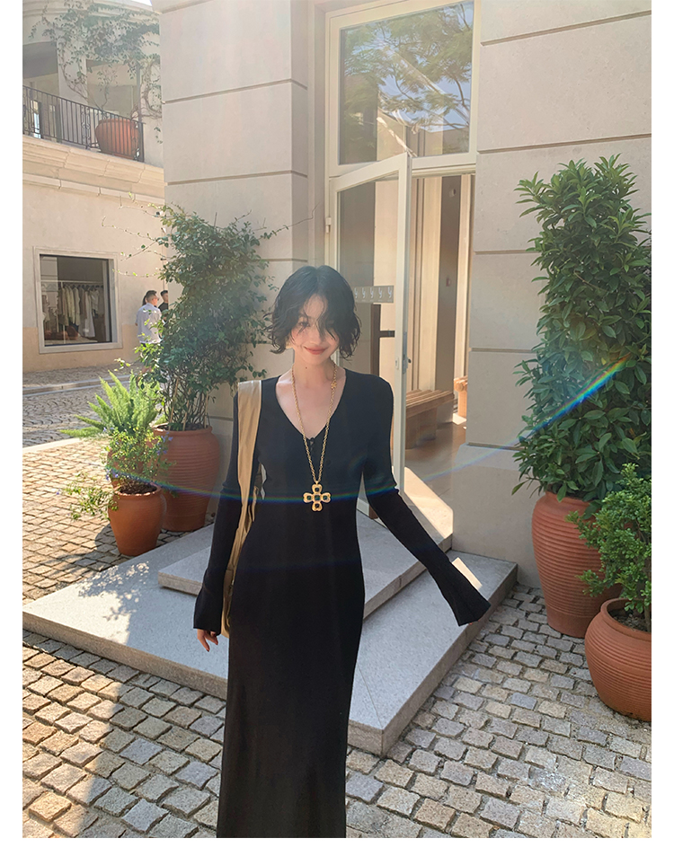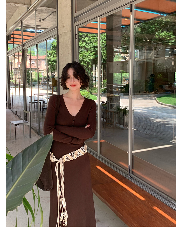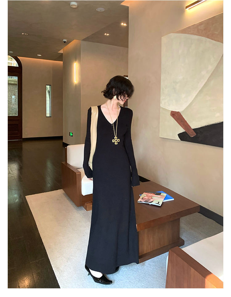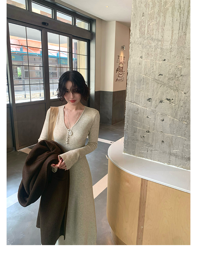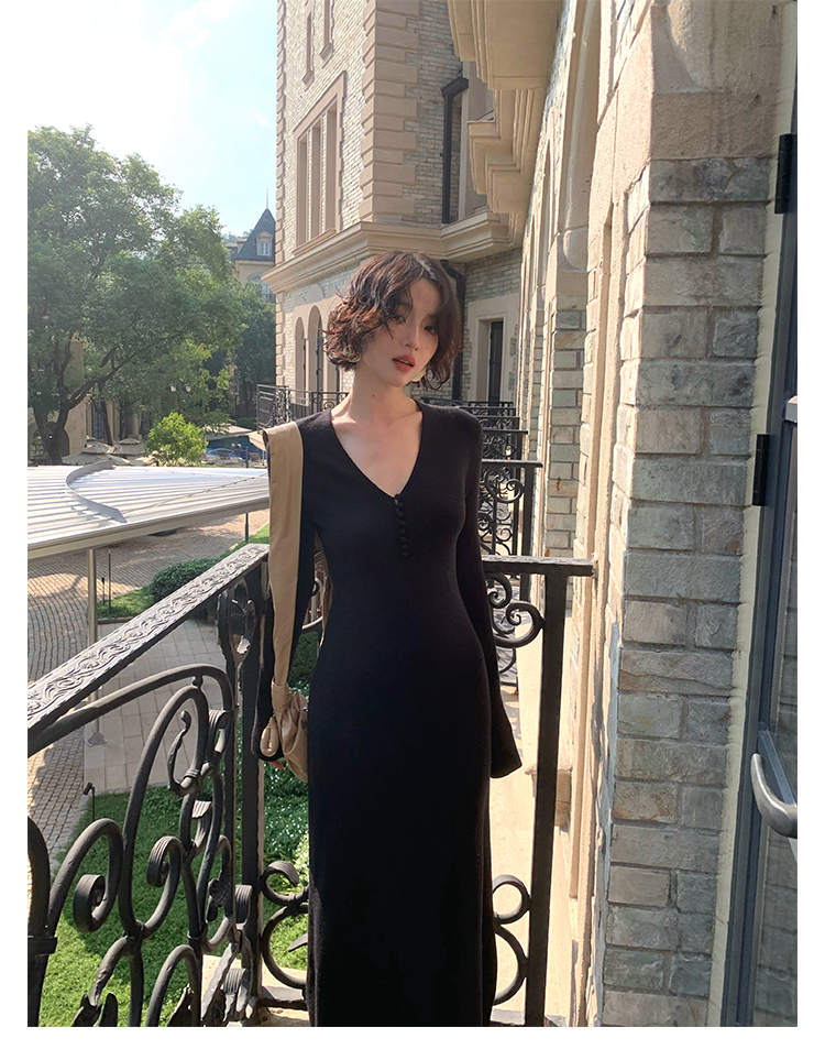 Wine Noon V-Neck Knit Long Dress – Retro Hong Kong Fall/Winter Collection 2025