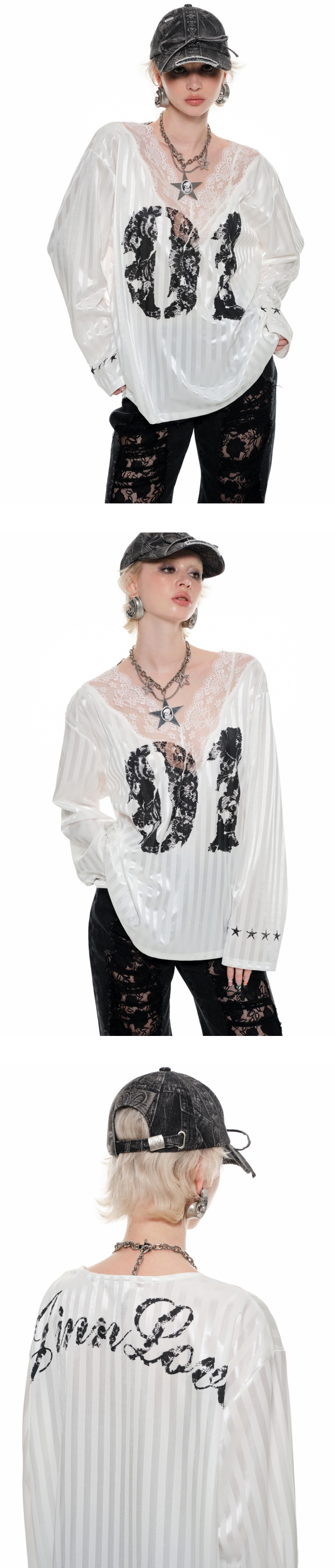 Lace V-Neck Printed Satin Jersey Top – Loose & Slim Fit French Style