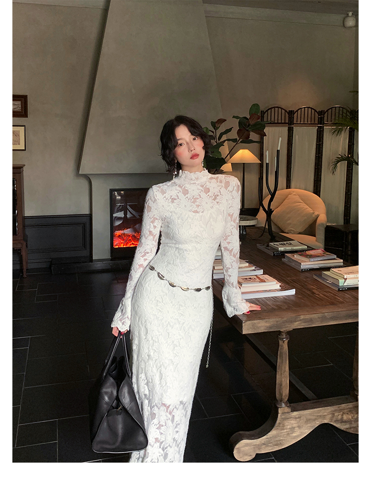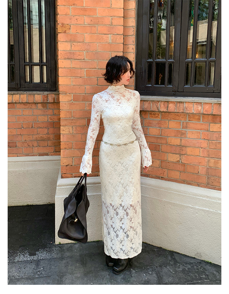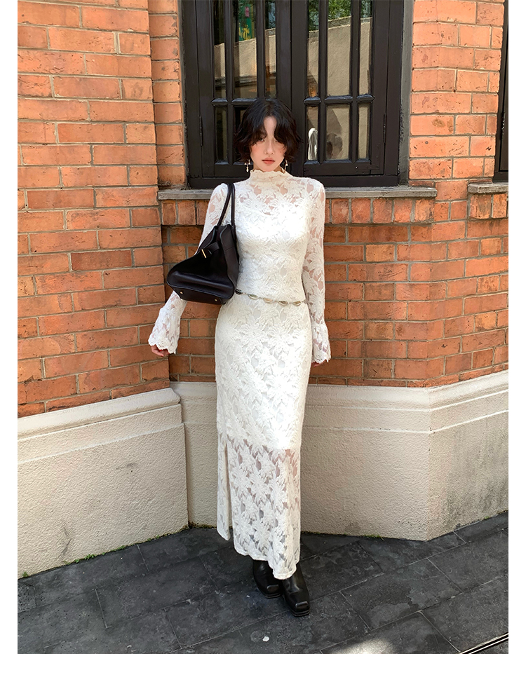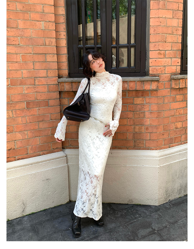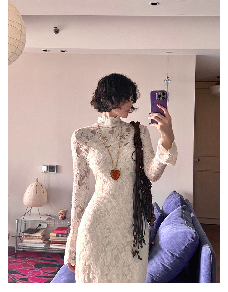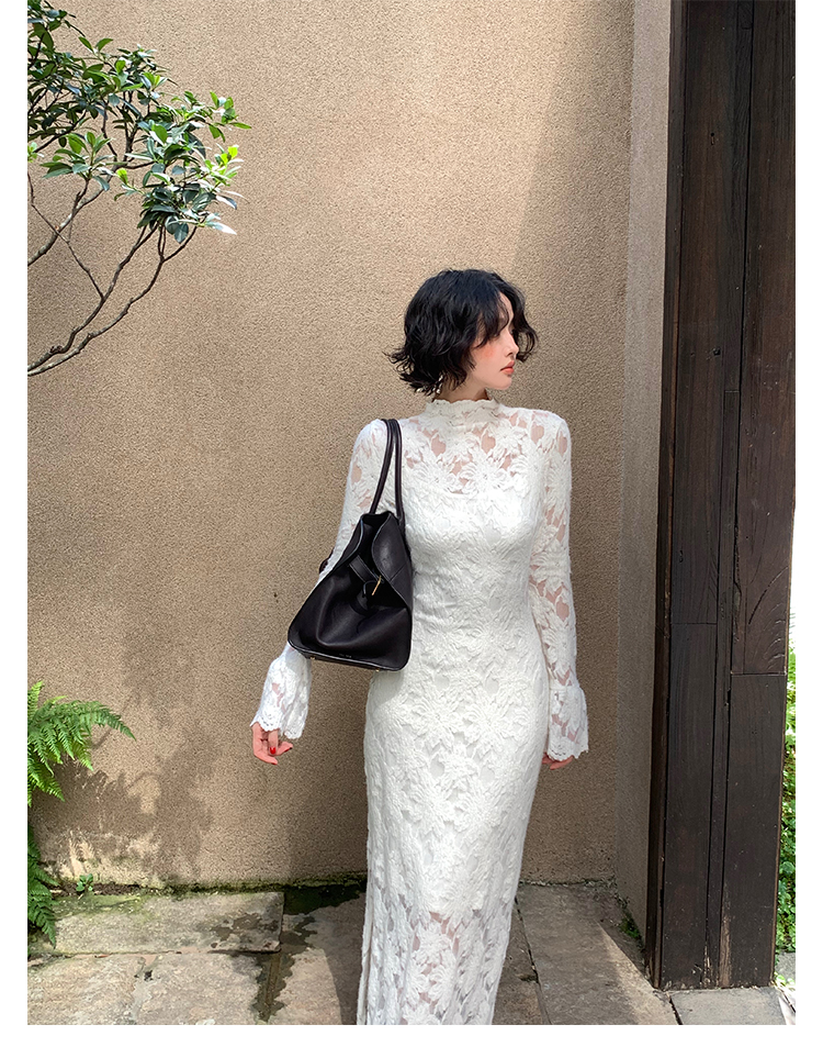 Moonlight Gauze High-Neck Elegant Lace Maxi Dress – French Retro Autumn