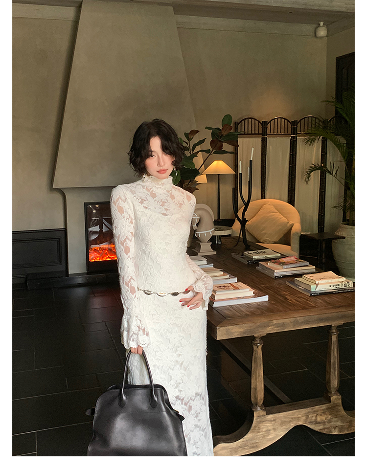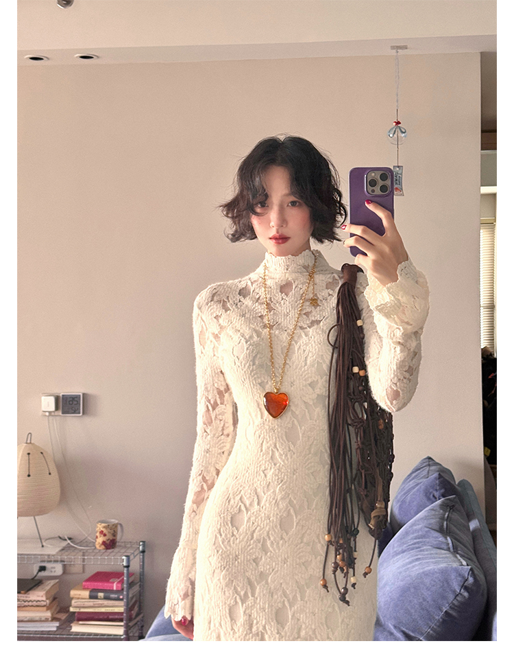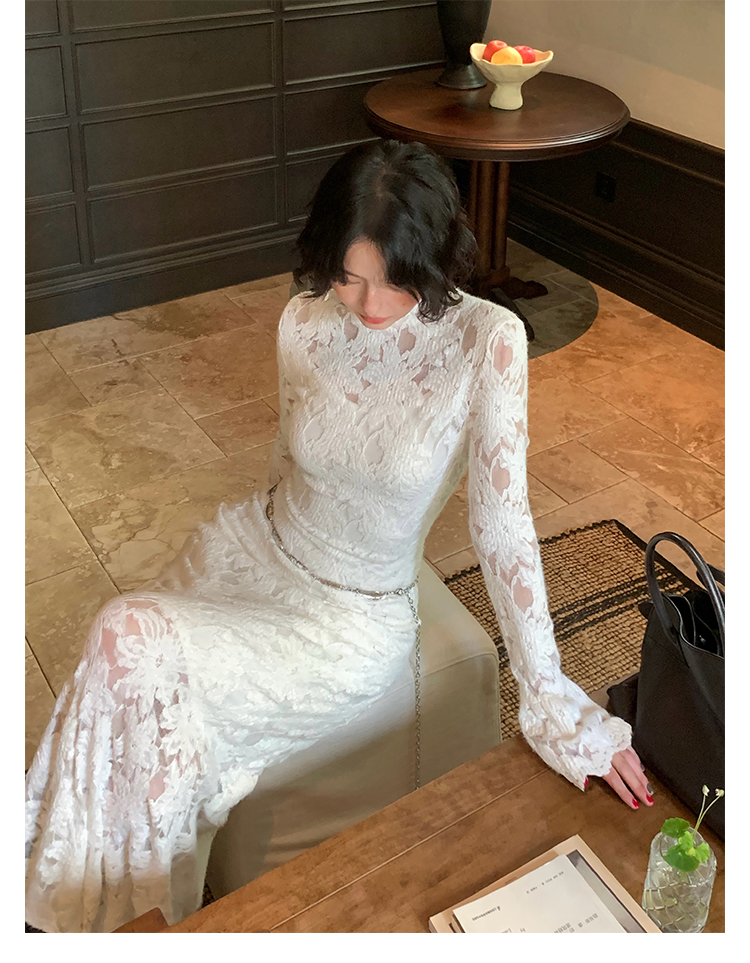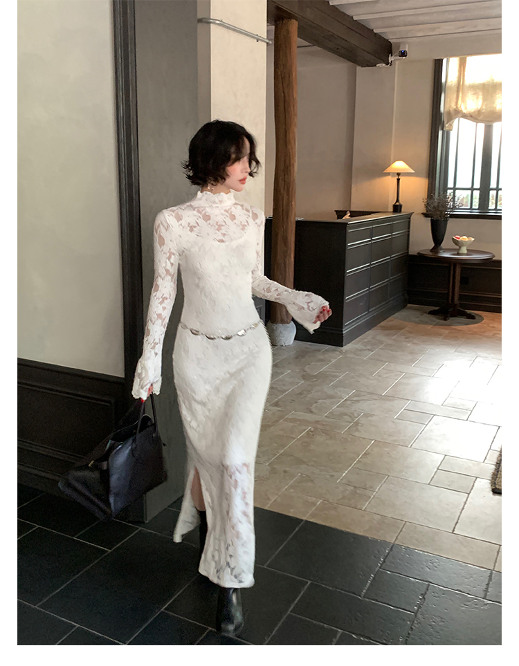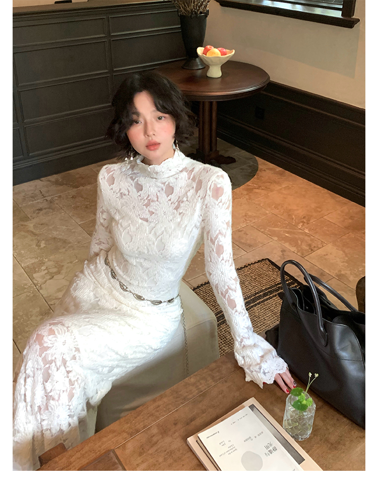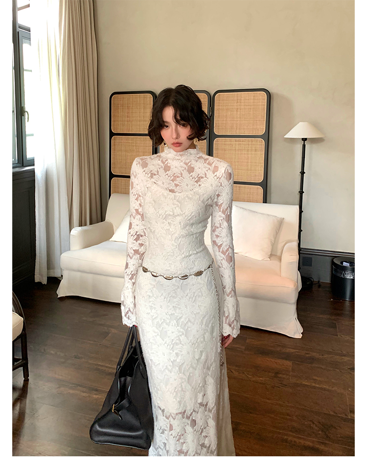 Moonlight Gauze High-Neck Elegant Lace Maxi Dress – French Retro Autumn