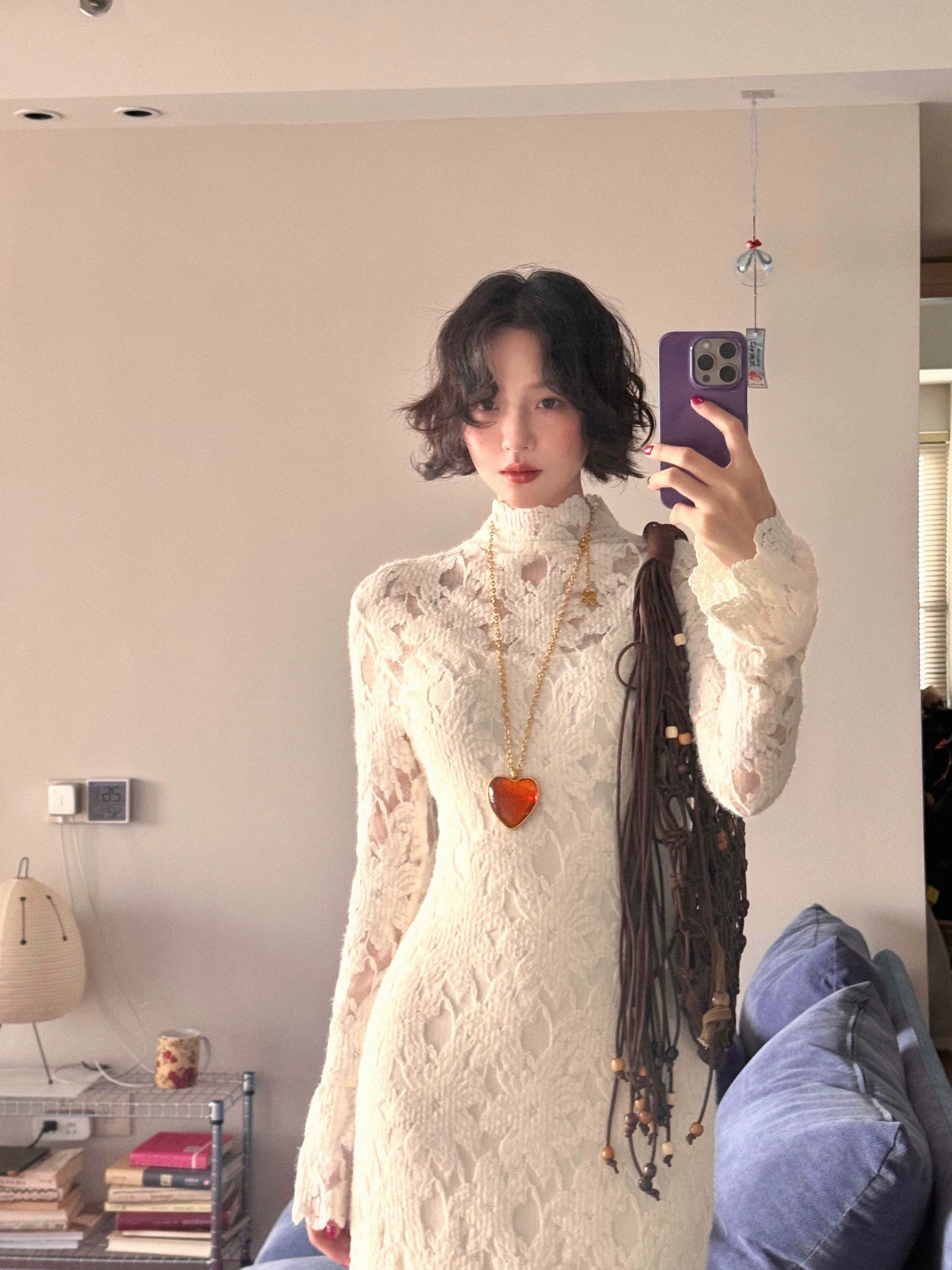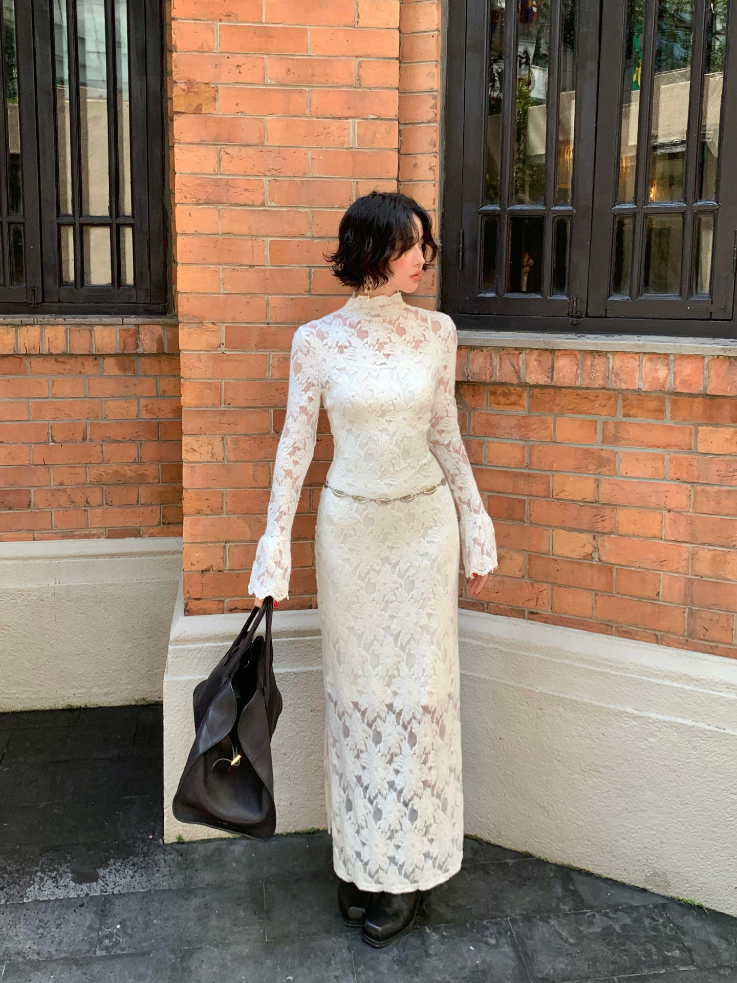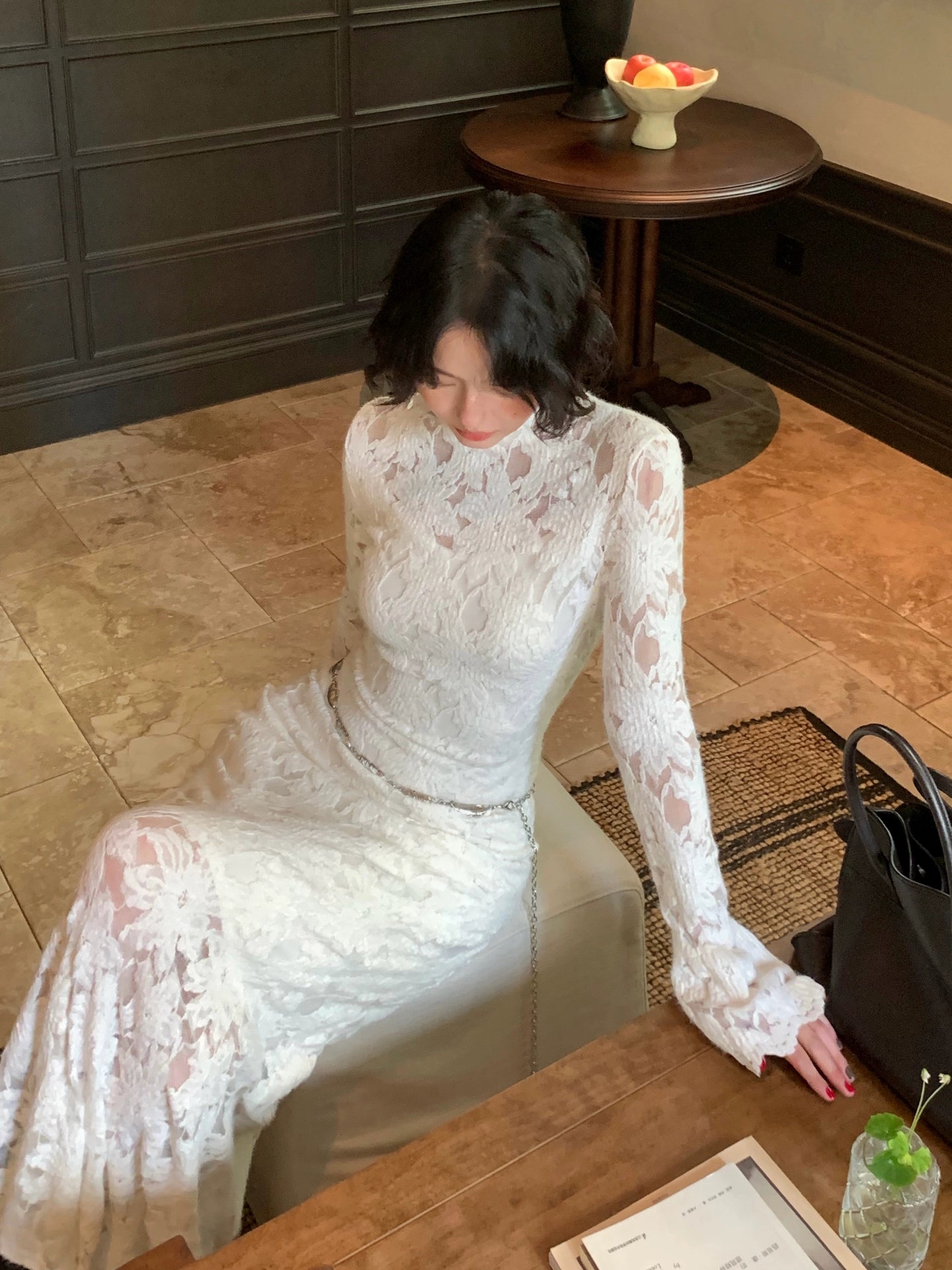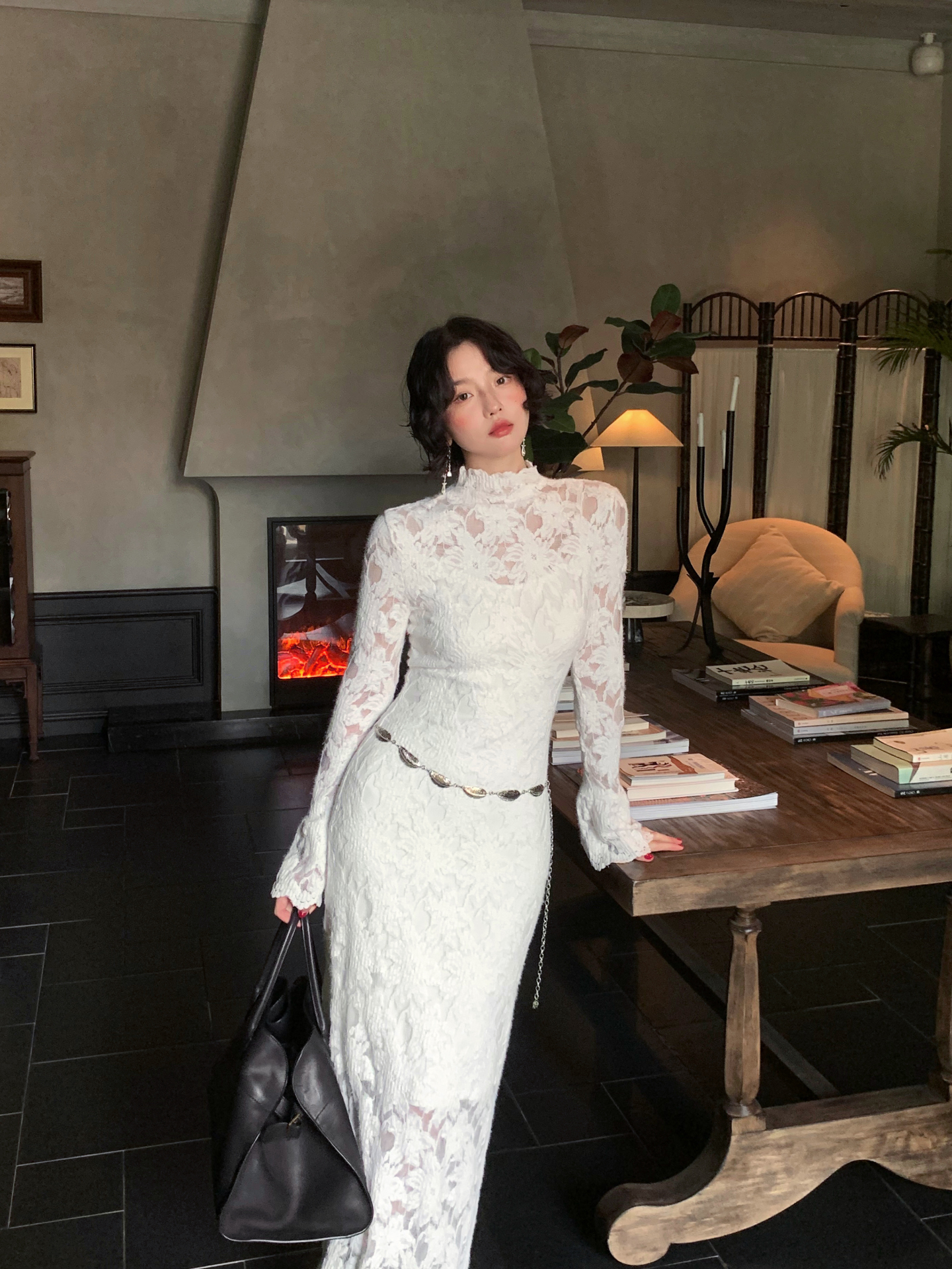 Moonlight Gauze High-Neck Elegant Lace Maxi Dress – French Retro Autumn