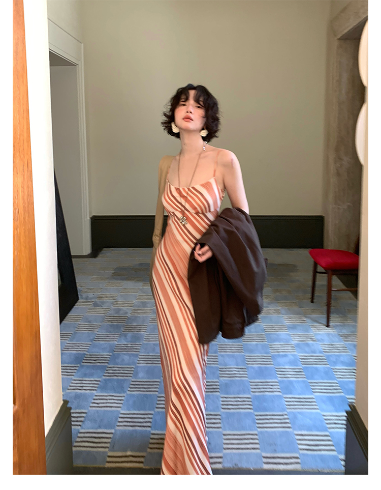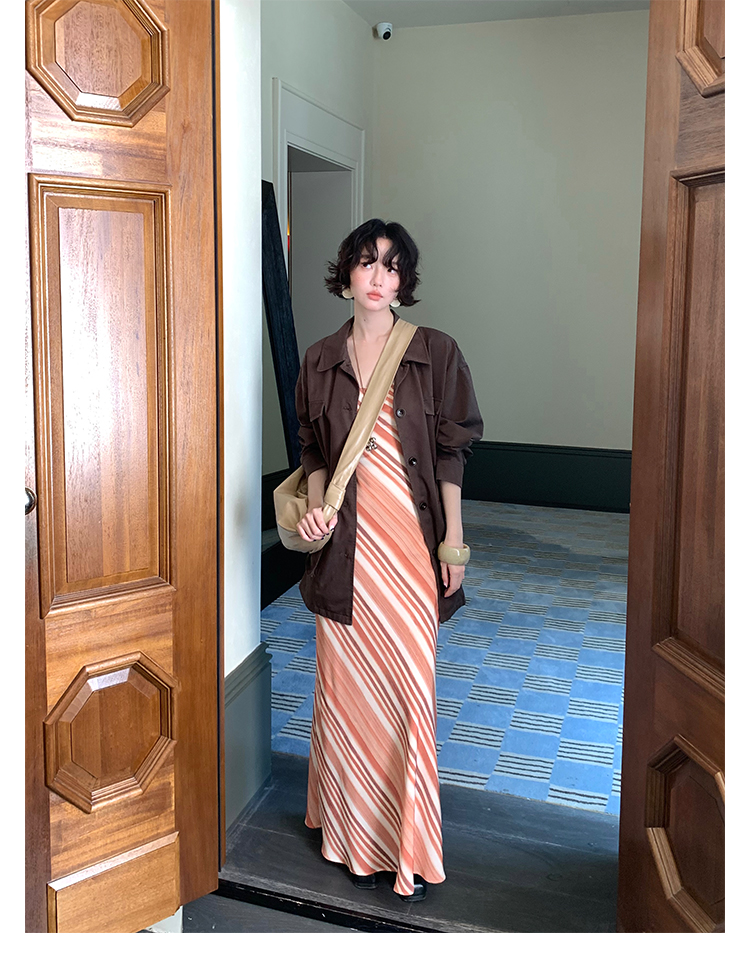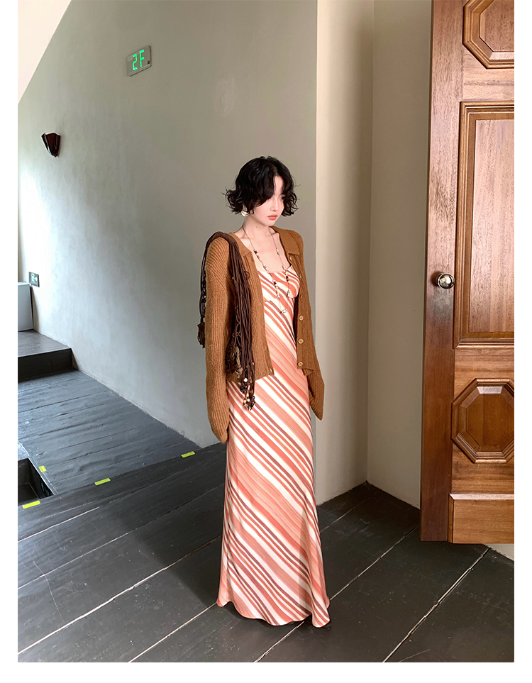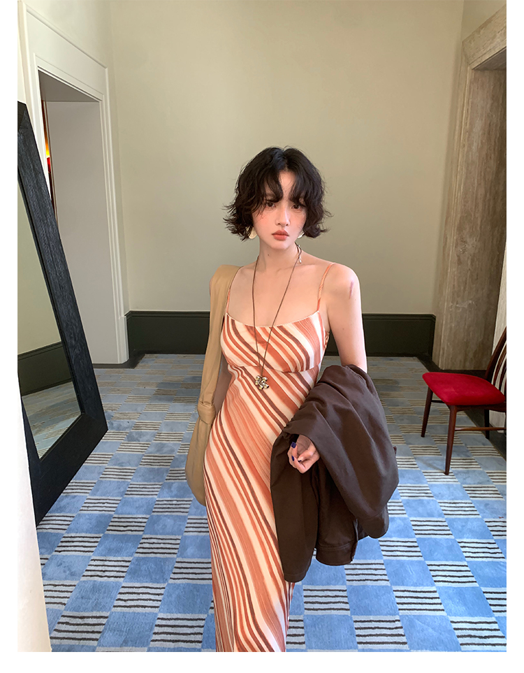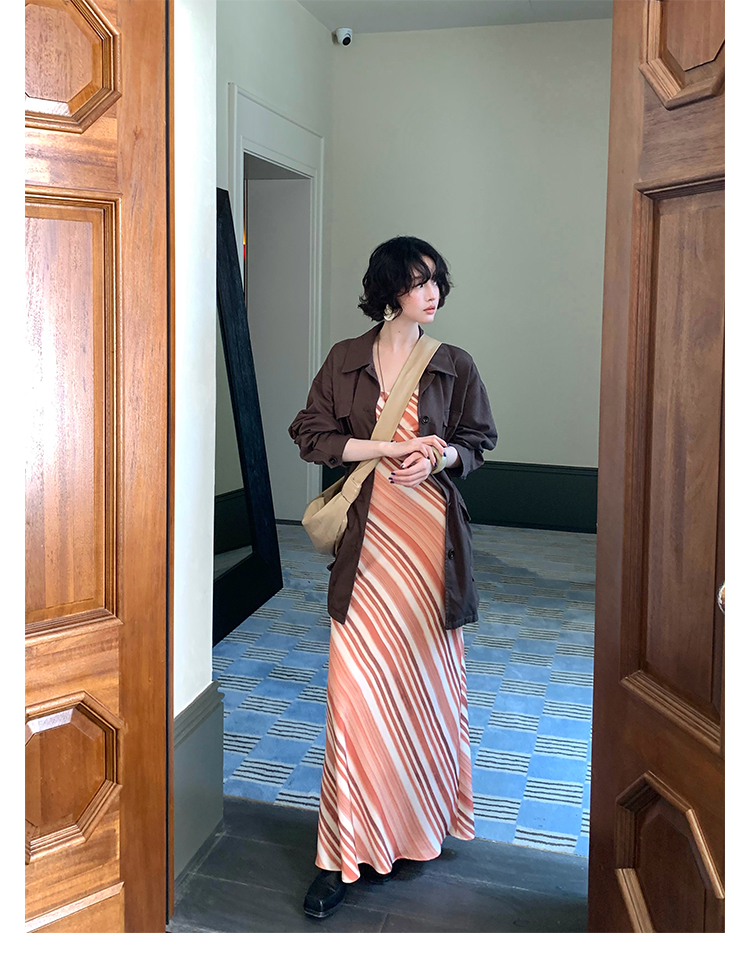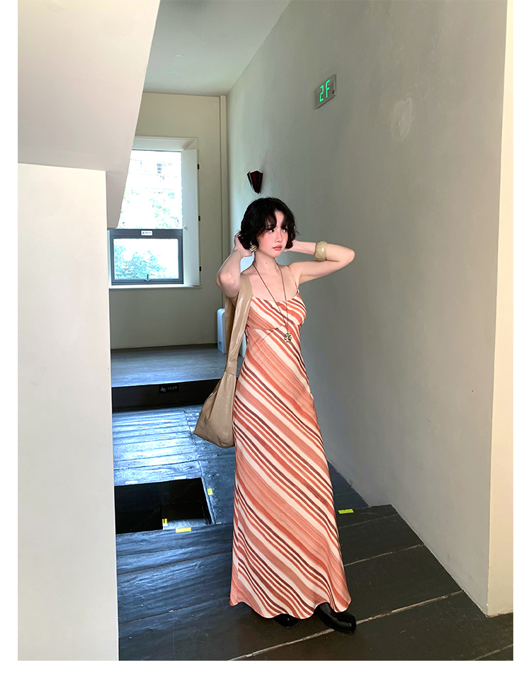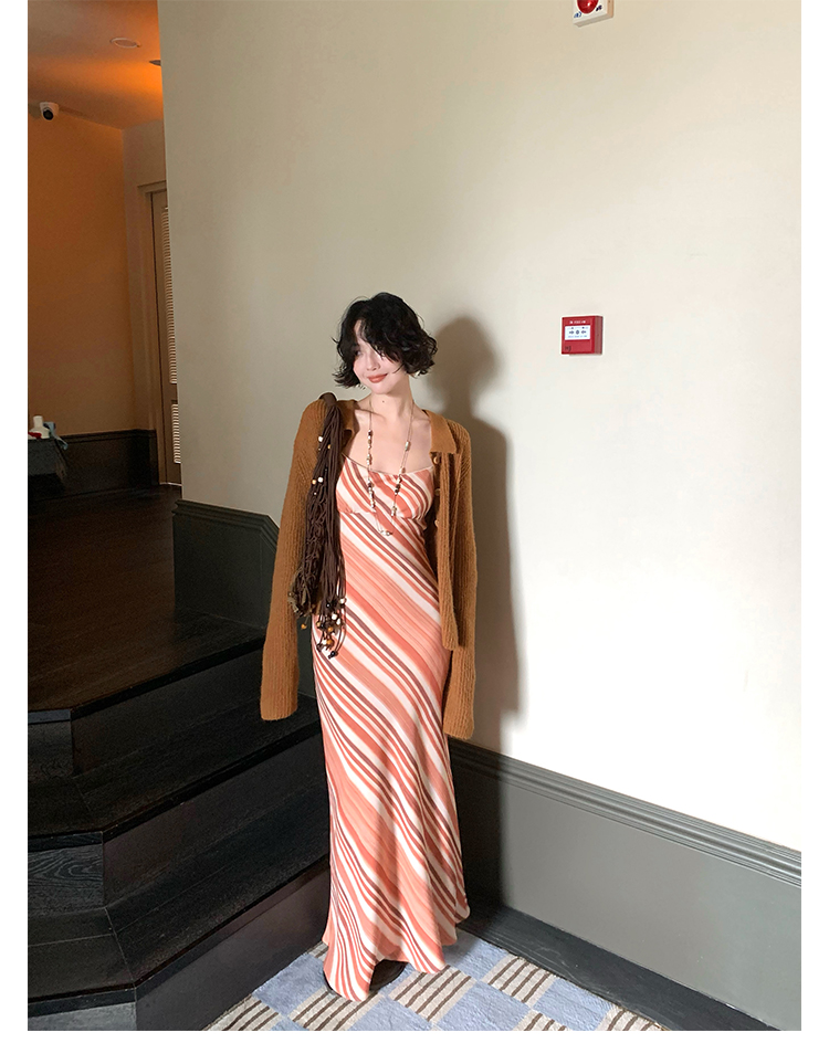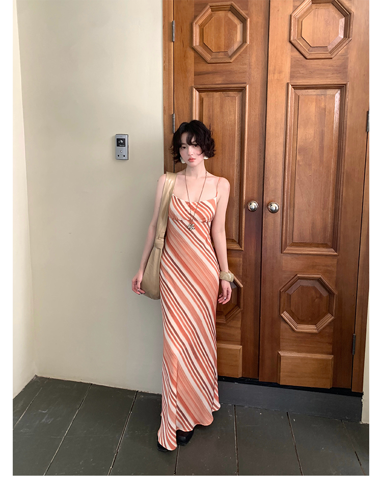 Orange Trace Draped Stripe Slip Dress – French Retro Layered Long Dress