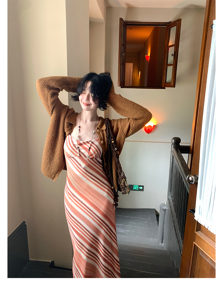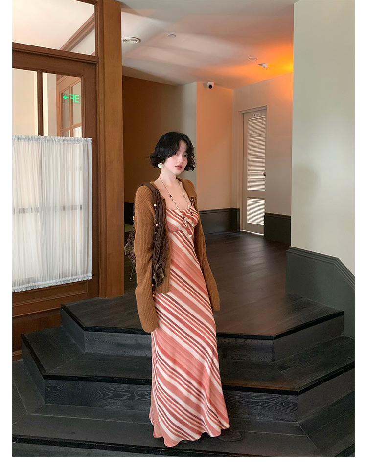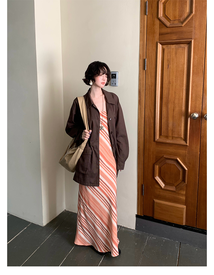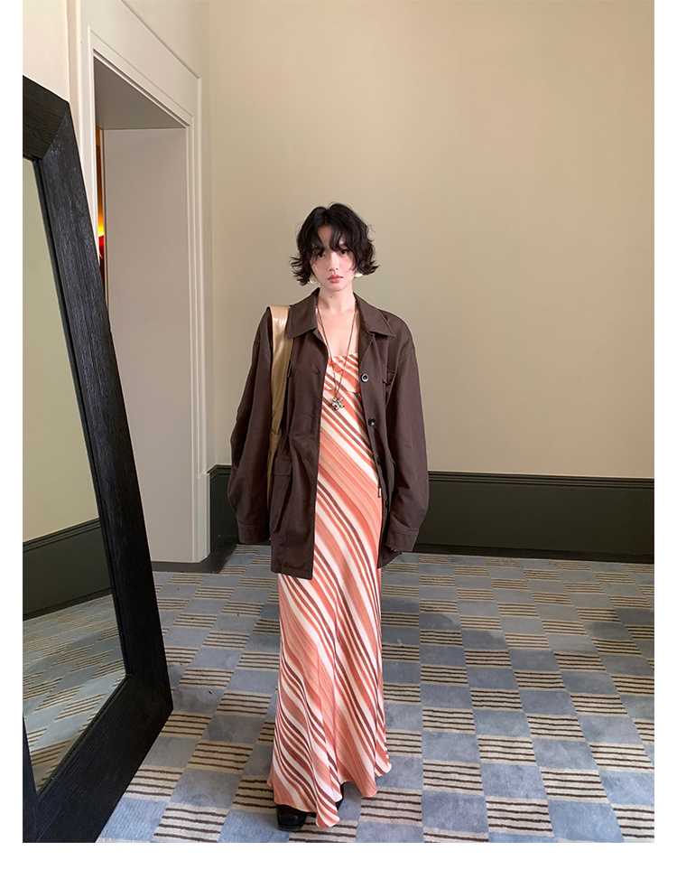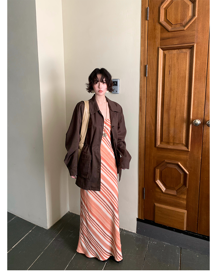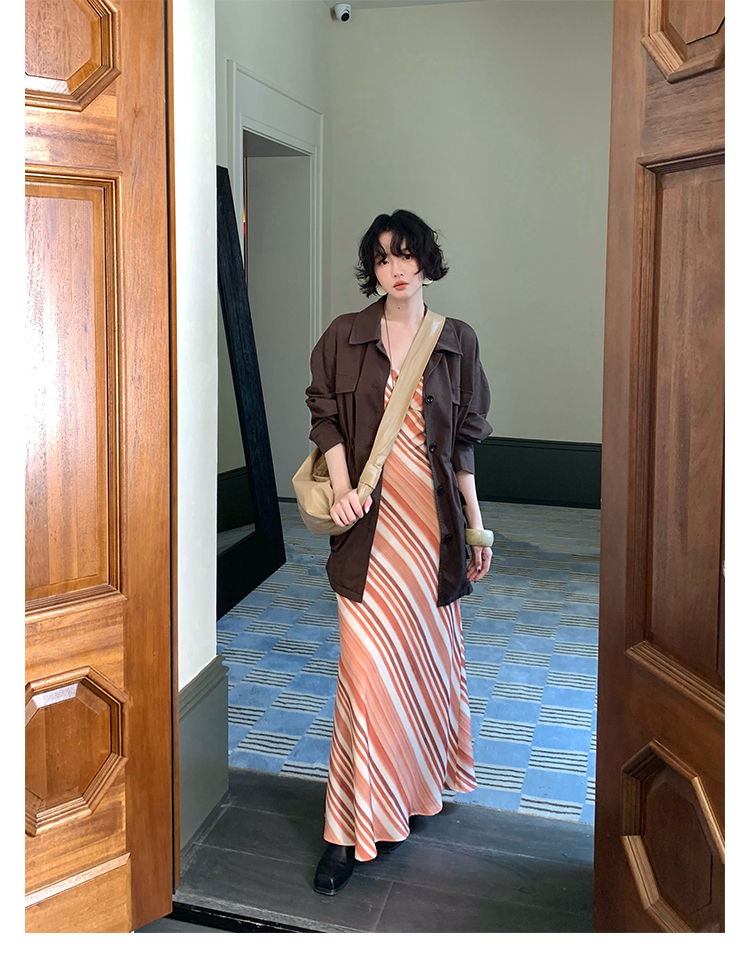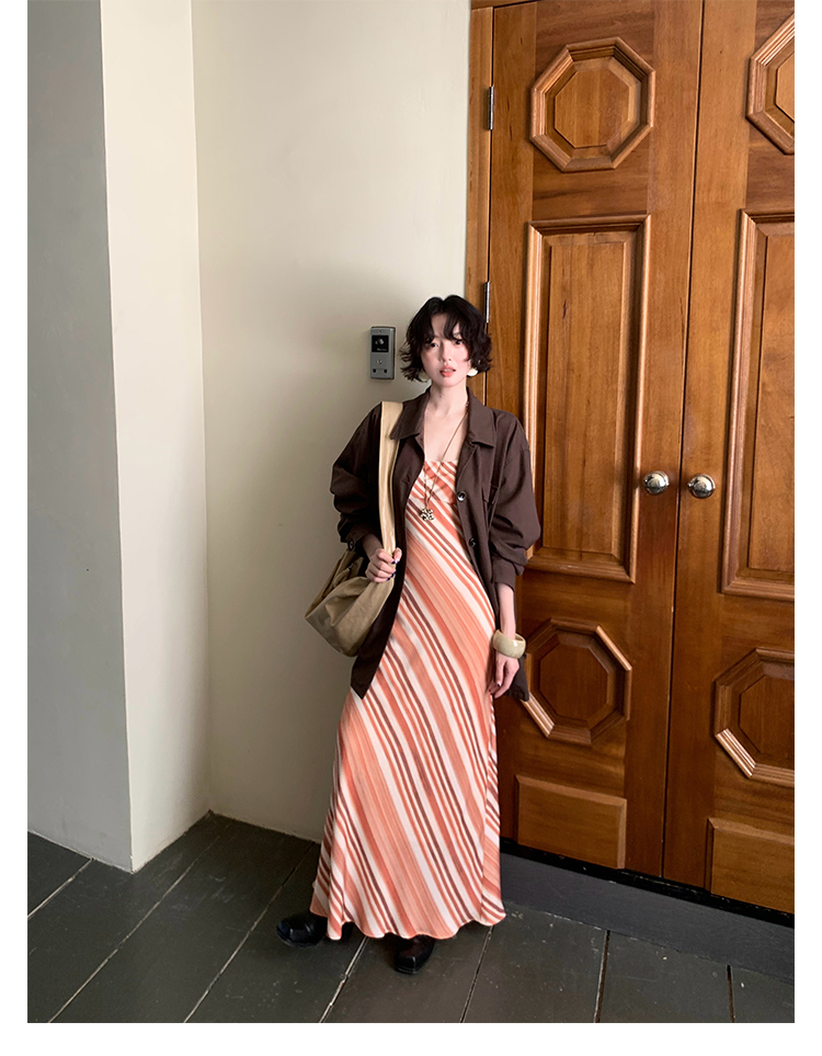 Orange Trace Draped Stripe Slip Dress – French Retro Layered Long Dress