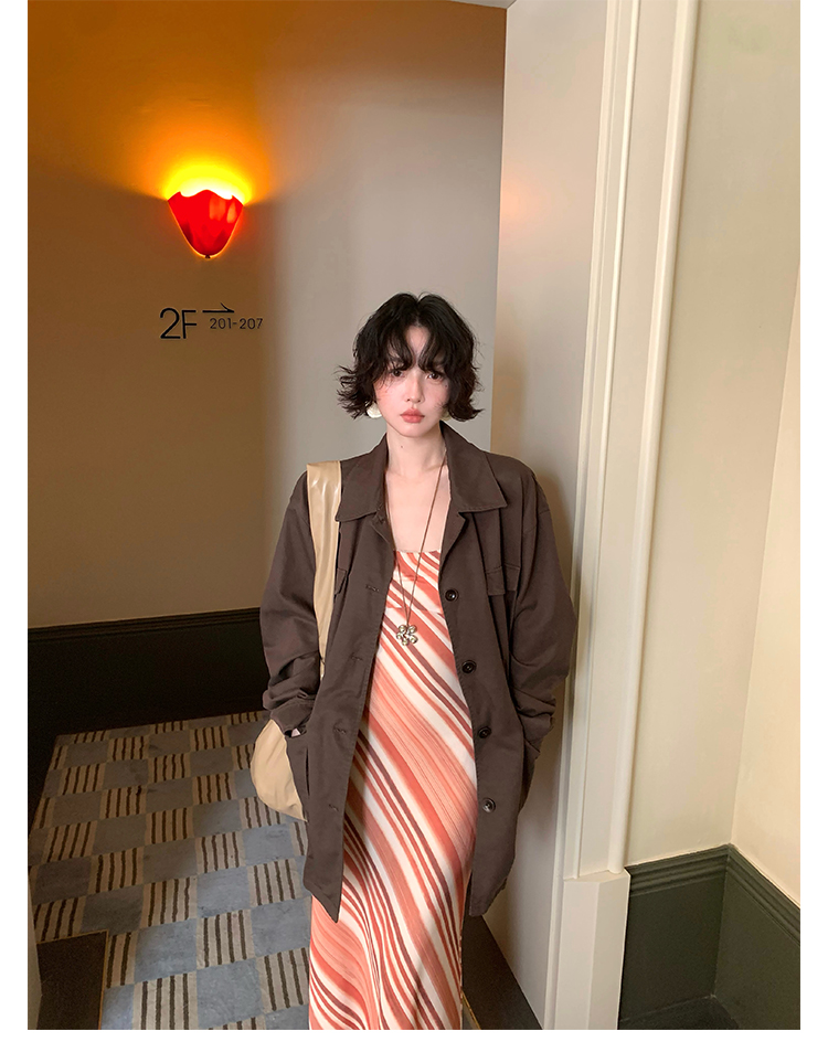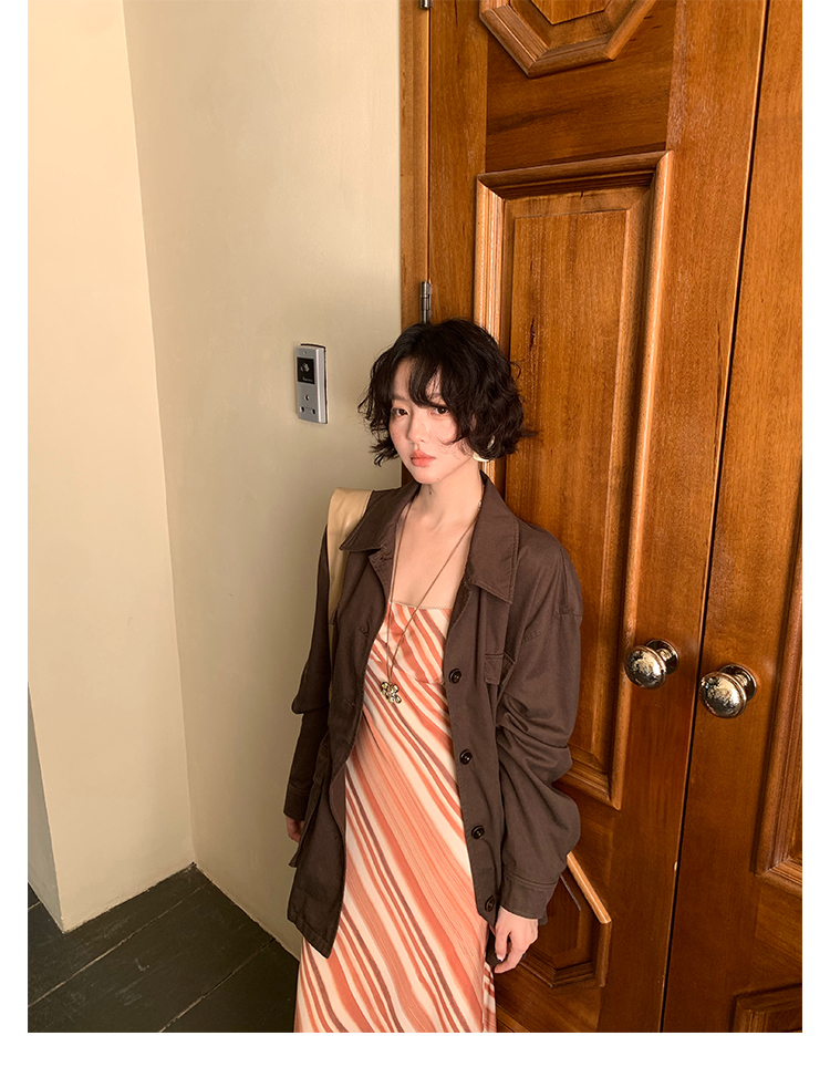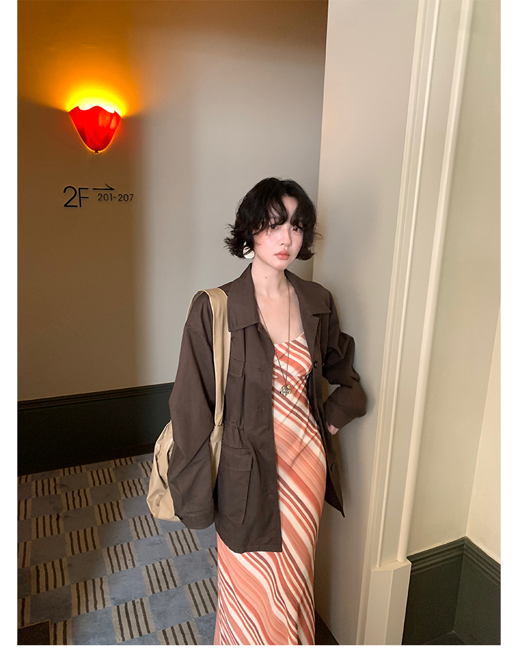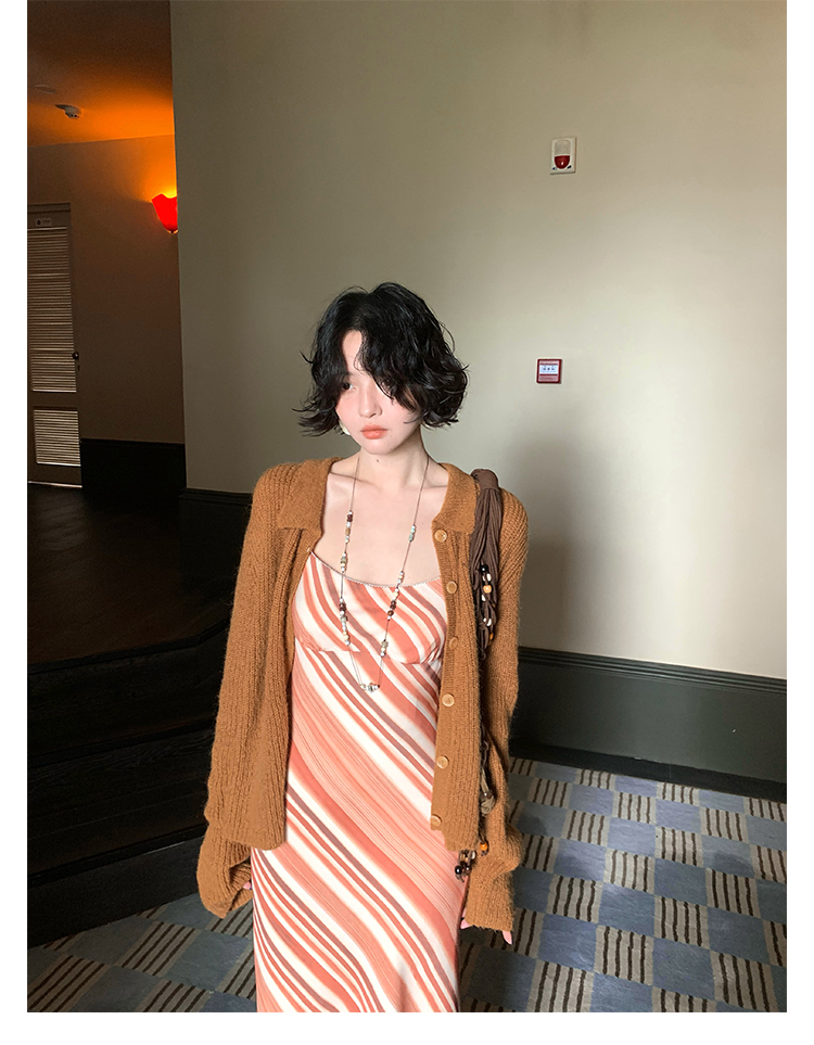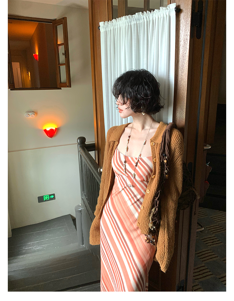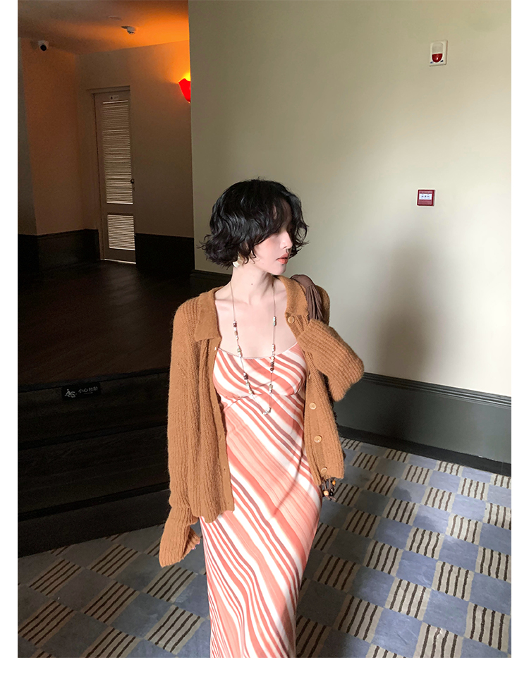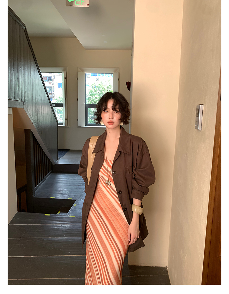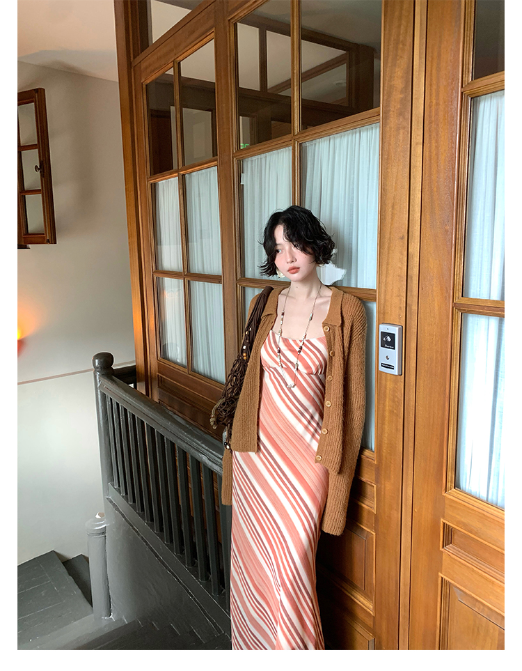 Orange Trace Draped Stripe Slip Dress – French Retro Layered Long Dress