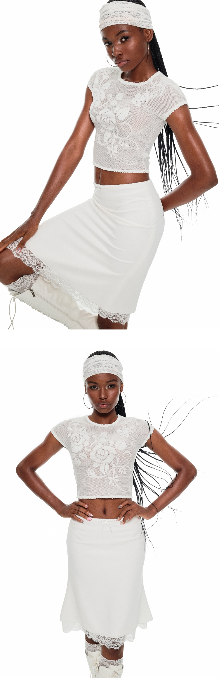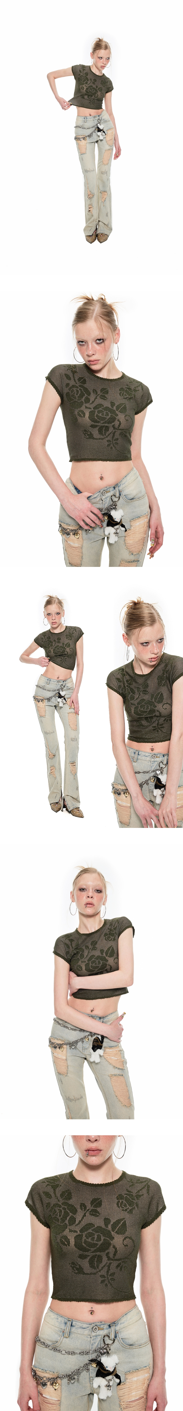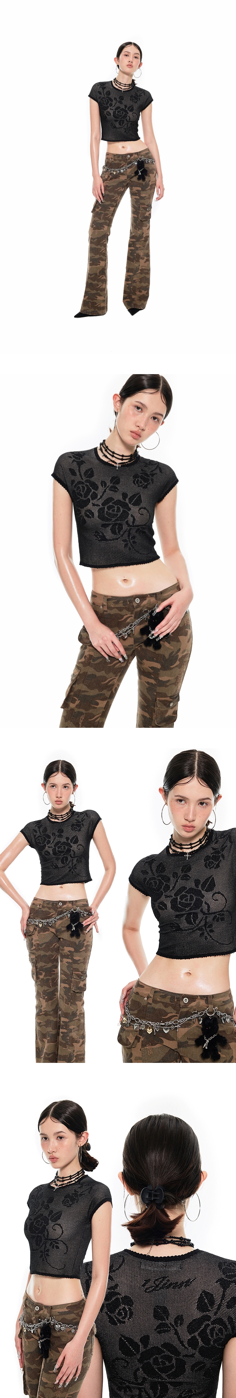 Rose Cutout Glitter Knit T-Shirt – Sheer Short Sleeve Slim Crop Top