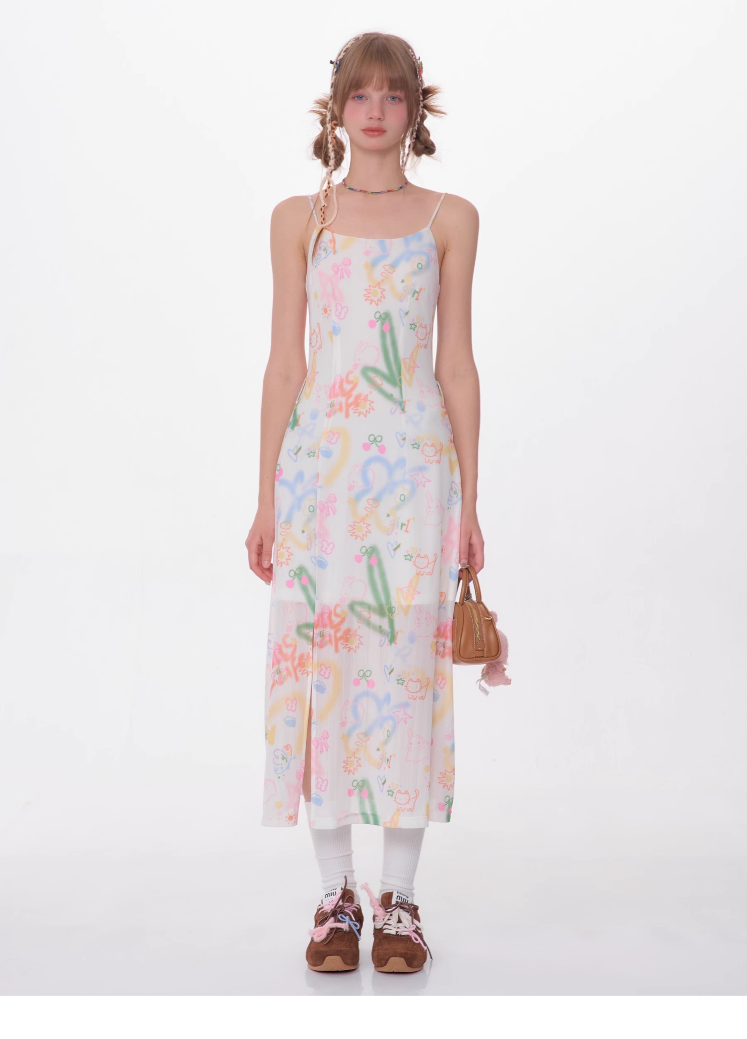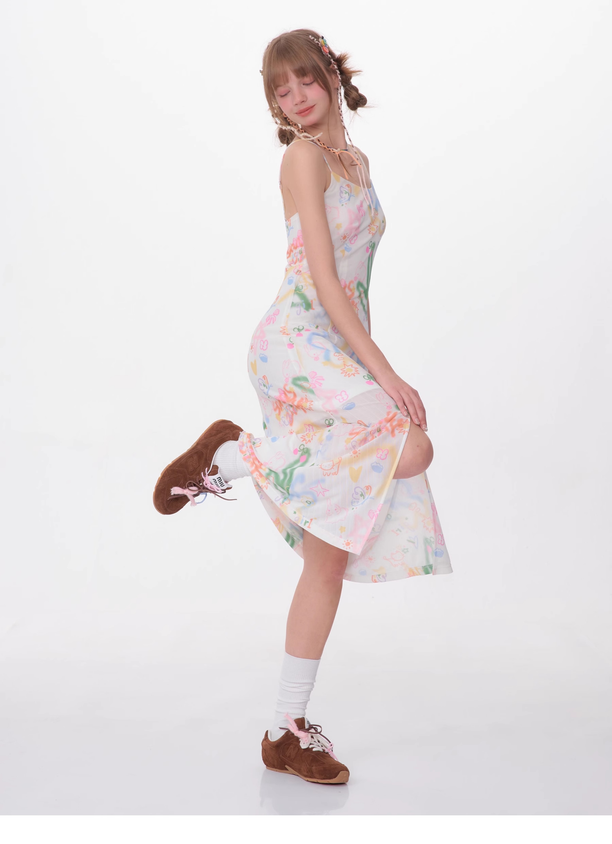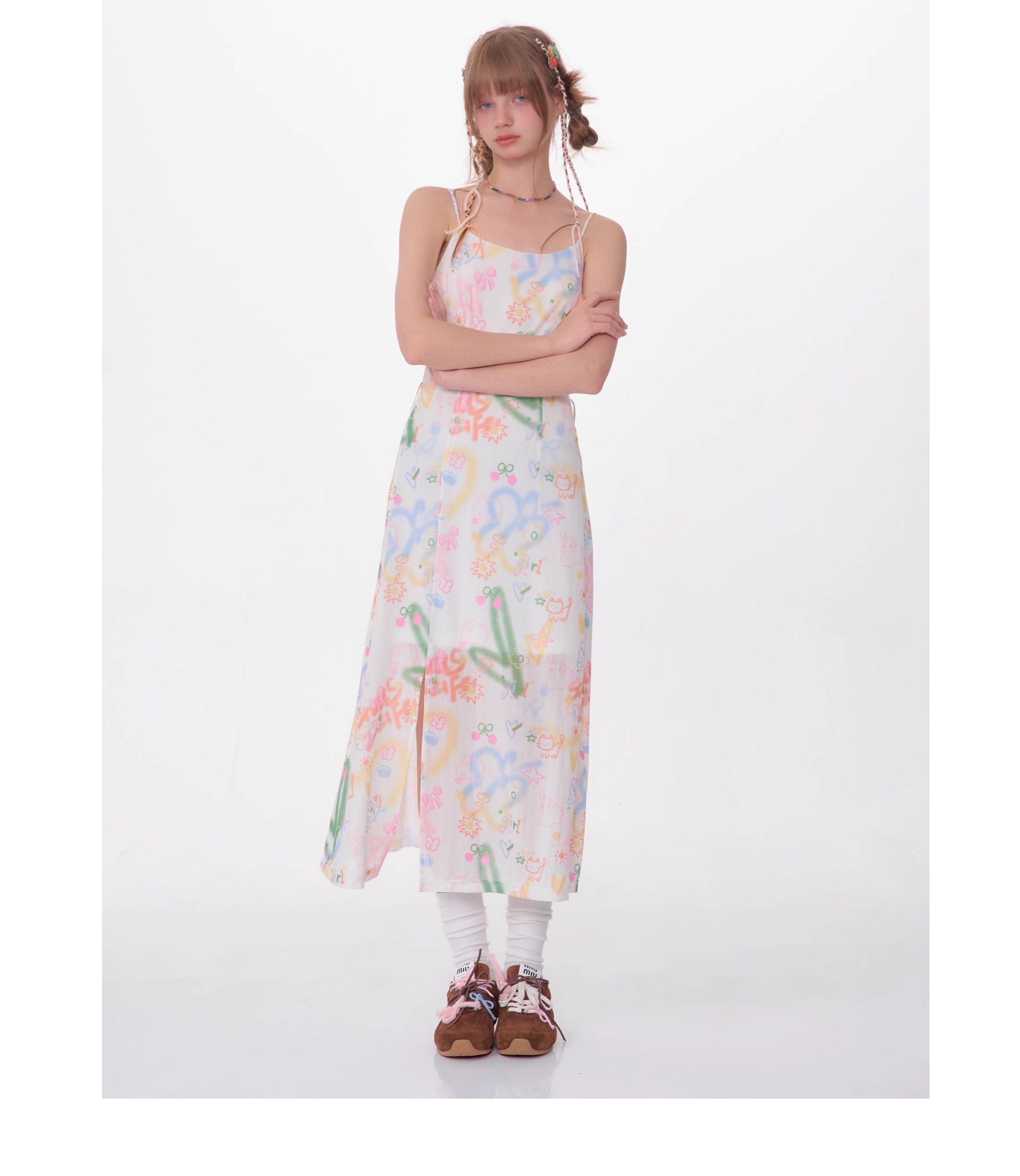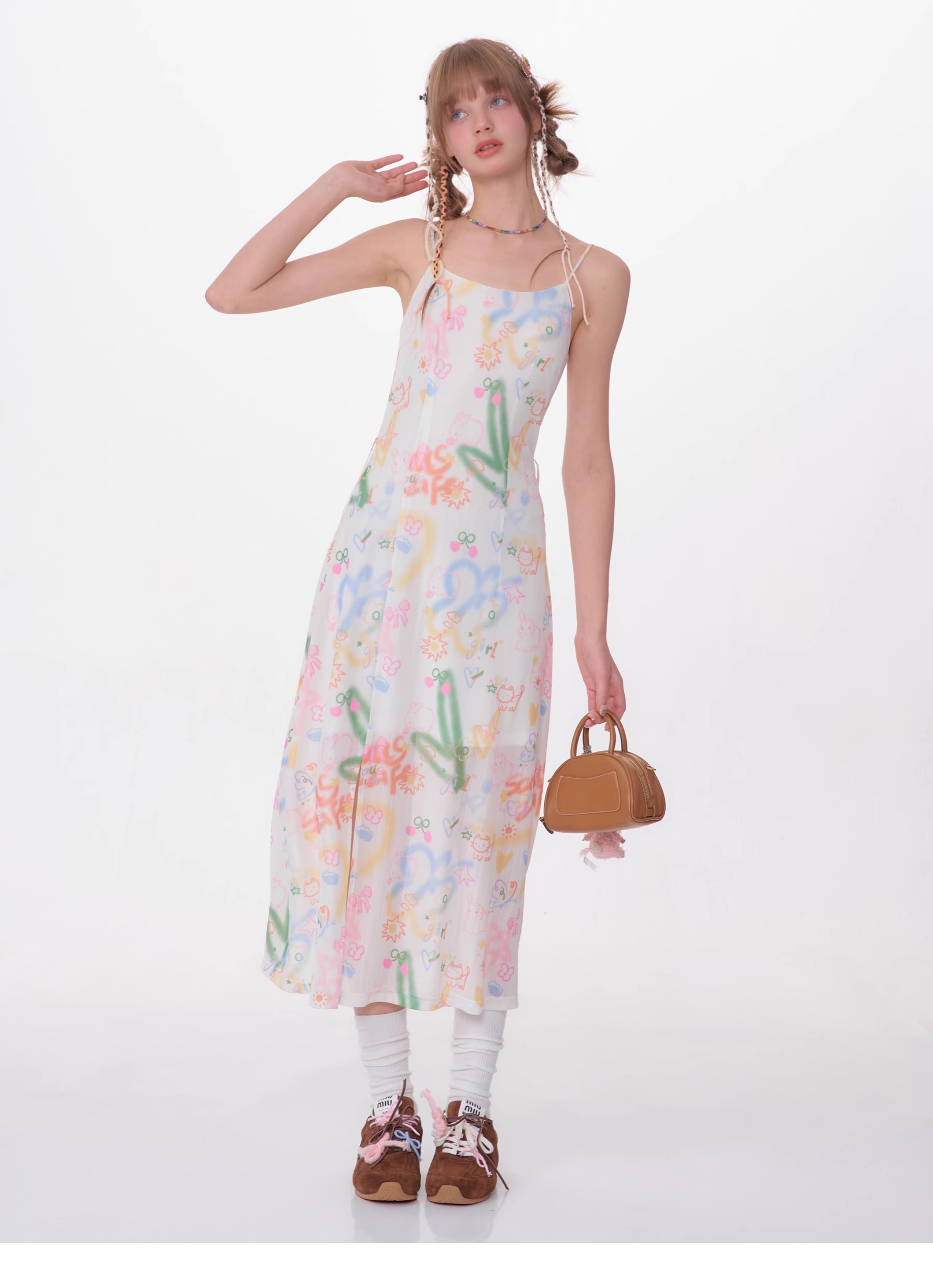 Платье на бретелях с принтом граффити | Длинная юбка приталенного кроя в стиле ретро весна/лето