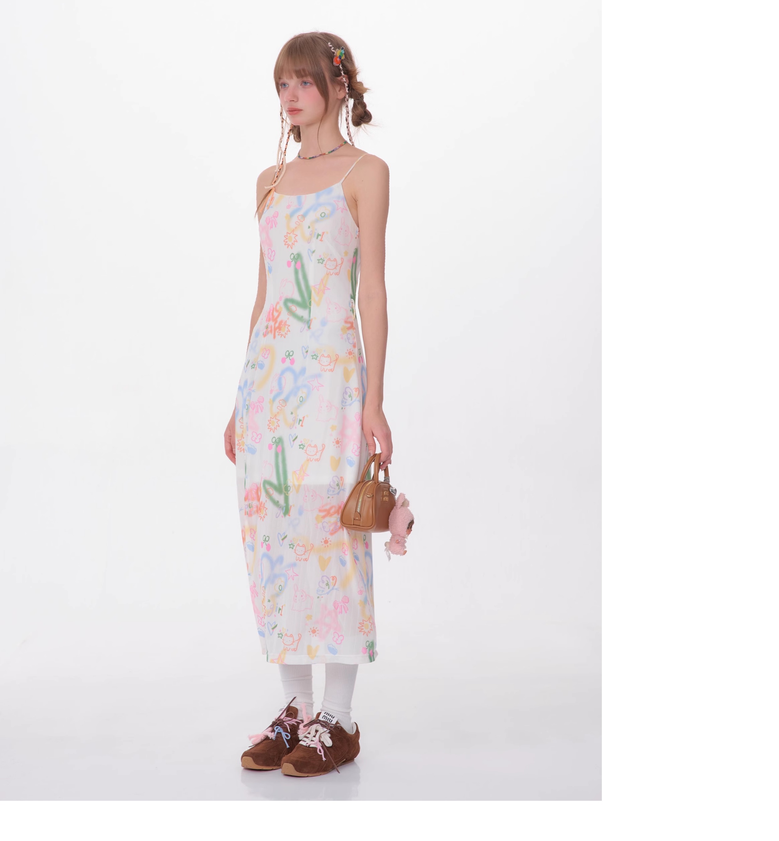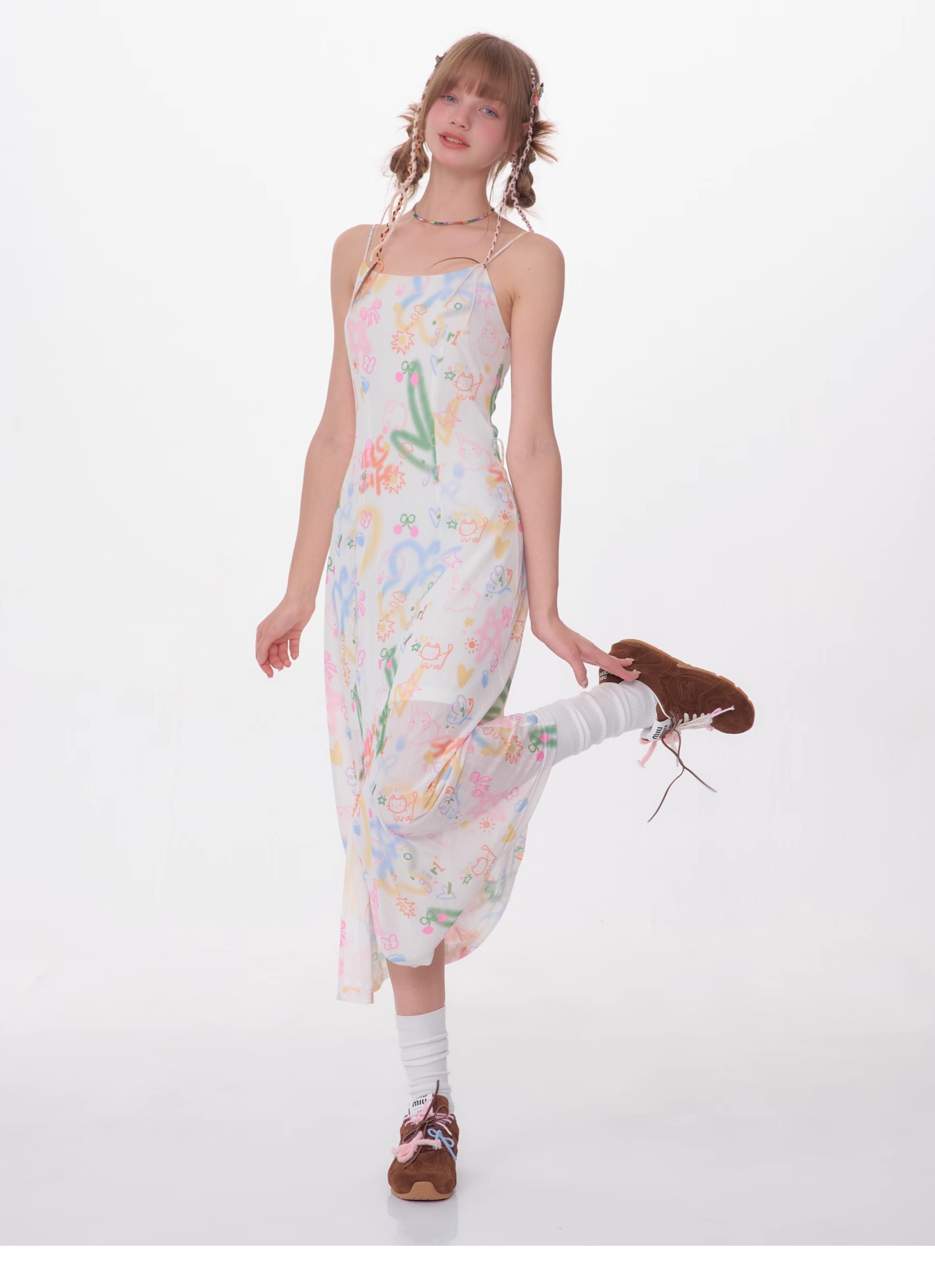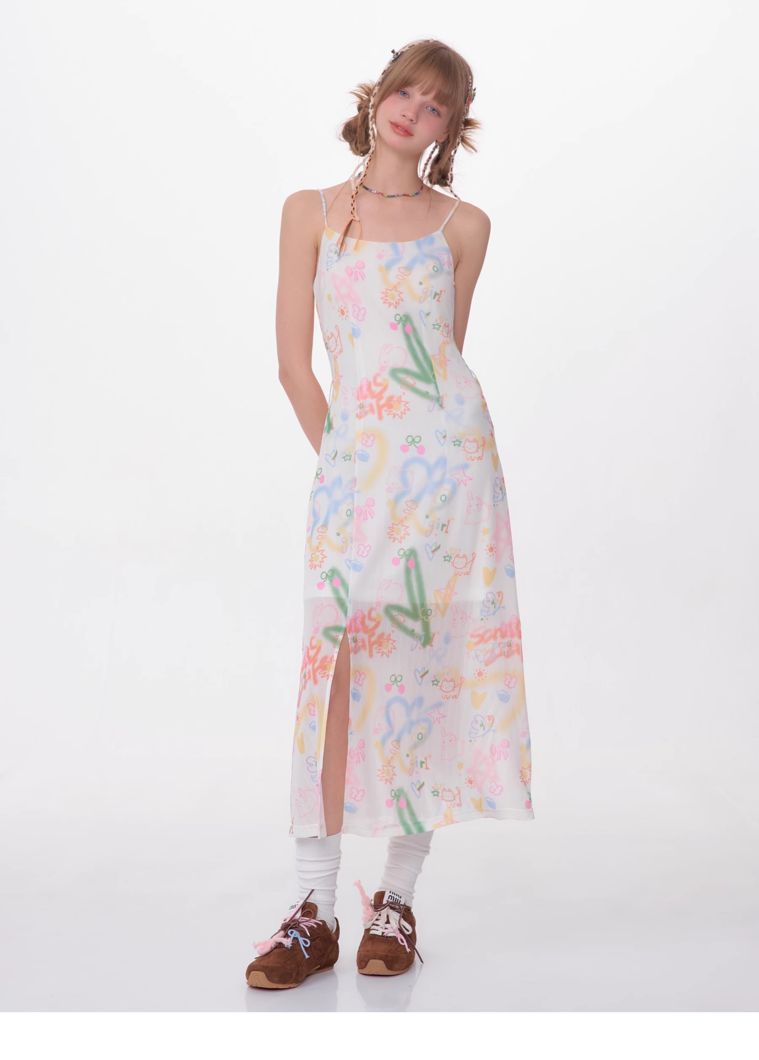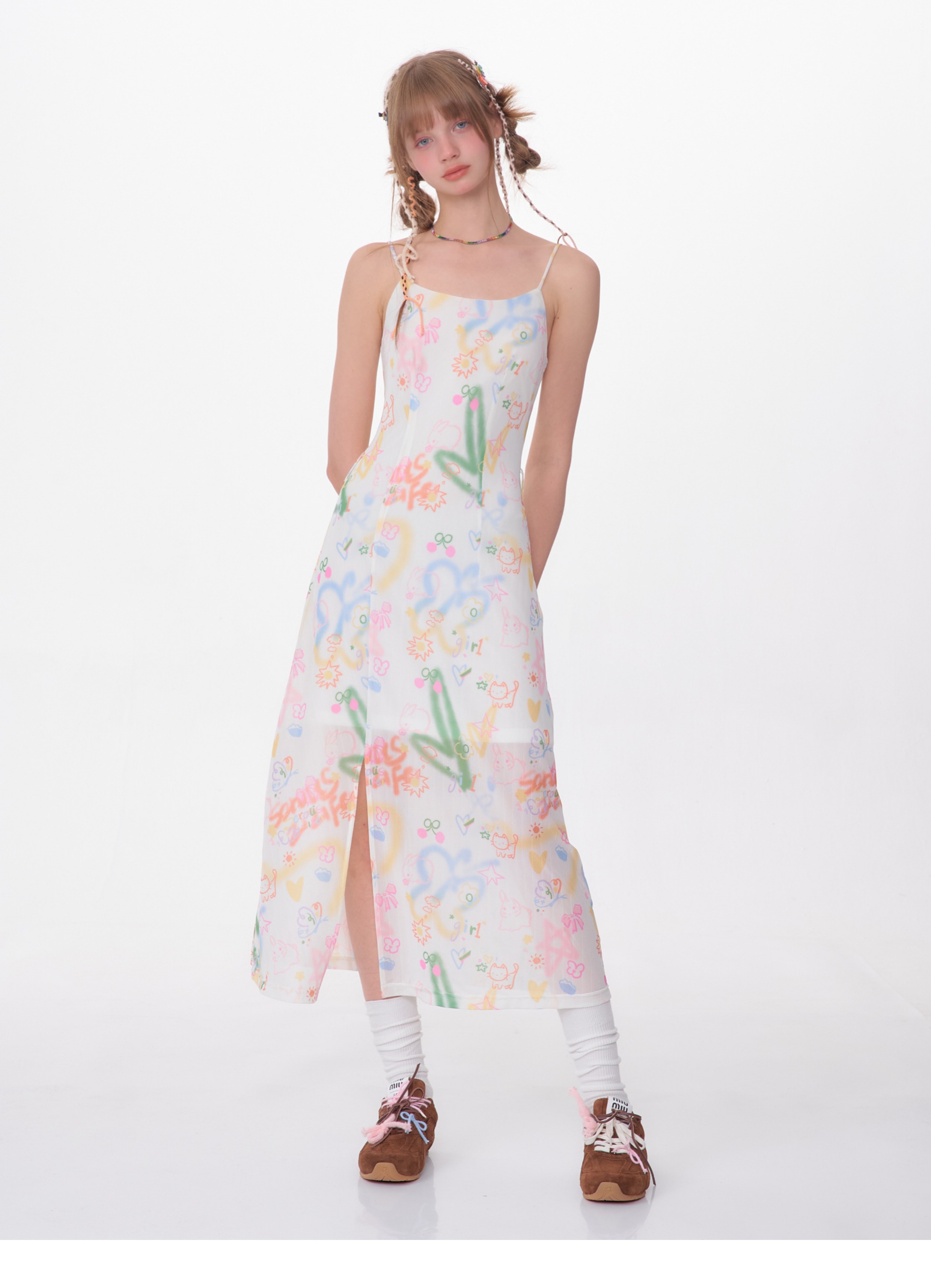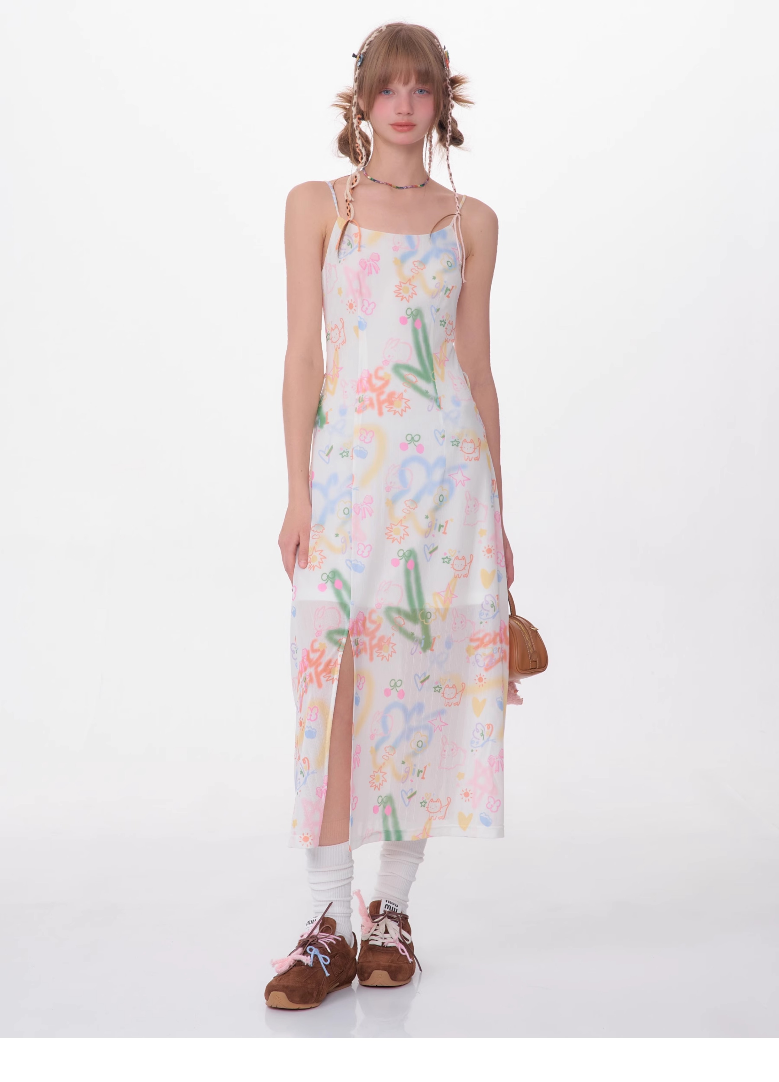 Платье на бретелях с принтом граффити | Длинная юбка приталенного кроя в стиле ретро весна/лето