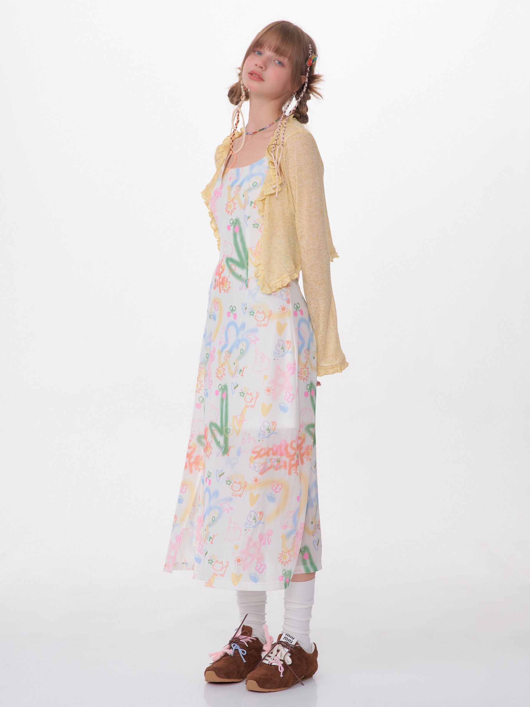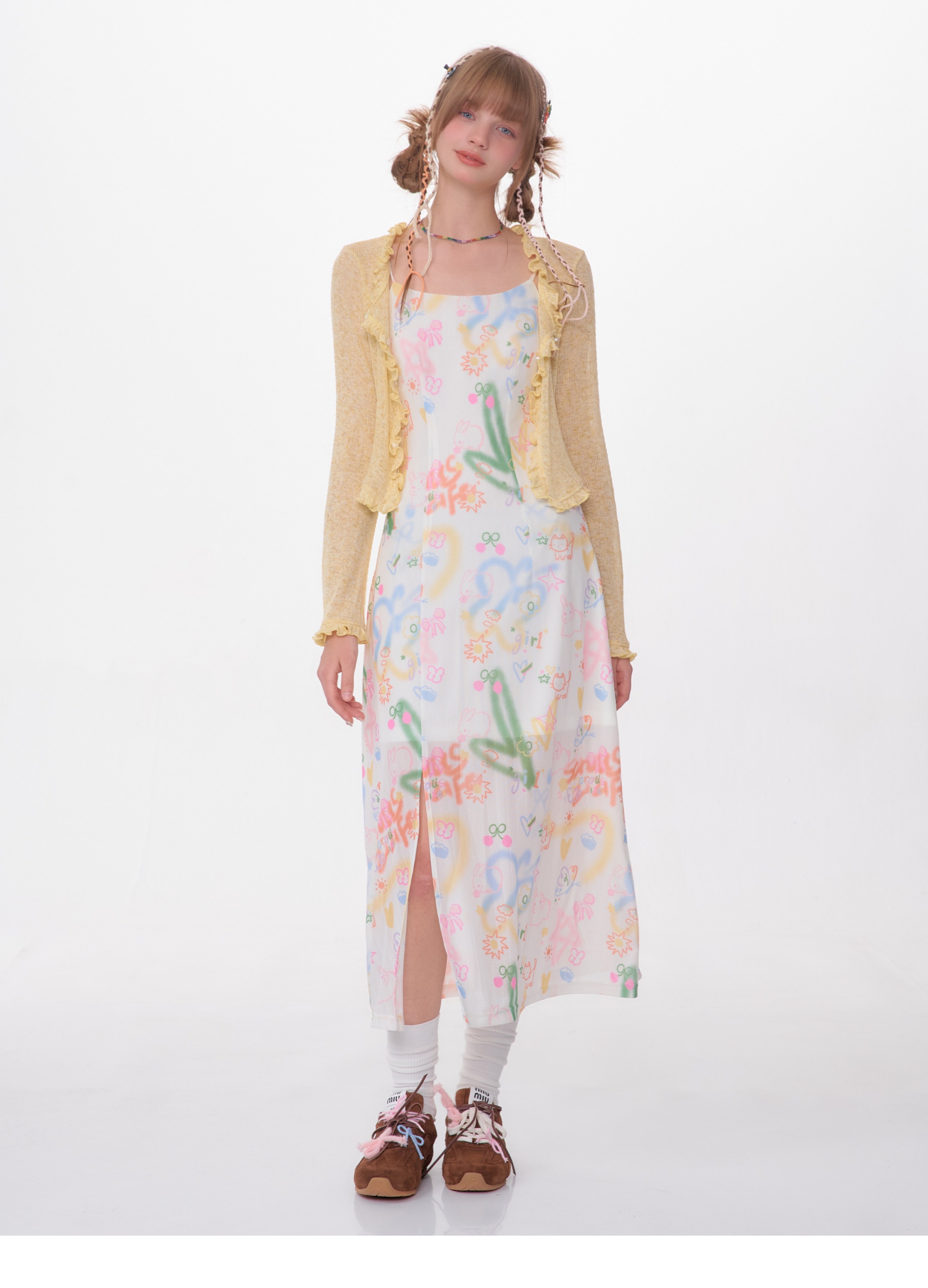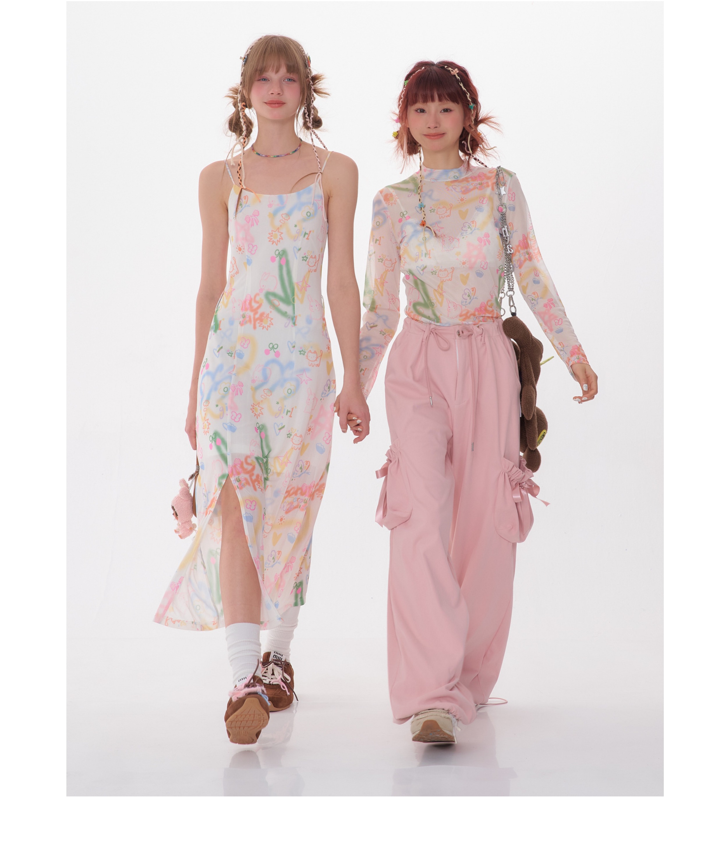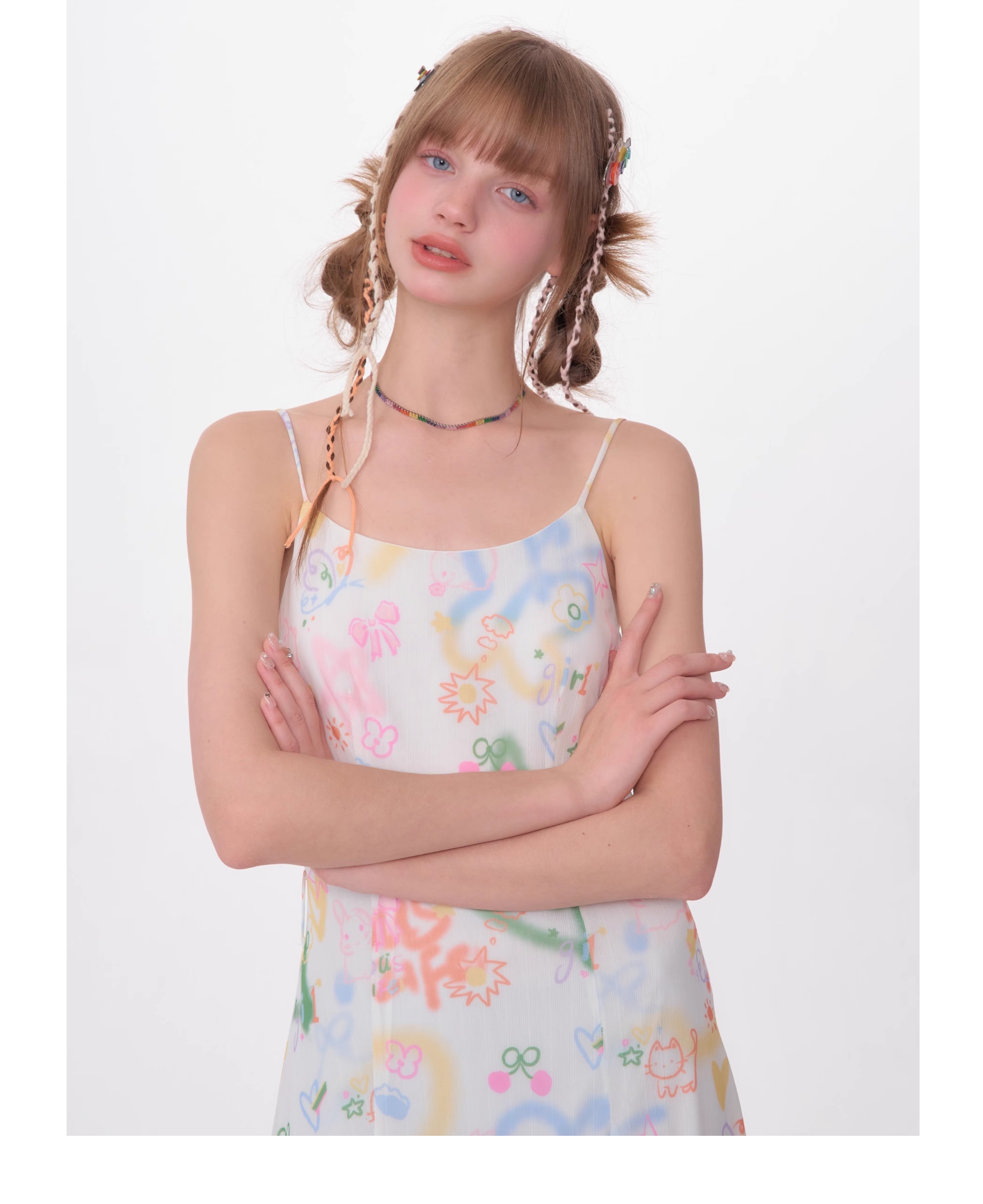 Платье на бретелях с принтом граффити | Длинная юбка приталенного кроя в стиле ретро весна/лето