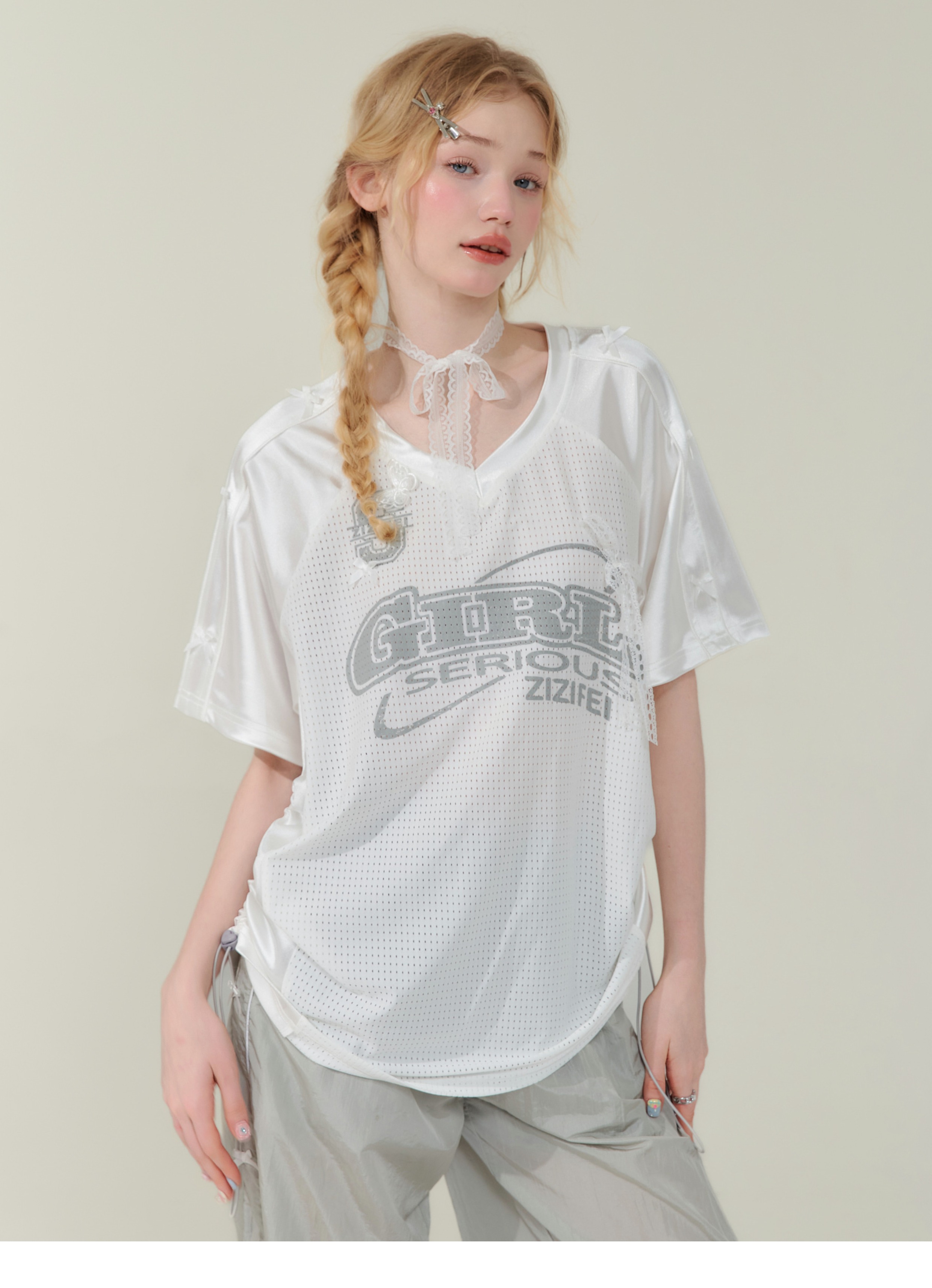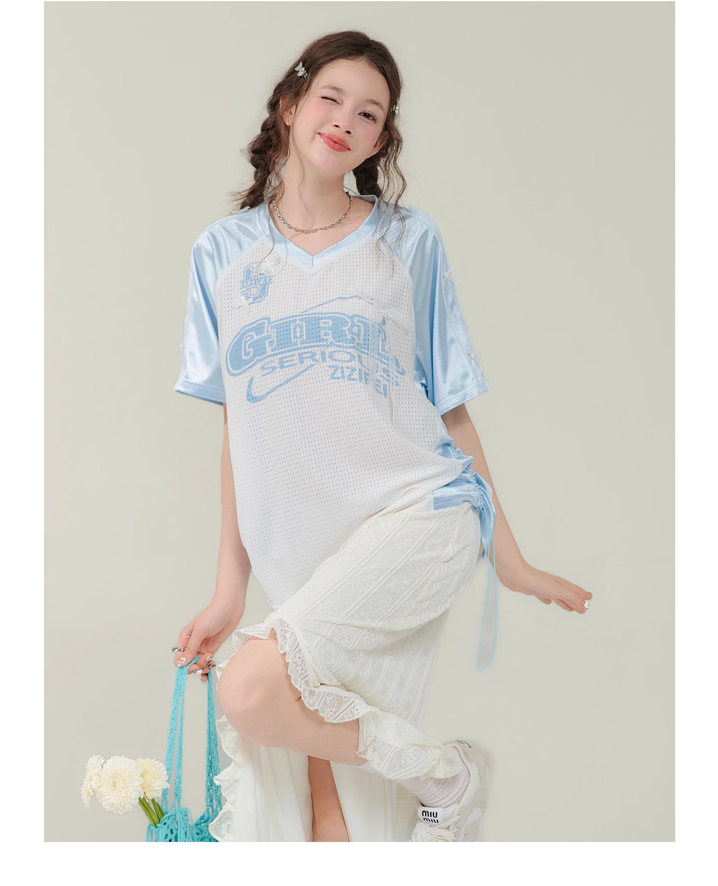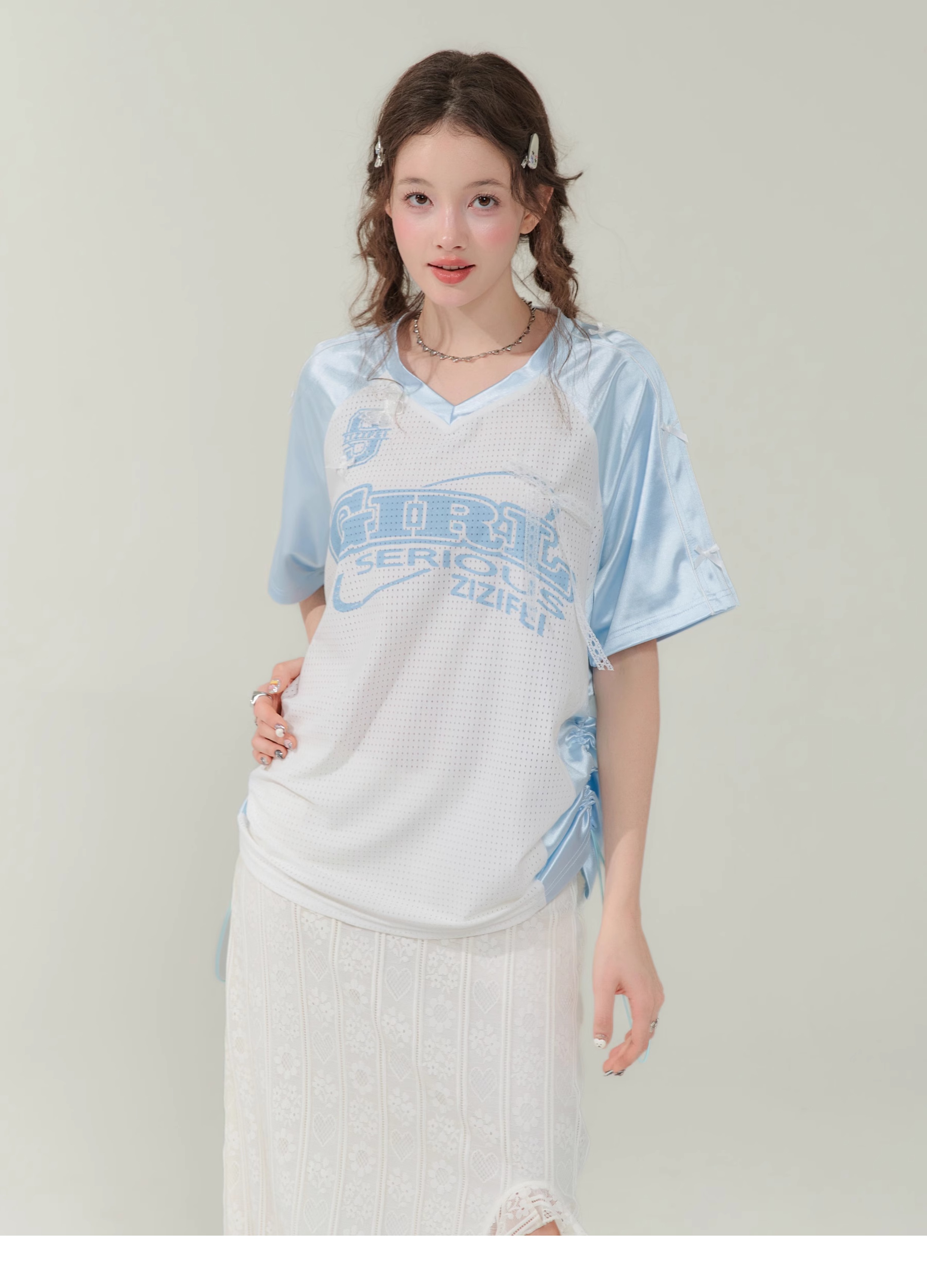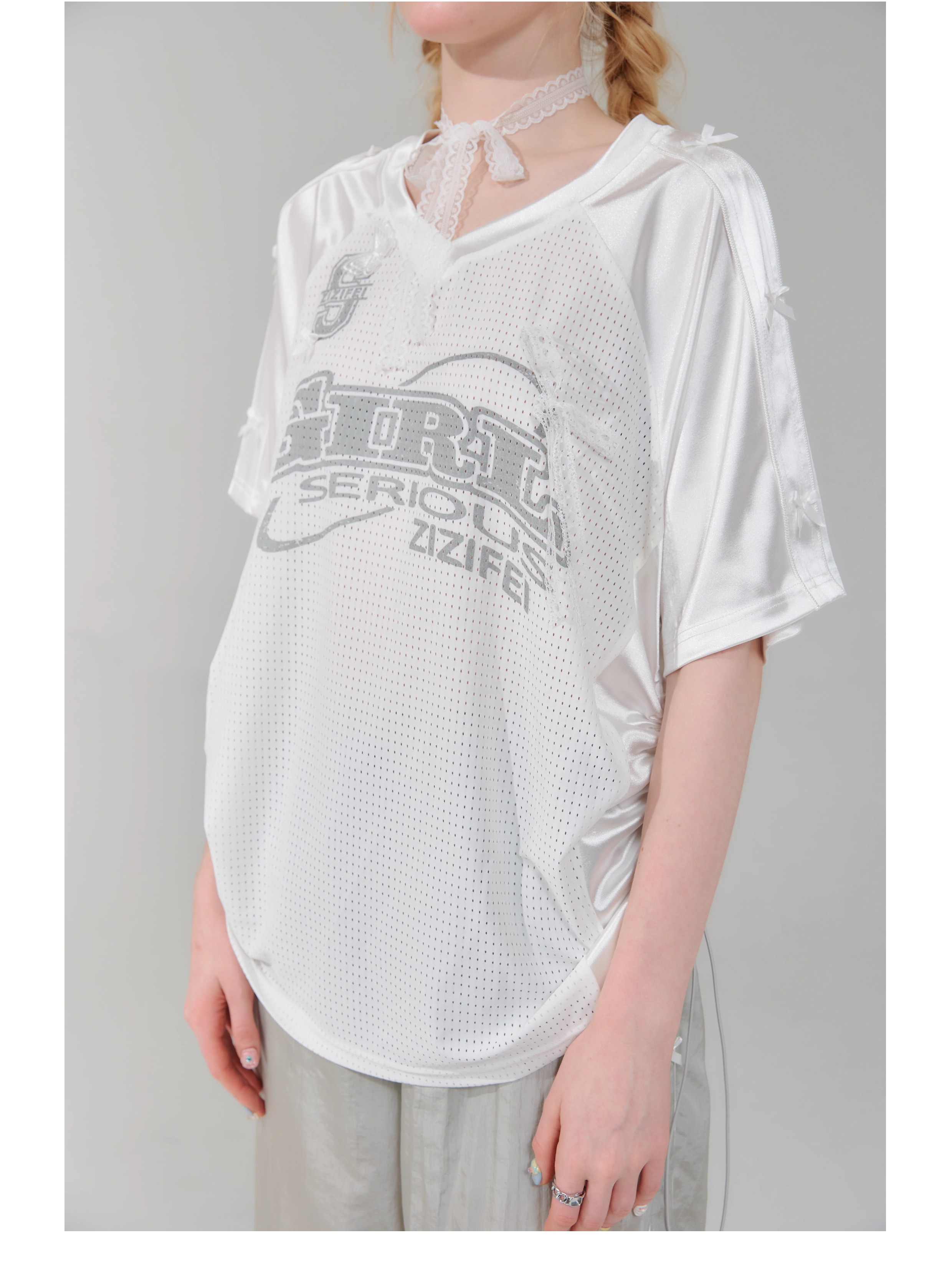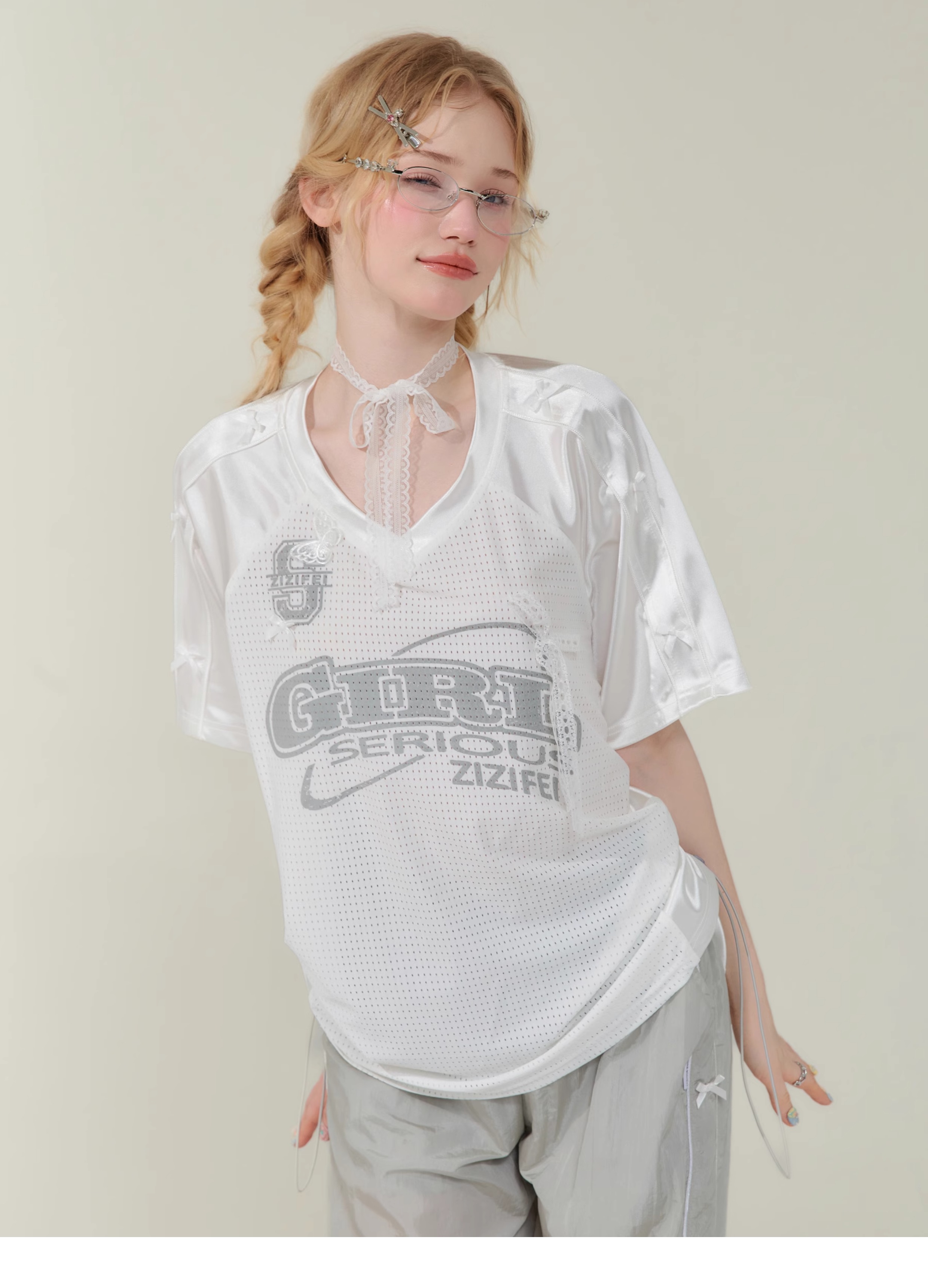 Футболка с V-образным вырезом и бантом с буквенным принтом Fast Dry Sports Design для лета в стиле ретро