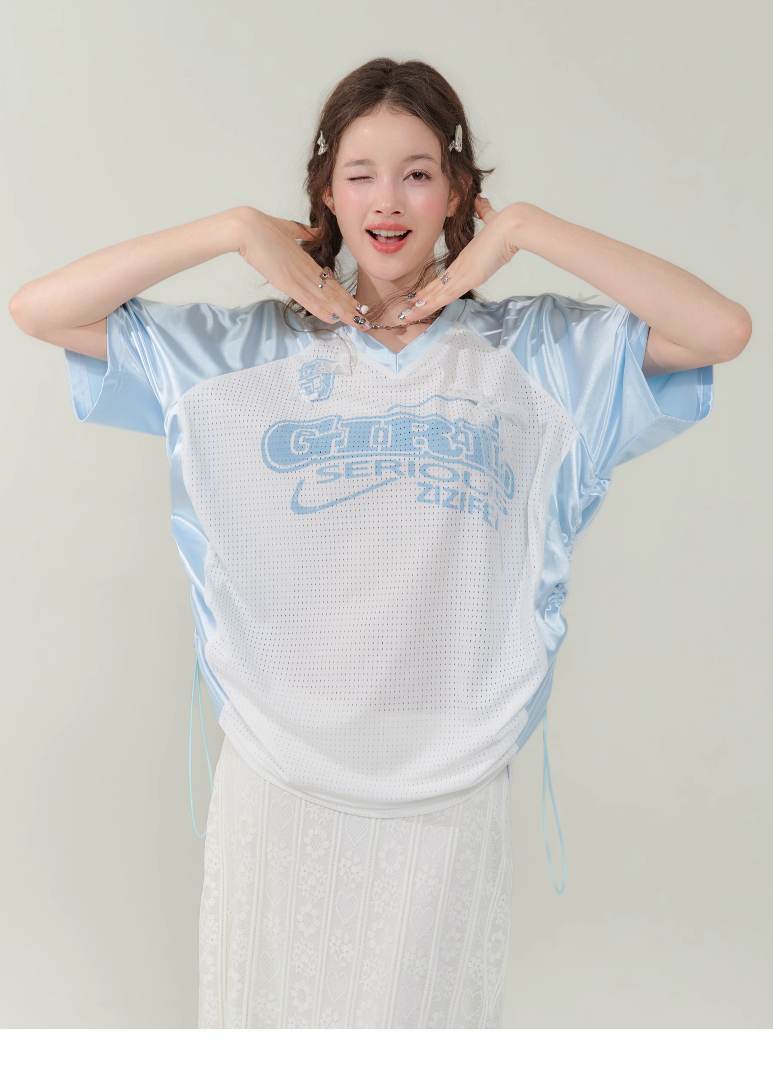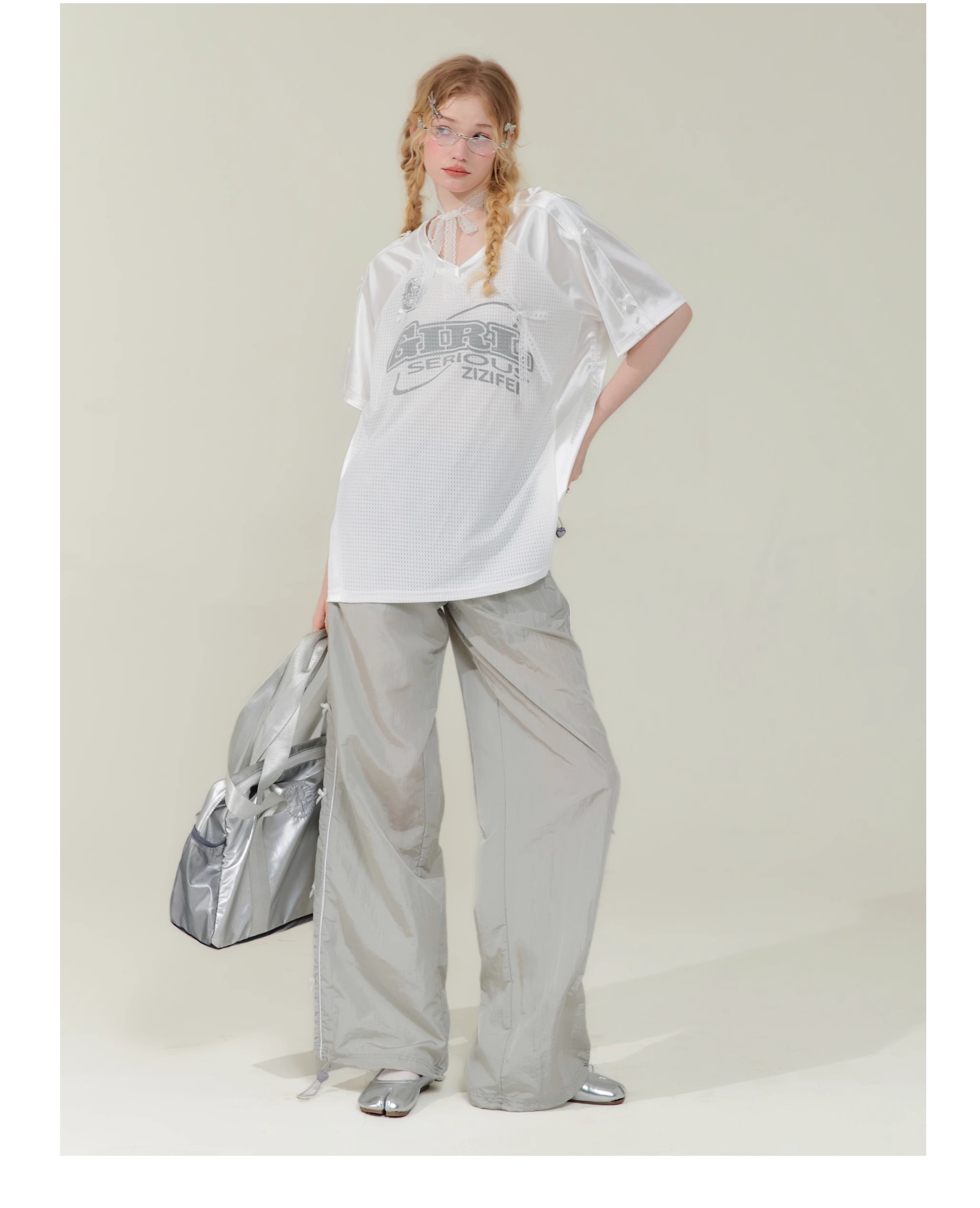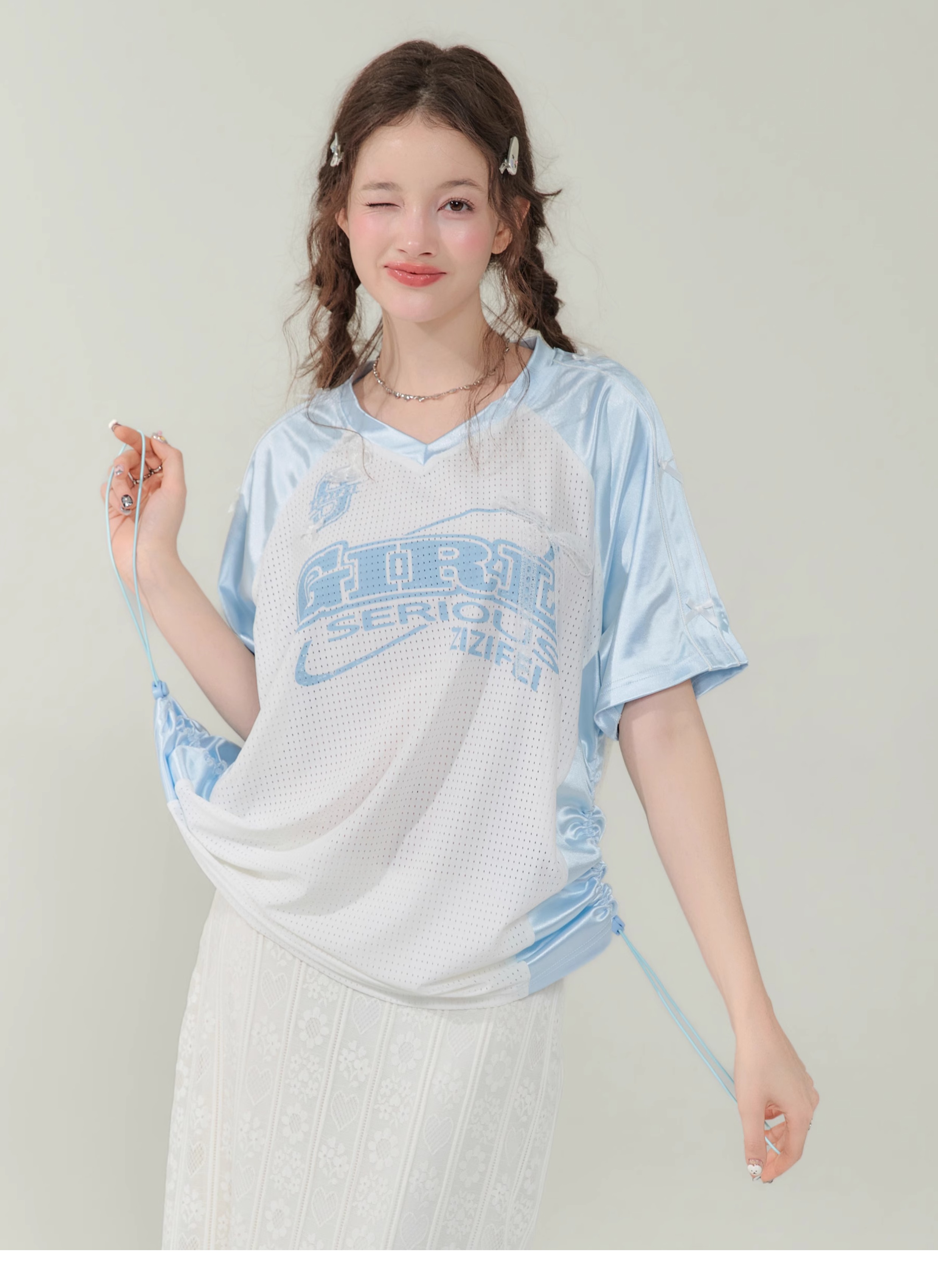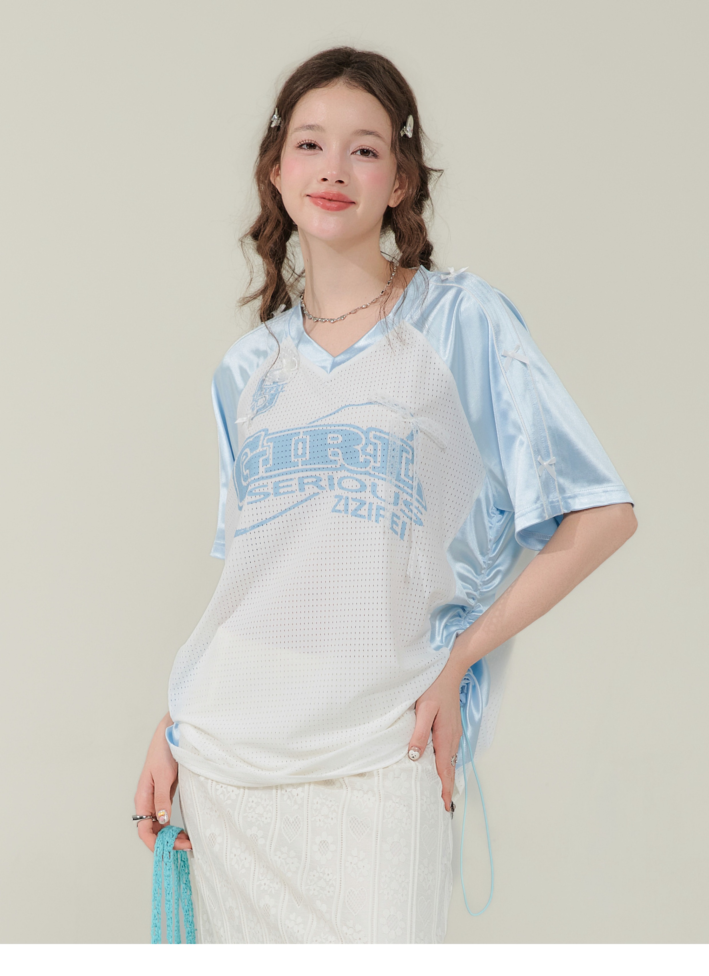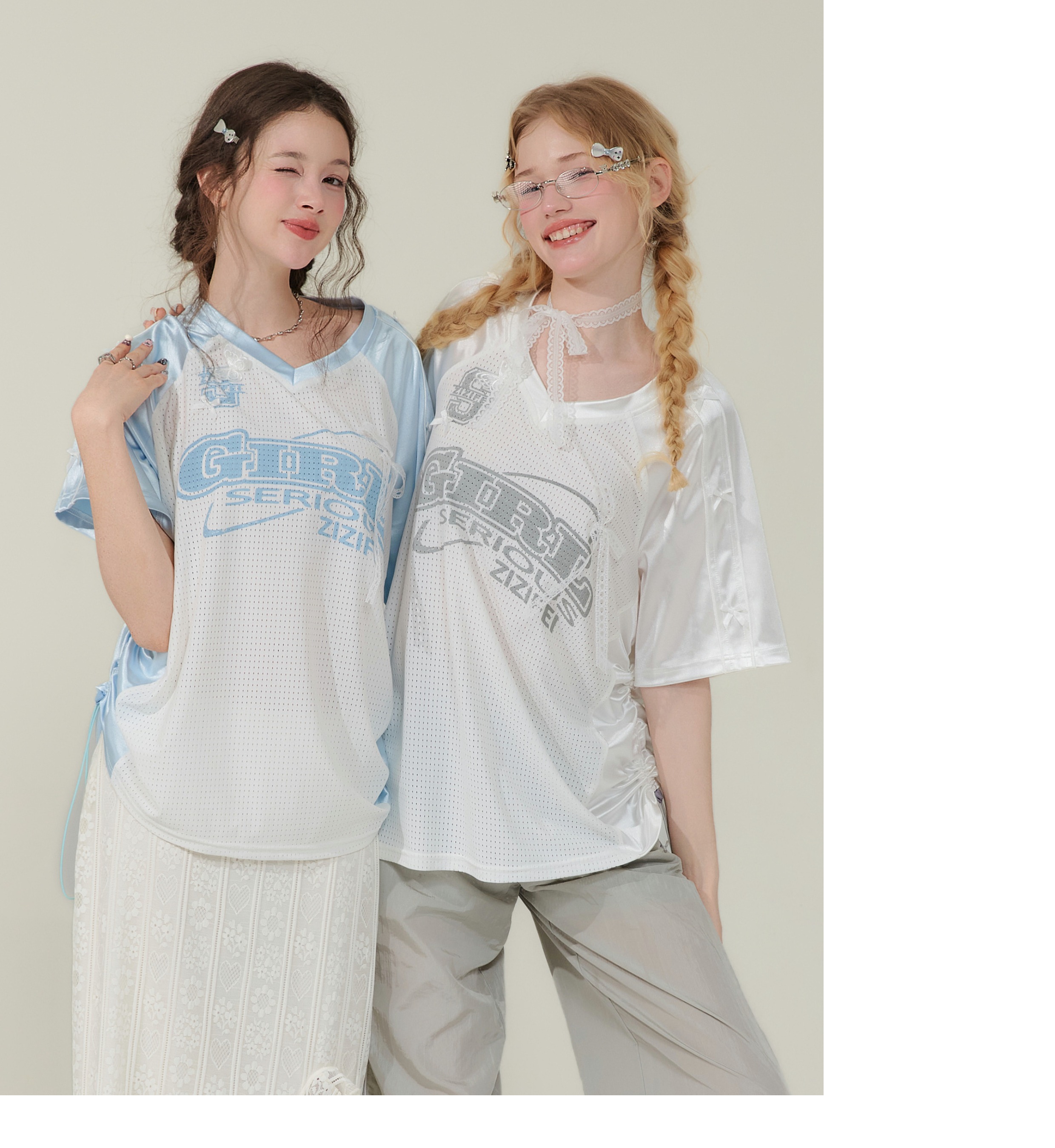 Футболка с V-образным вырезом и бантом с буквенным принтом Fast Dry Sports Design для лета в стиле ретро