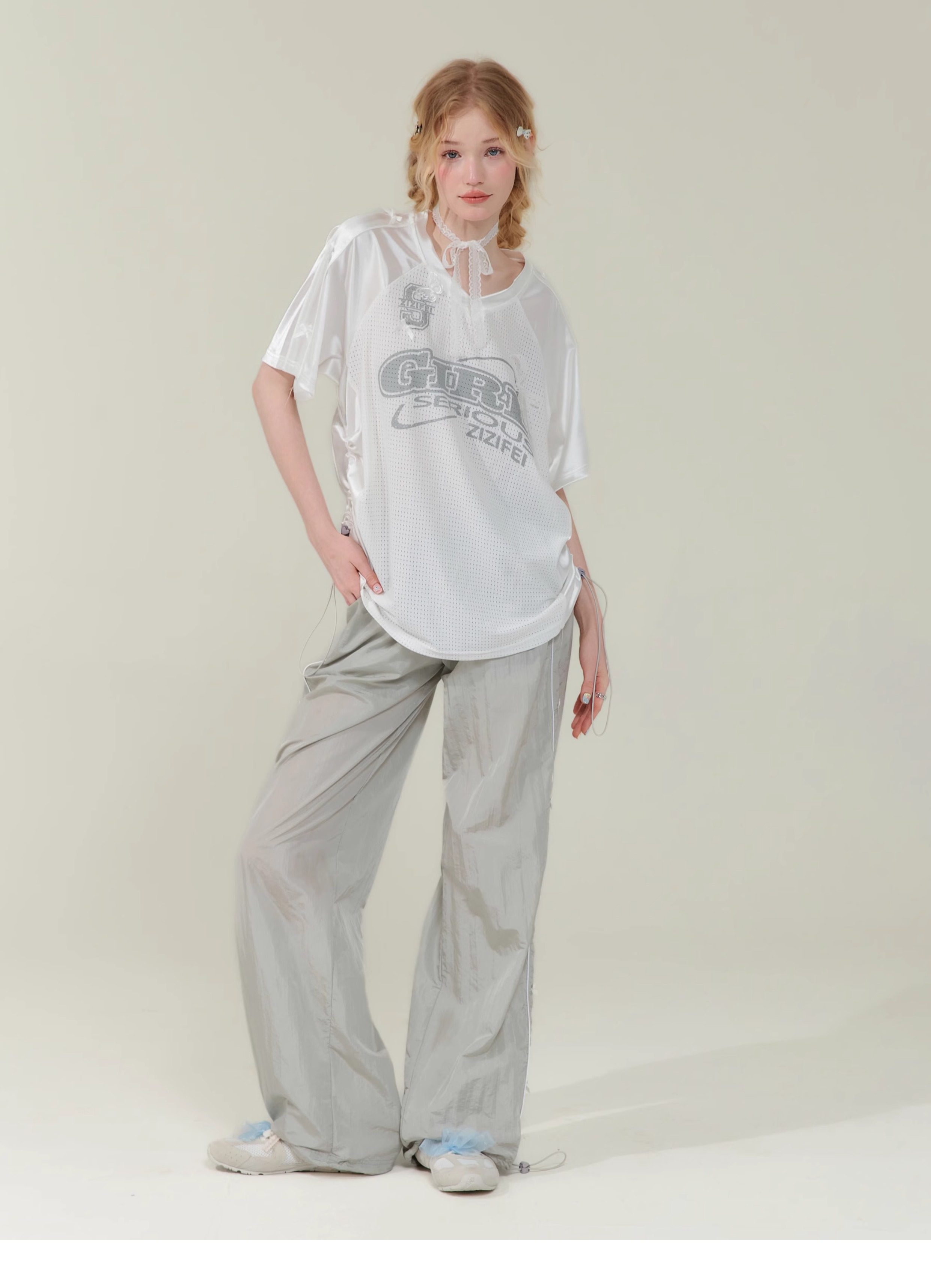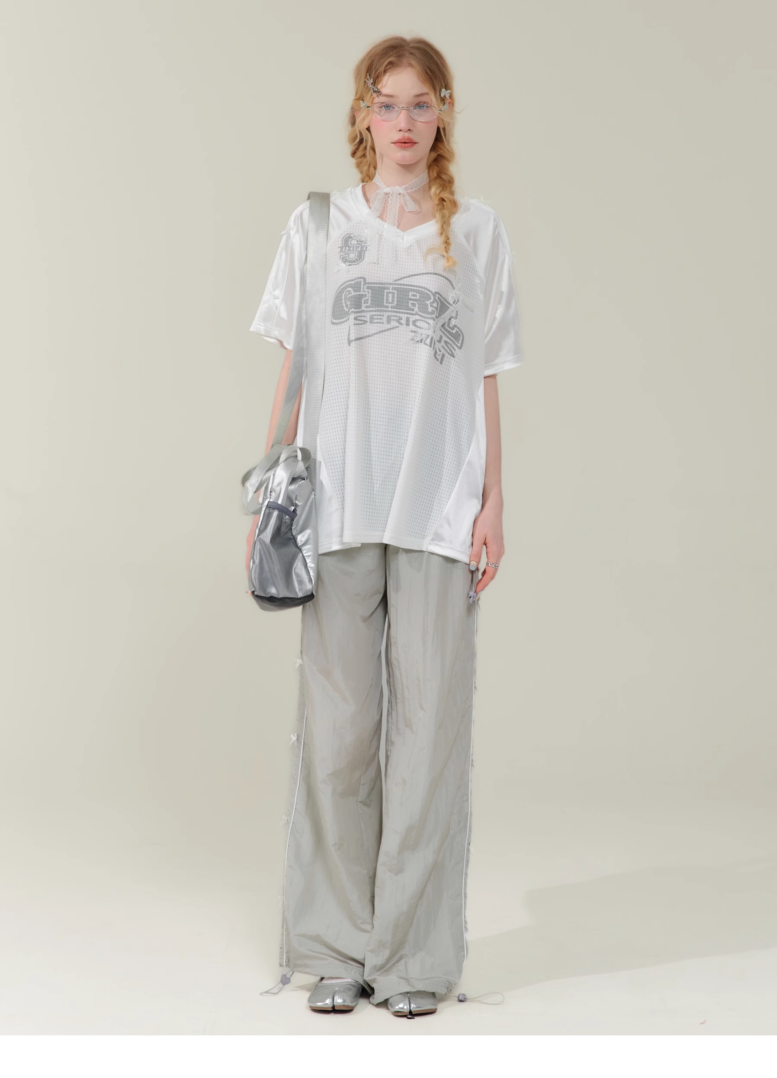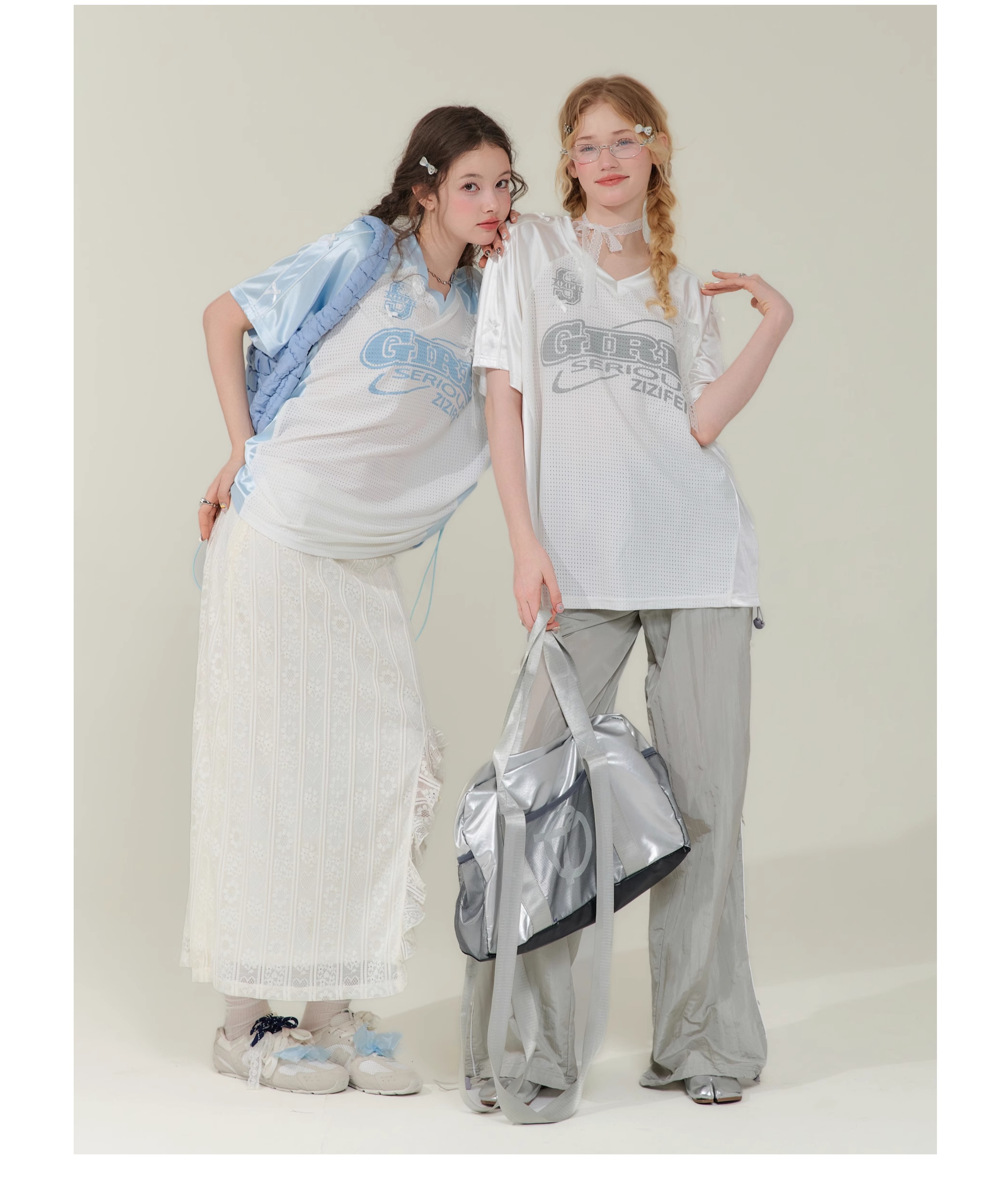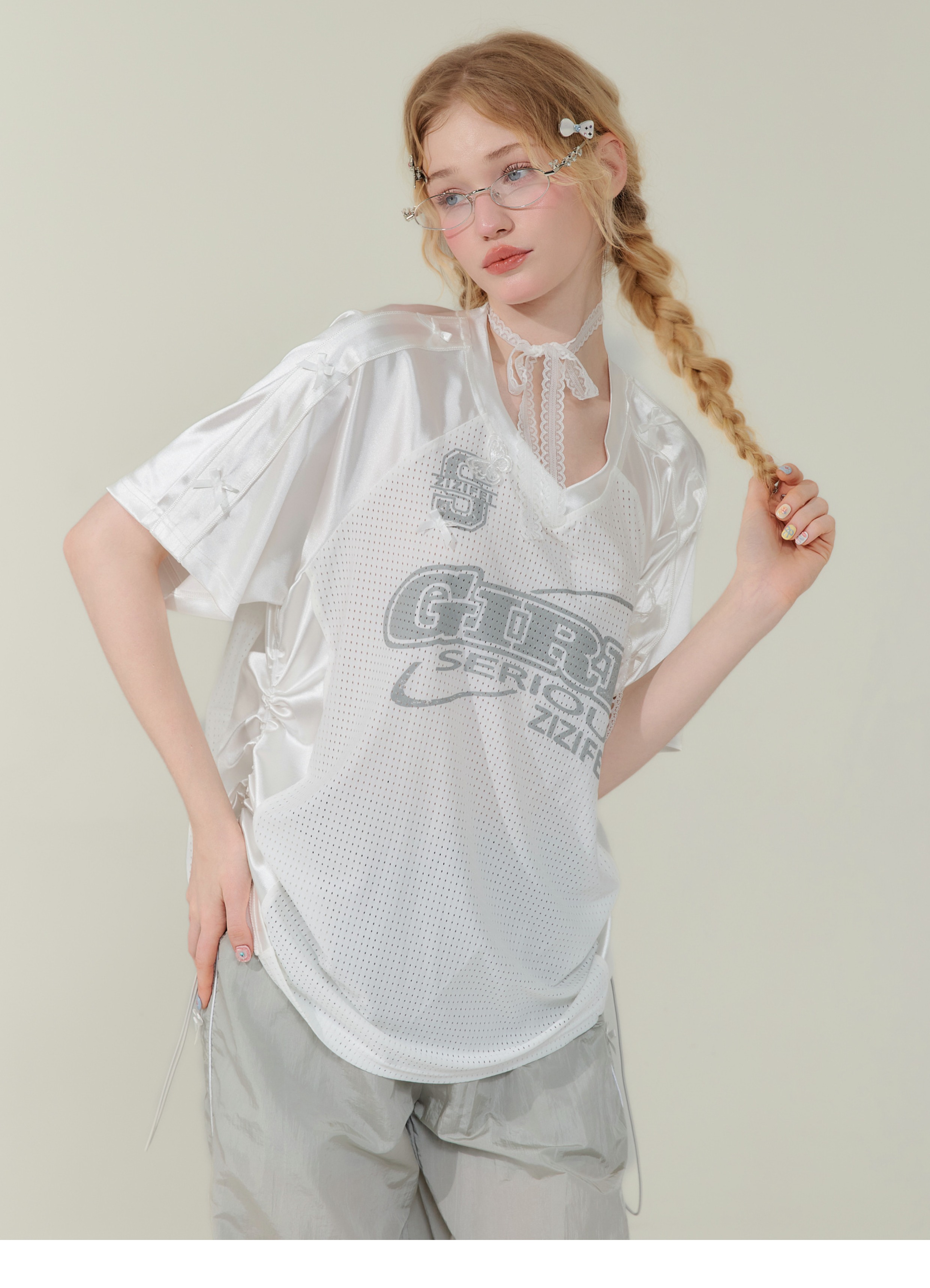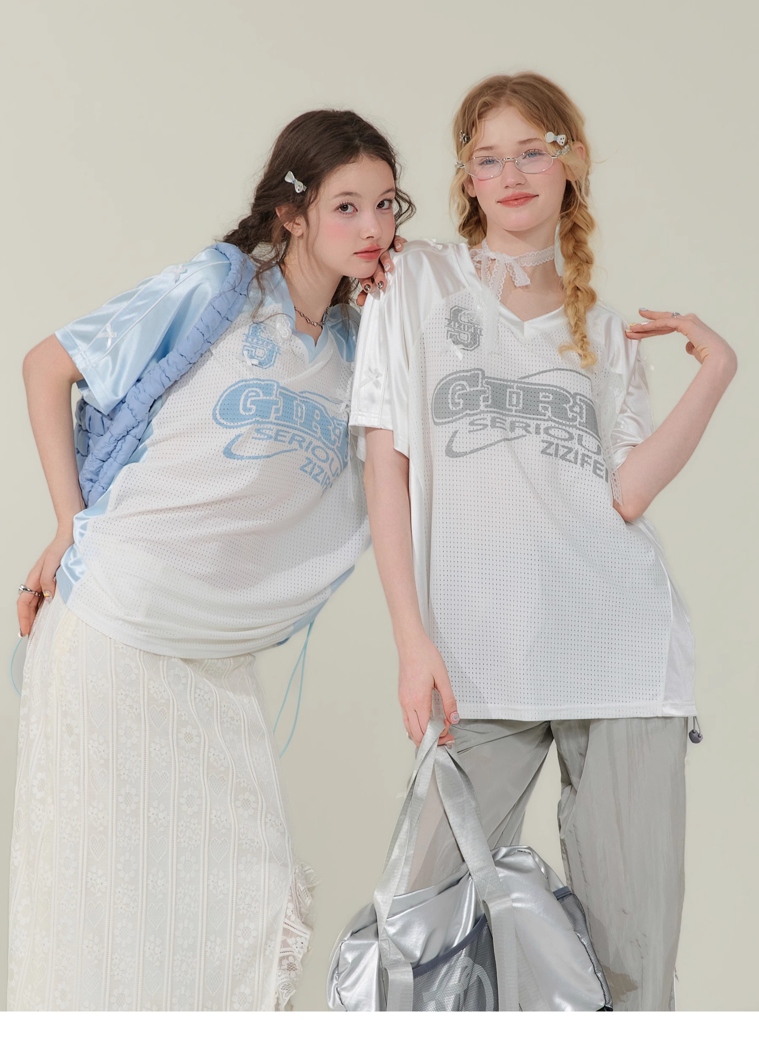 Футболка с V-образным вырезом и бантом с буквенным принтом Fast Dry Sports Design для лета в стиле ретро