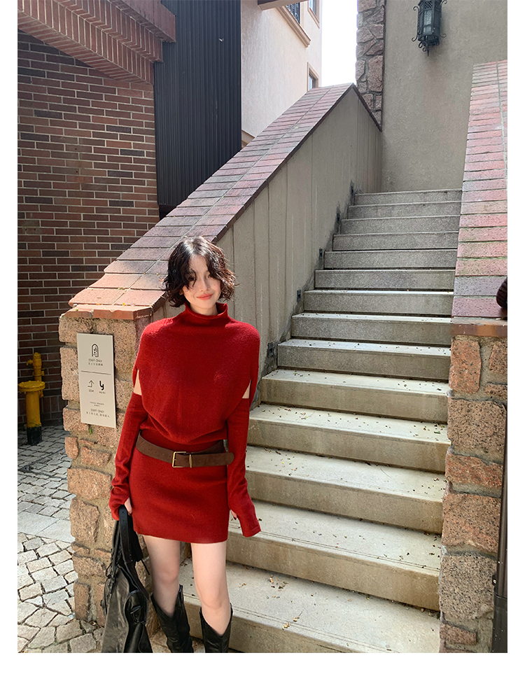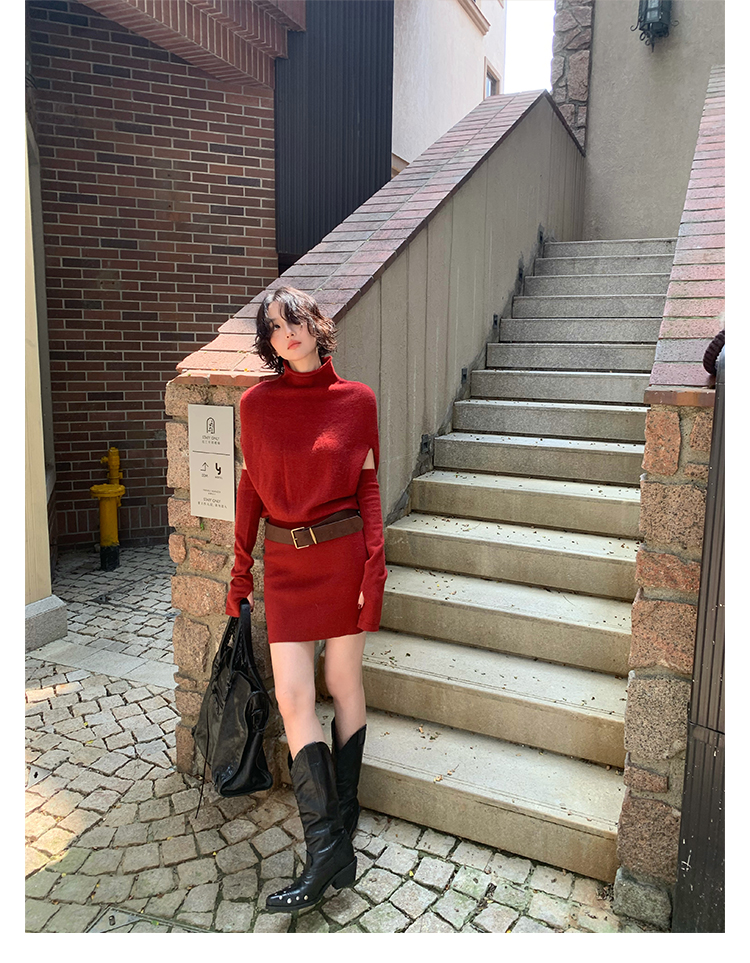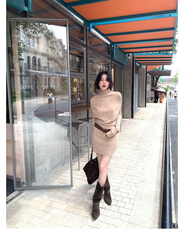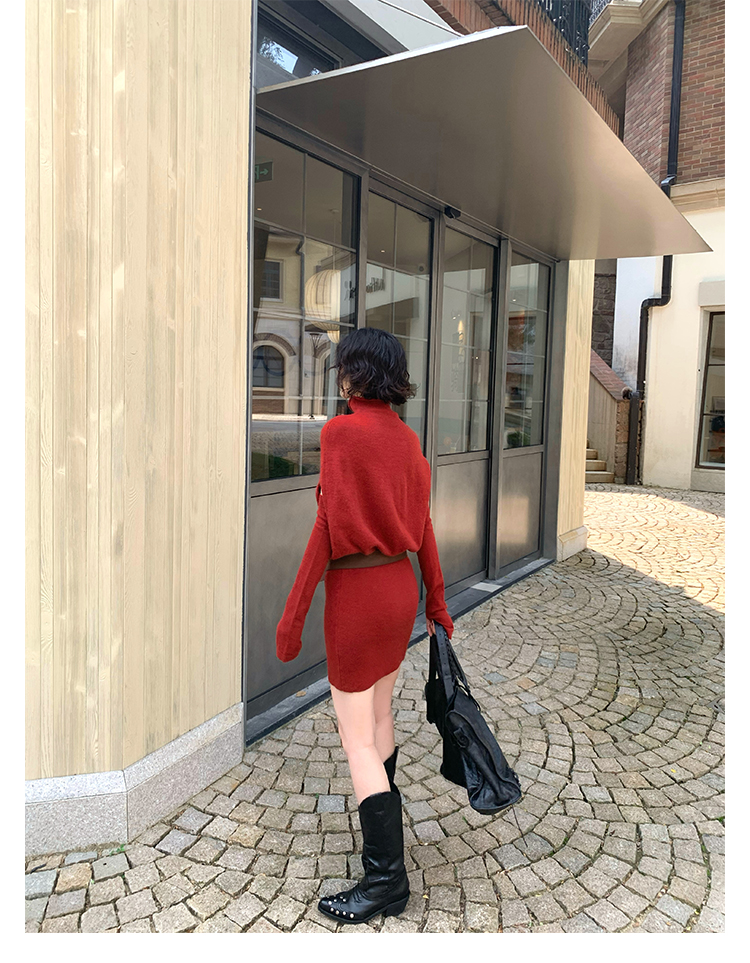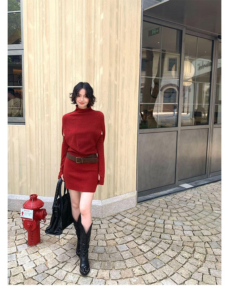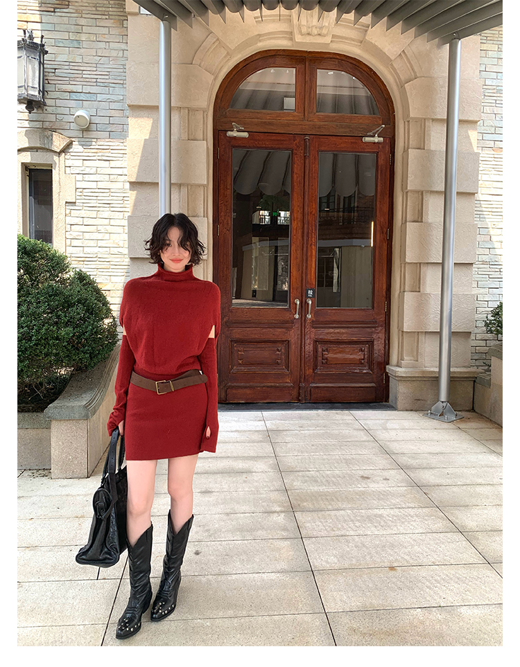 Wine Afternoon Semi-Turtleneck Knit Mini Dress – Retro Fall/Winter 2025