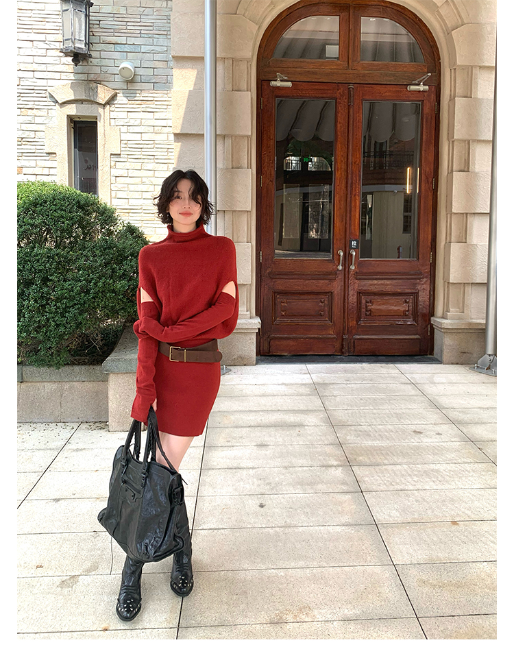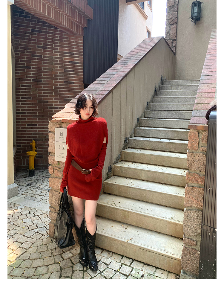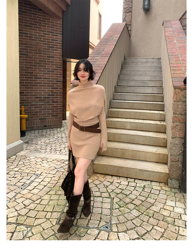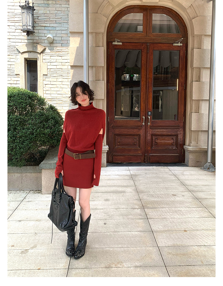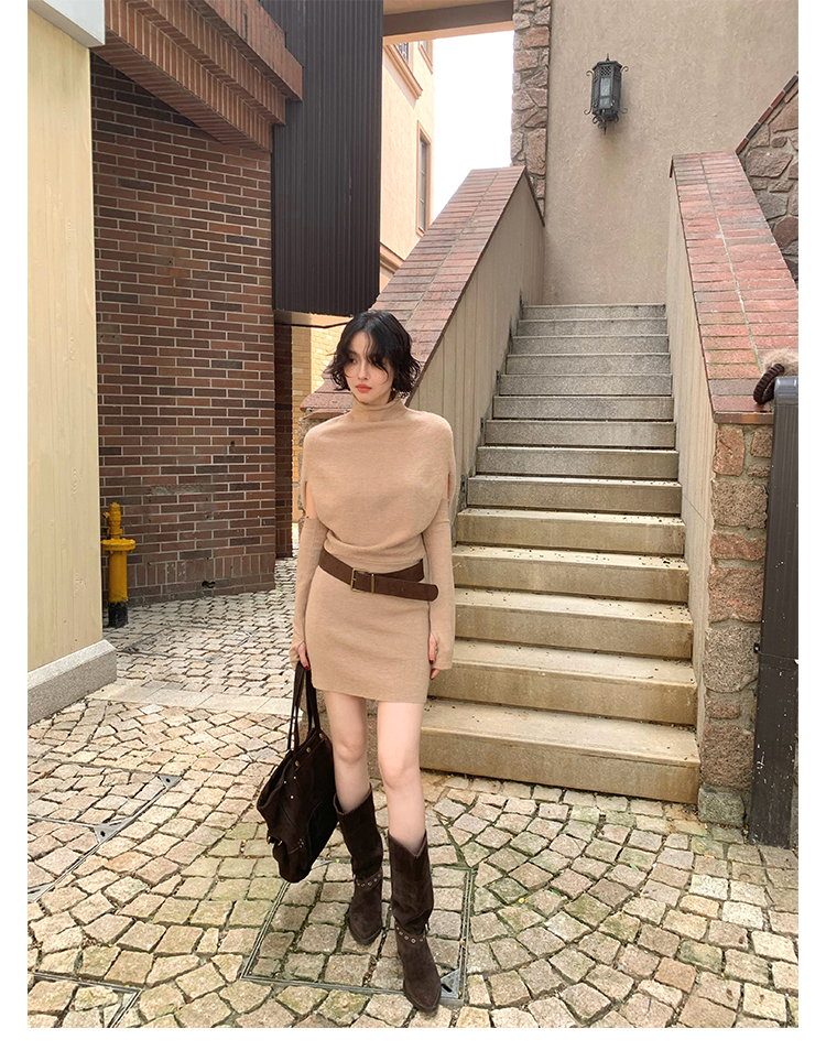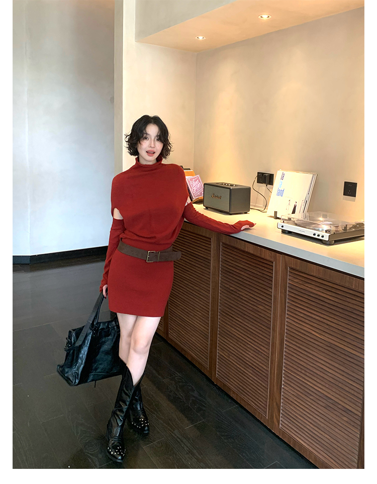 Wine Afternoon Semi-Turtleneck Knit Mini Dress – Retro Fall/Winter 2025