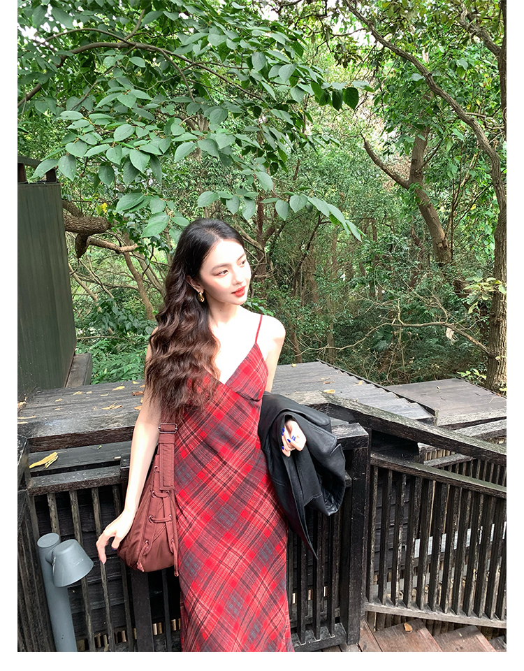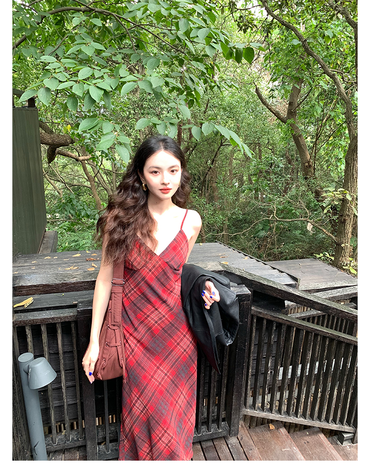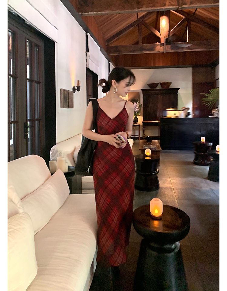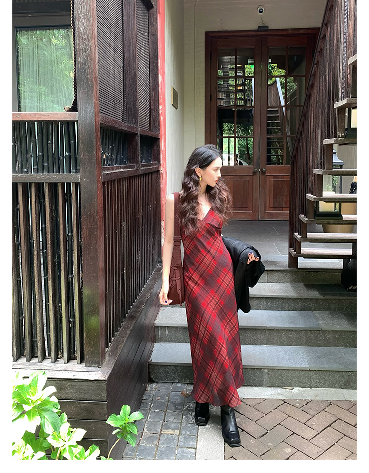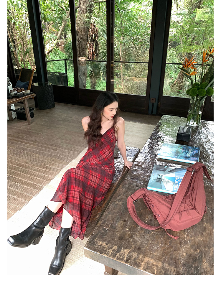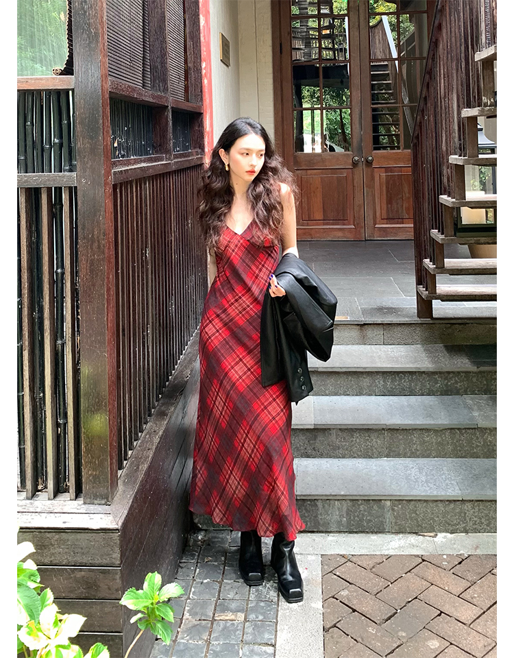 Red Plaid V-Neck Waist-Cinching Slip Dress