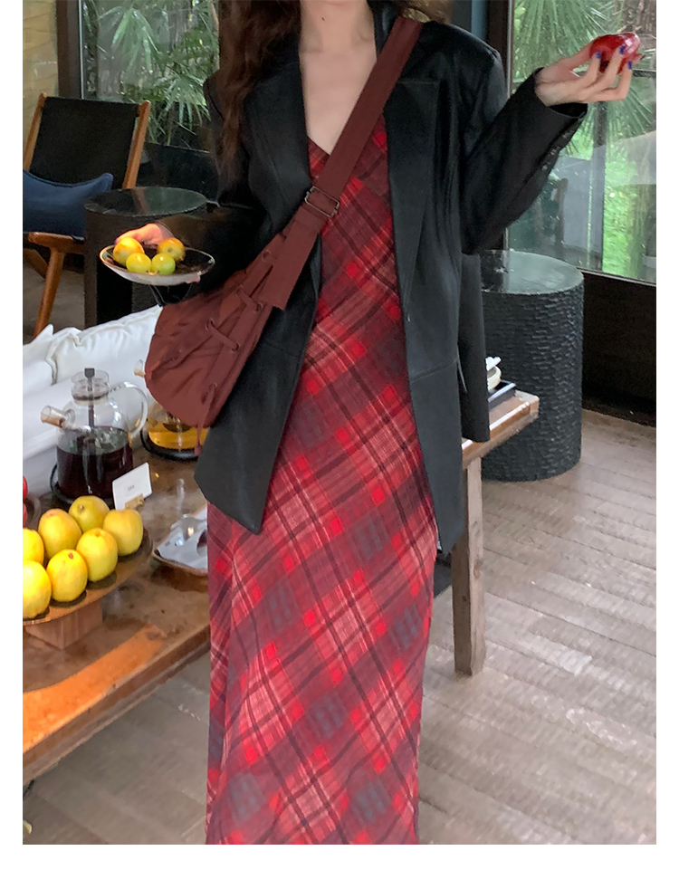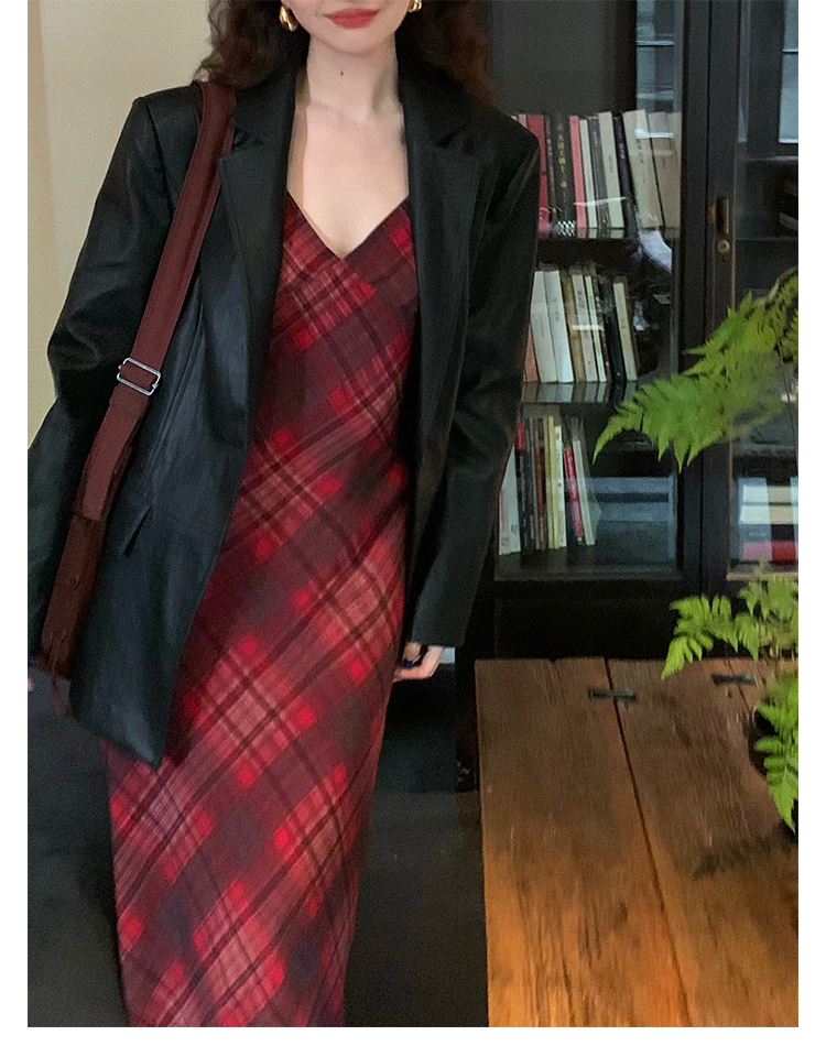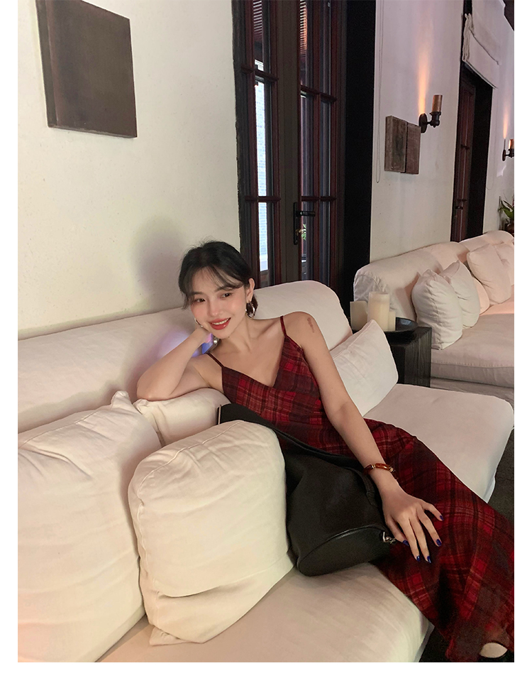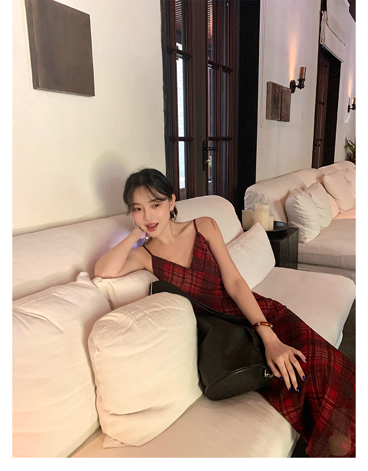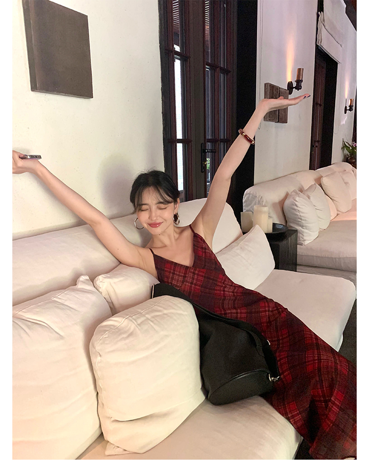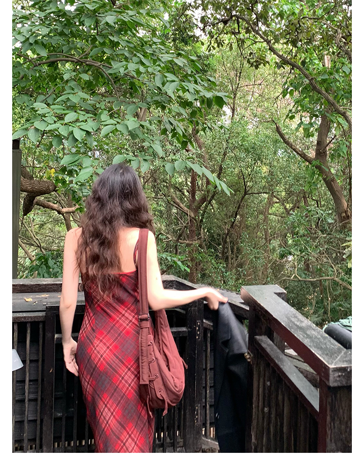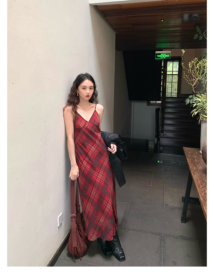 Red Plaid V-Neck Waist-Cinching Slip Dress