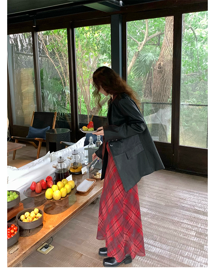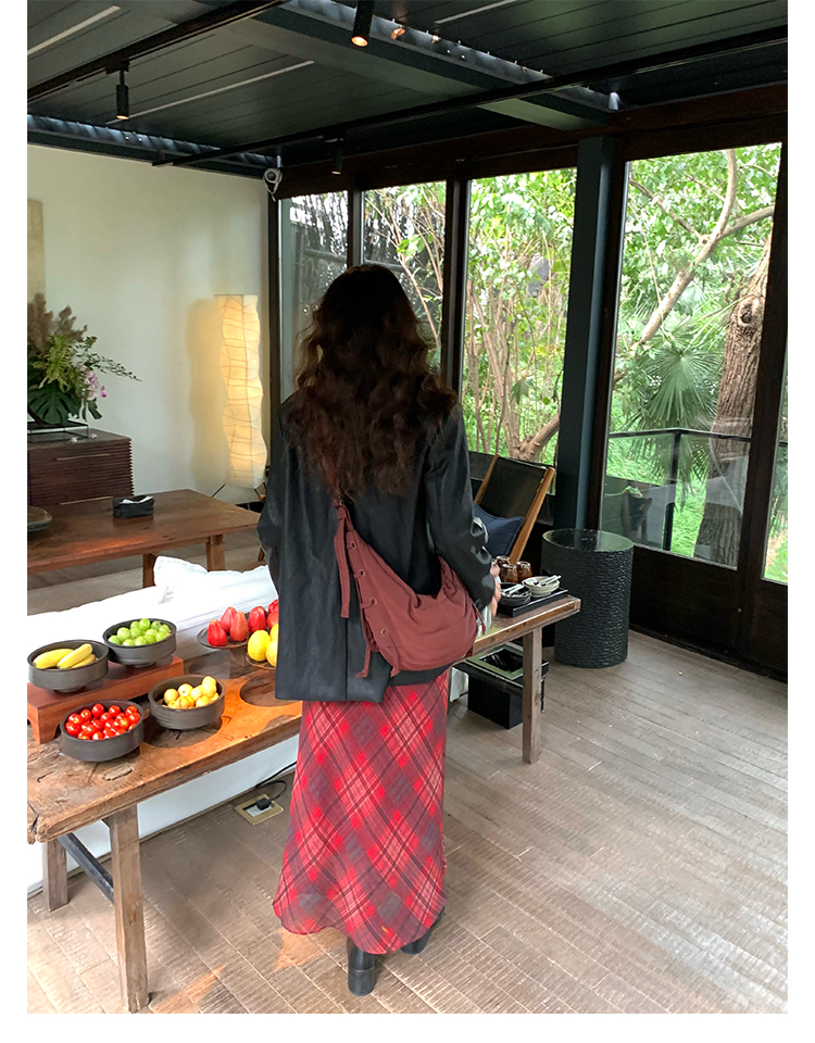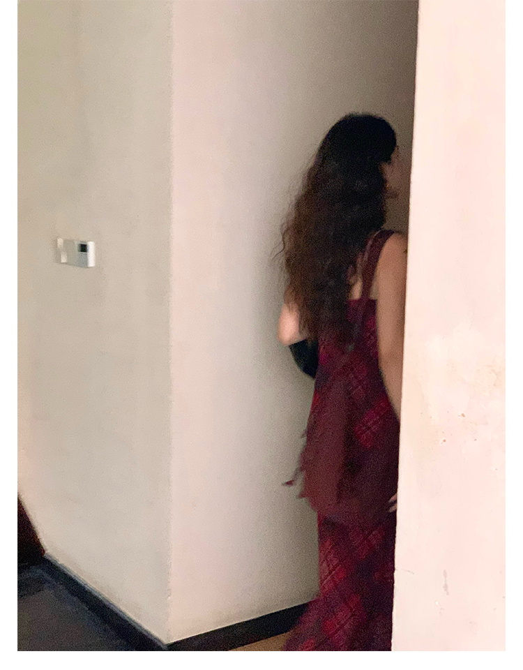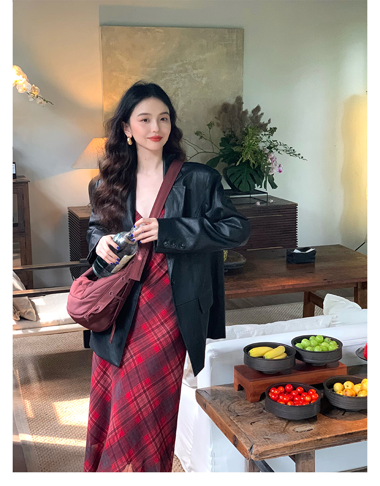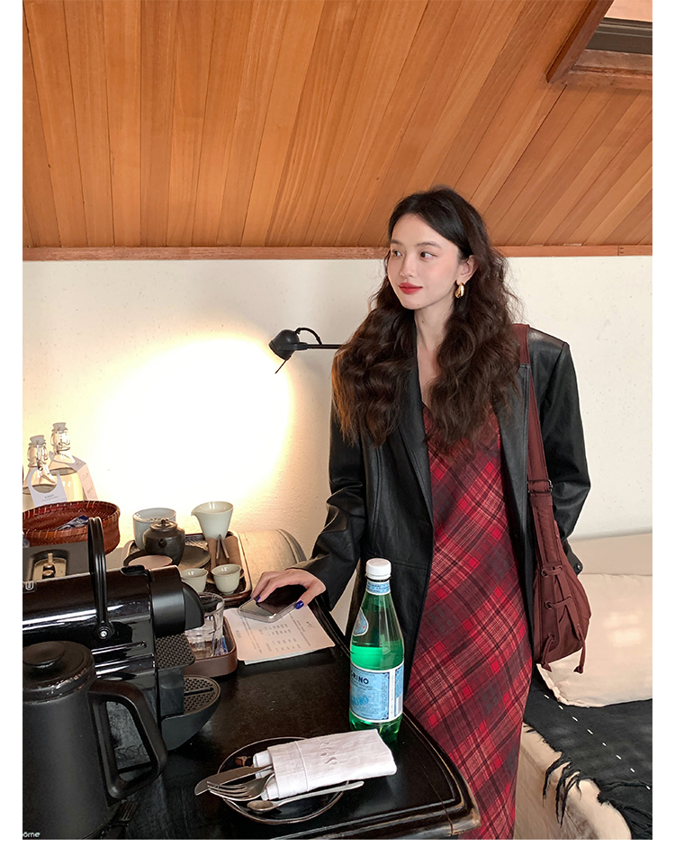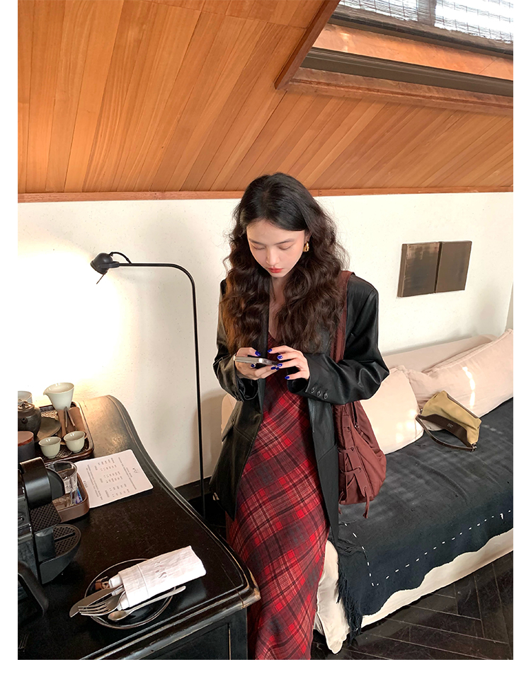 Red Plaid V-Neck Waist-Cinching Slip Dress